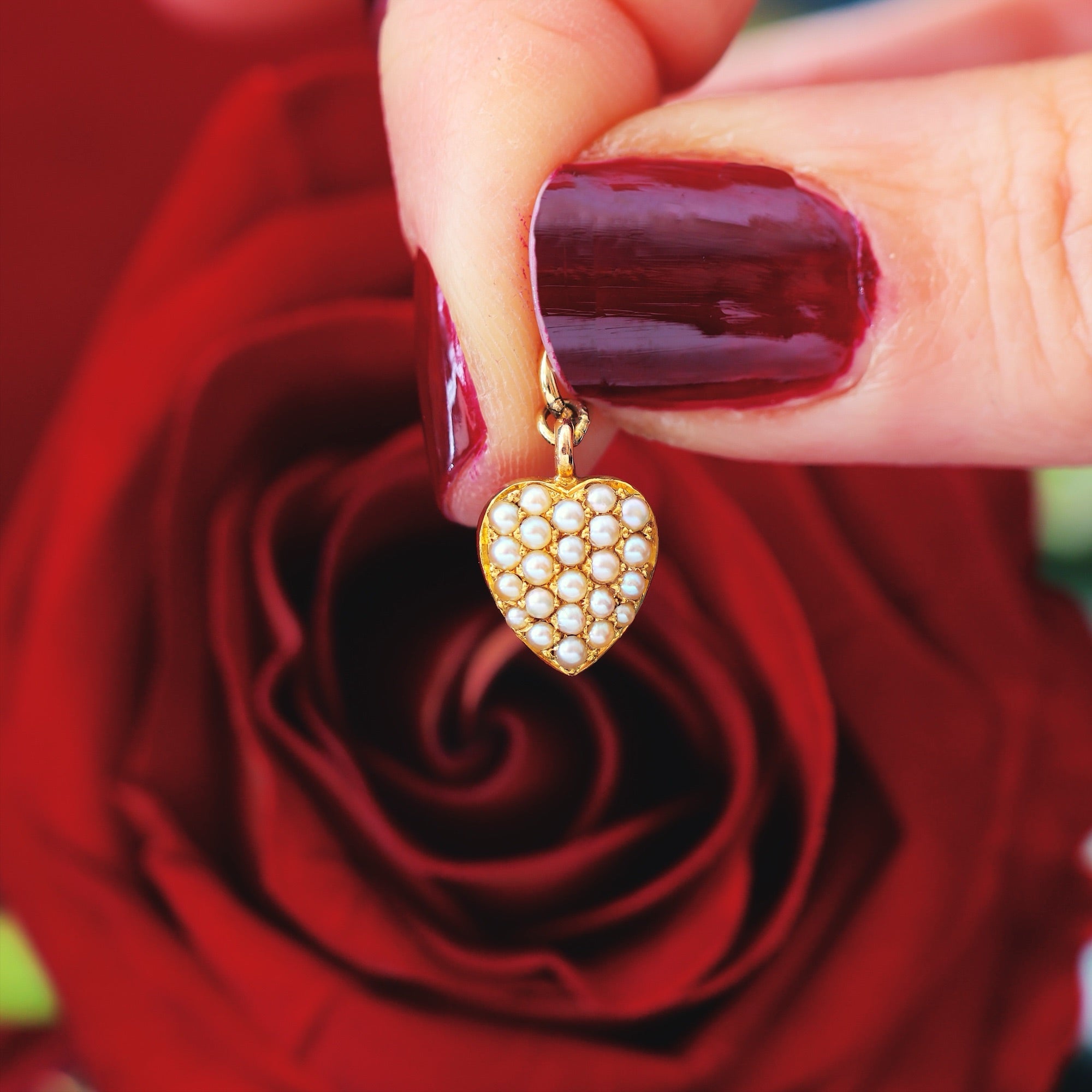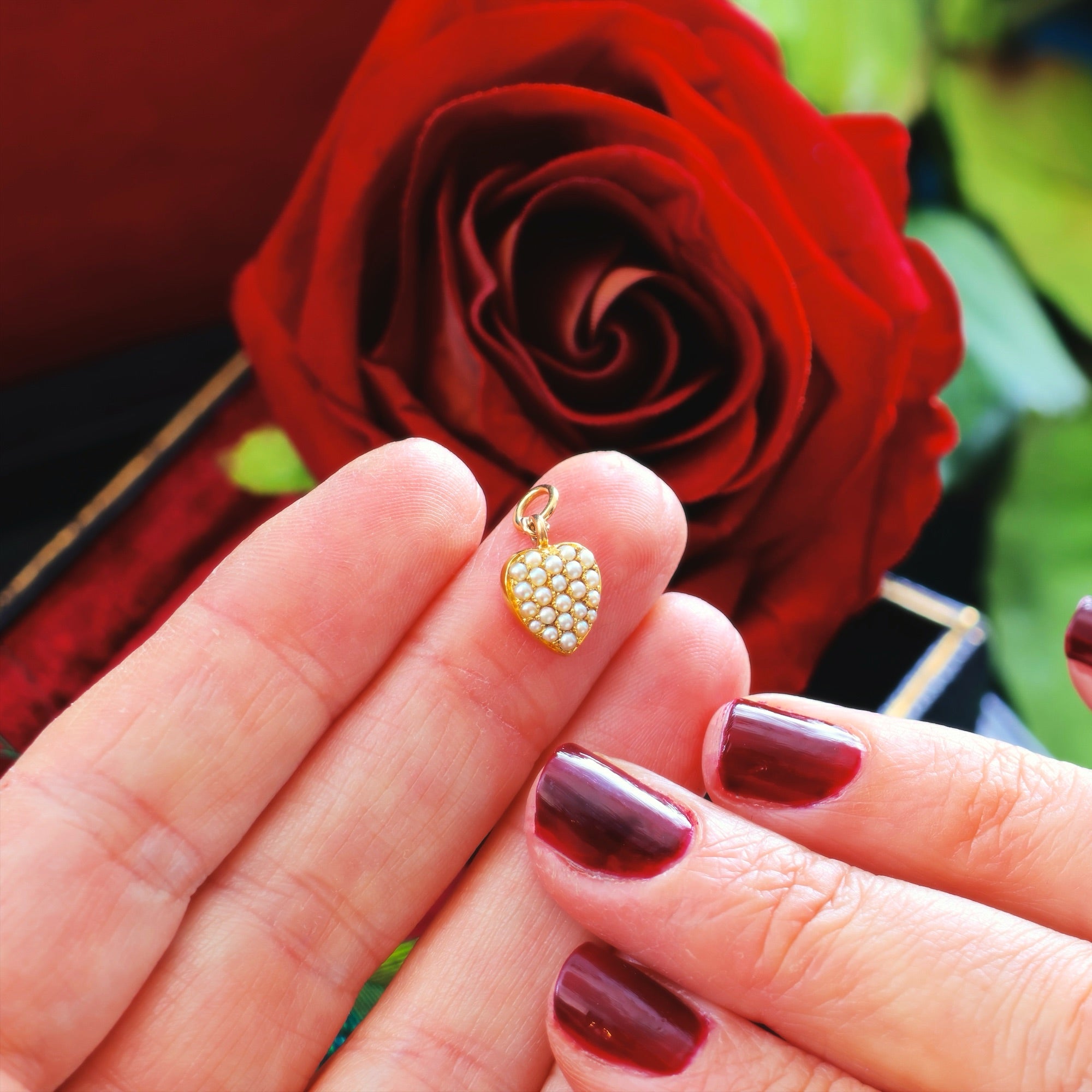 Circa 1890's an antique loveheart shaped 15ct Gold and wild Sea Pearl charm or pendant, perfect as a keepsake reminder of the beauty of love. Hand set with great care, the lustrous prettiness of these mini Pearls is so charming; a delicate oyster pink/grey shade reflecting the inside of the original shell...