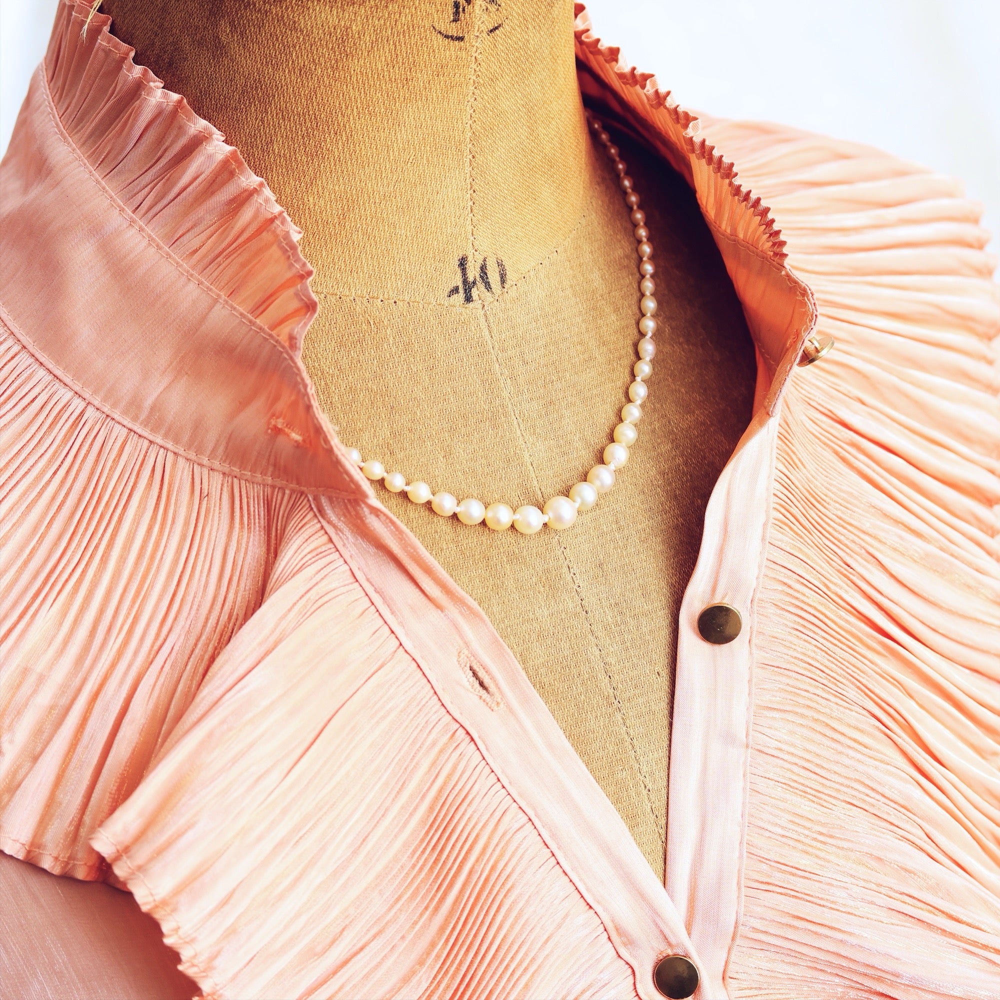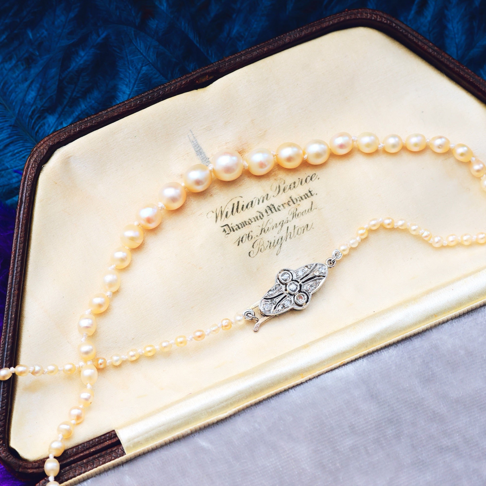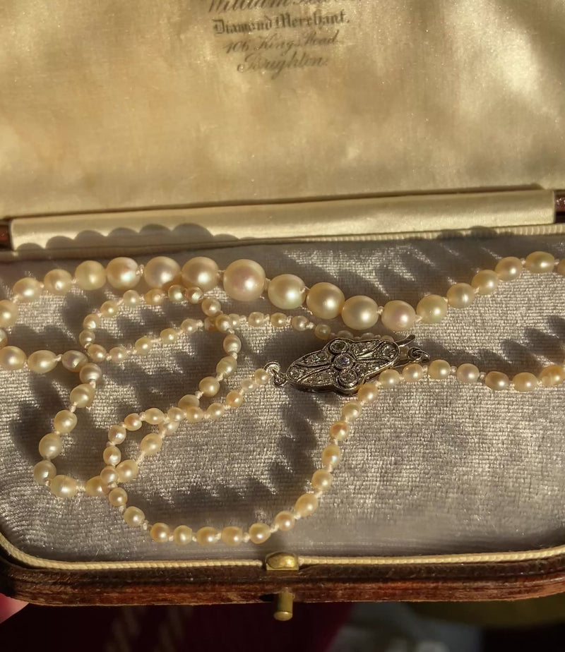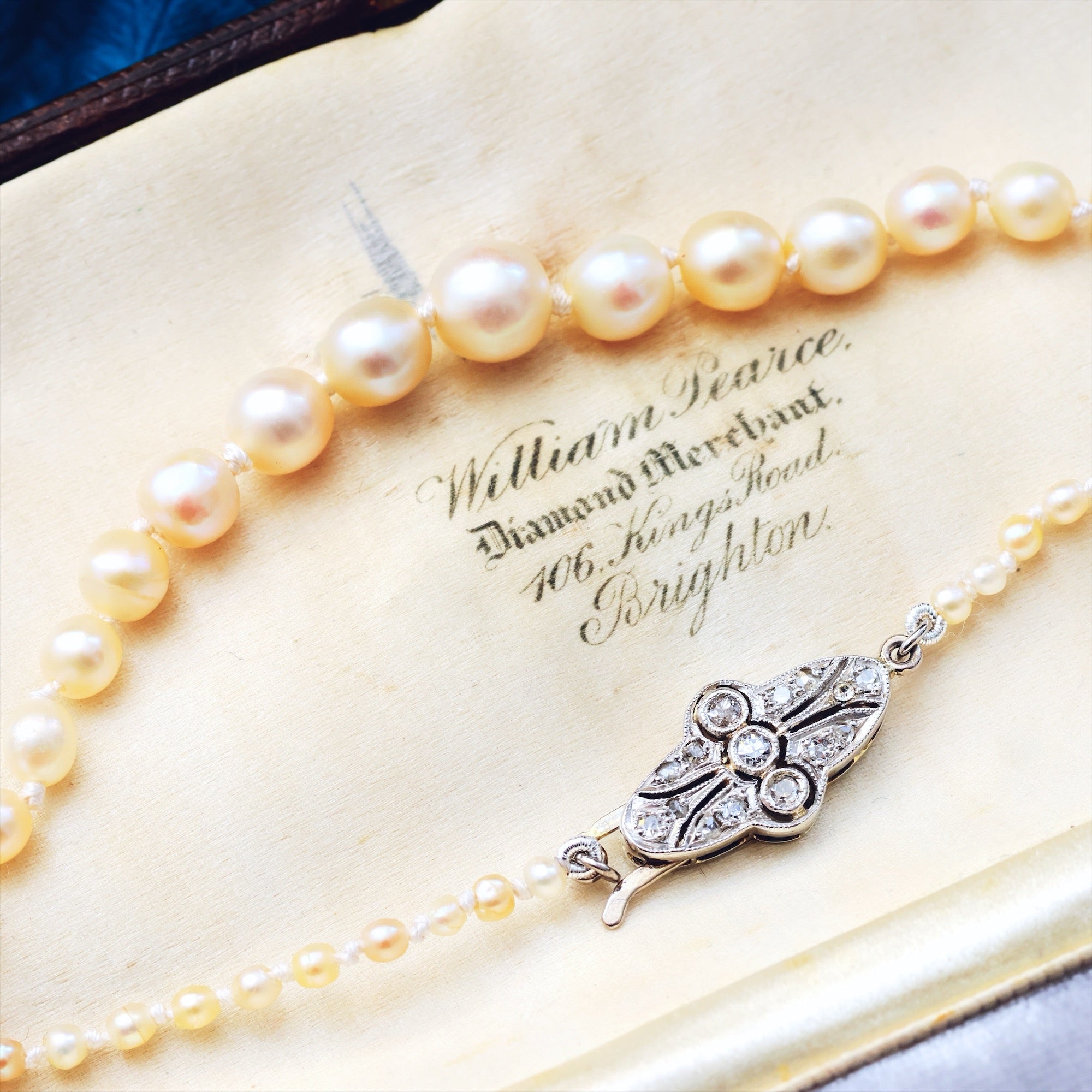 The necklace measures 16 inches in length and the Pearls graduate in size from 2.1mm to 6.9mm. Hand knotted each bead, they are presented in an antique box alongside the report from Gem Lab confirming that they are of Natural Saltwater origin. Read further on the subject of Natural Pearls here.