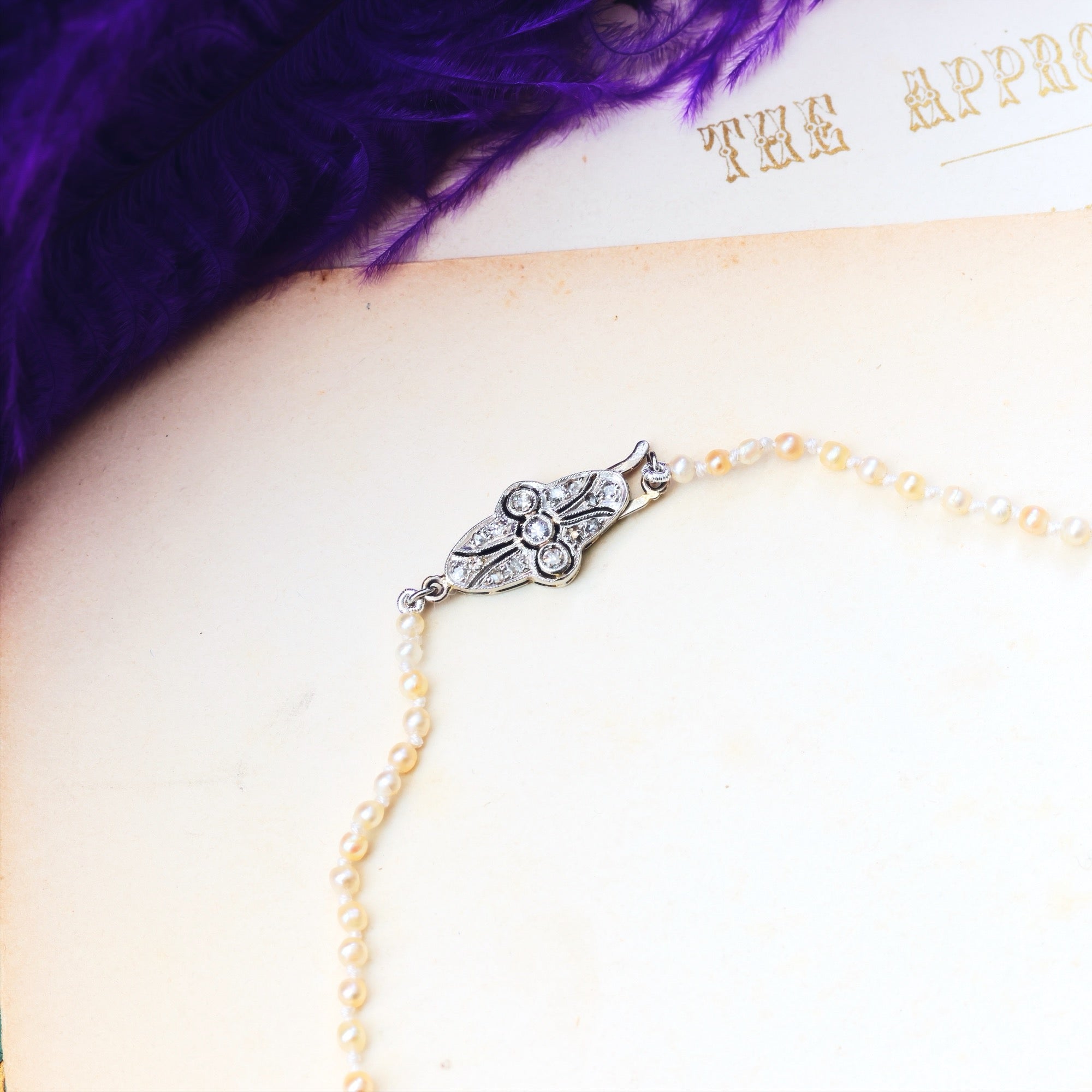 The necklet fastens with an exquisite 18ct Gold and Platinum Art Deco styled clasp with an integral fish hook safety clasp set with 15 small Diamonds.