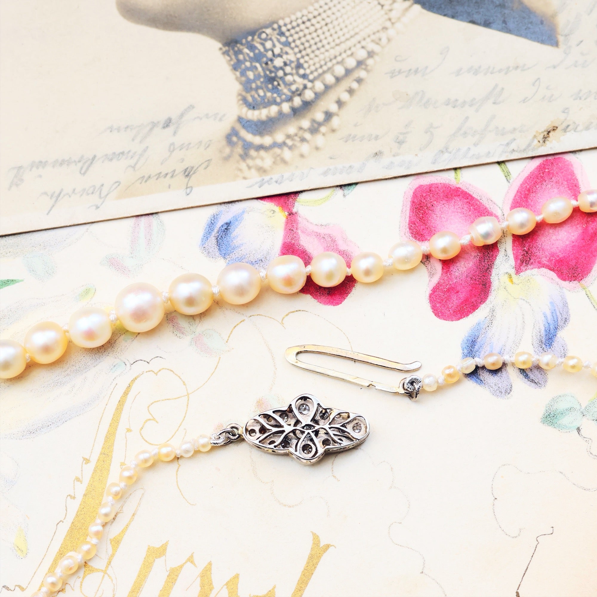 Circa 1900, a scarce antique necklace of 98 rare hand drilled natural Saltwater Pearls strung as a classic necklet gently graduated in size to flatter and elongate the neck beautifully. Of superior roundness and lustre, these rare creamy hued beauties were so desired and sought after in their day (before the advent of the Pearl culturing process), and they would have been hand dived, with just one Oyster in 10,000 producing a Natural Pearl and as such being both time and resource intensive to gather.