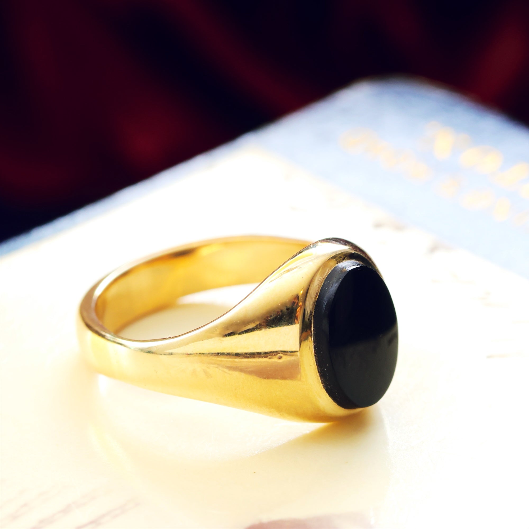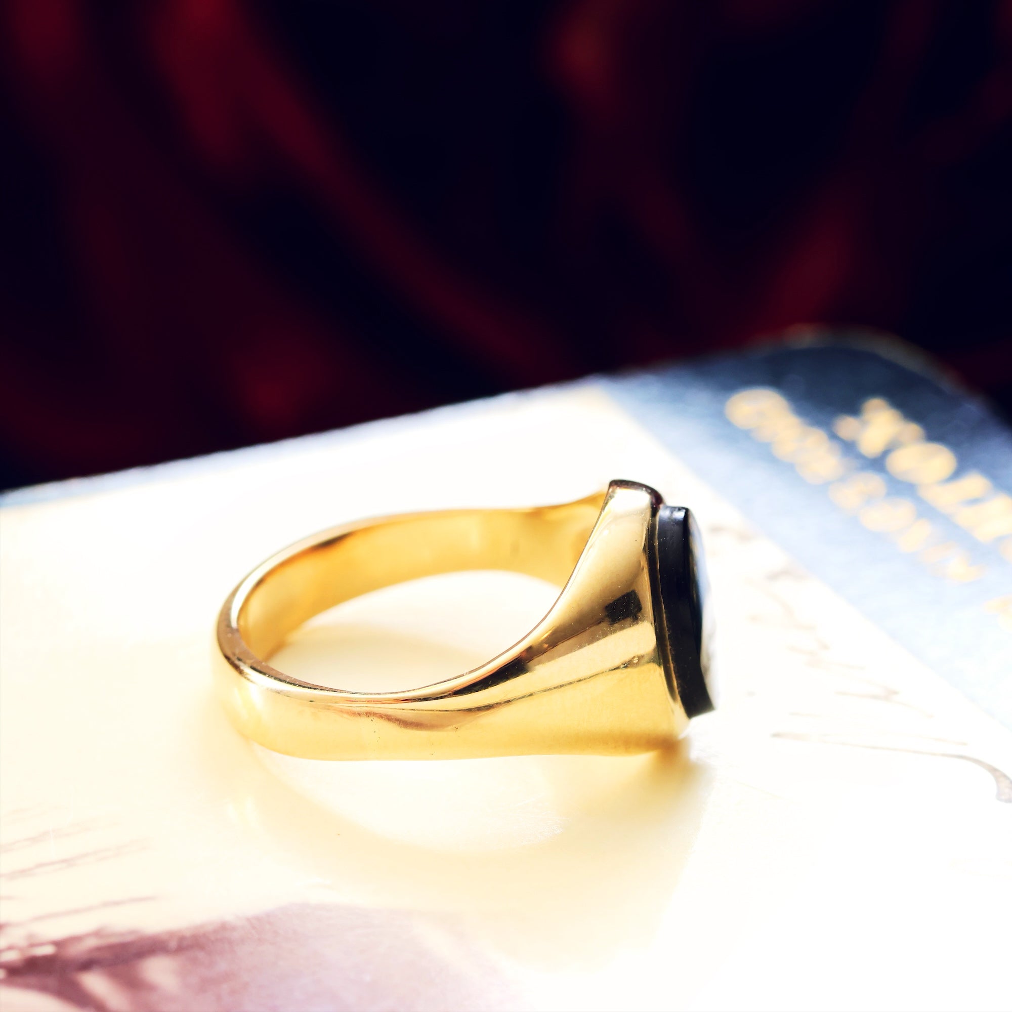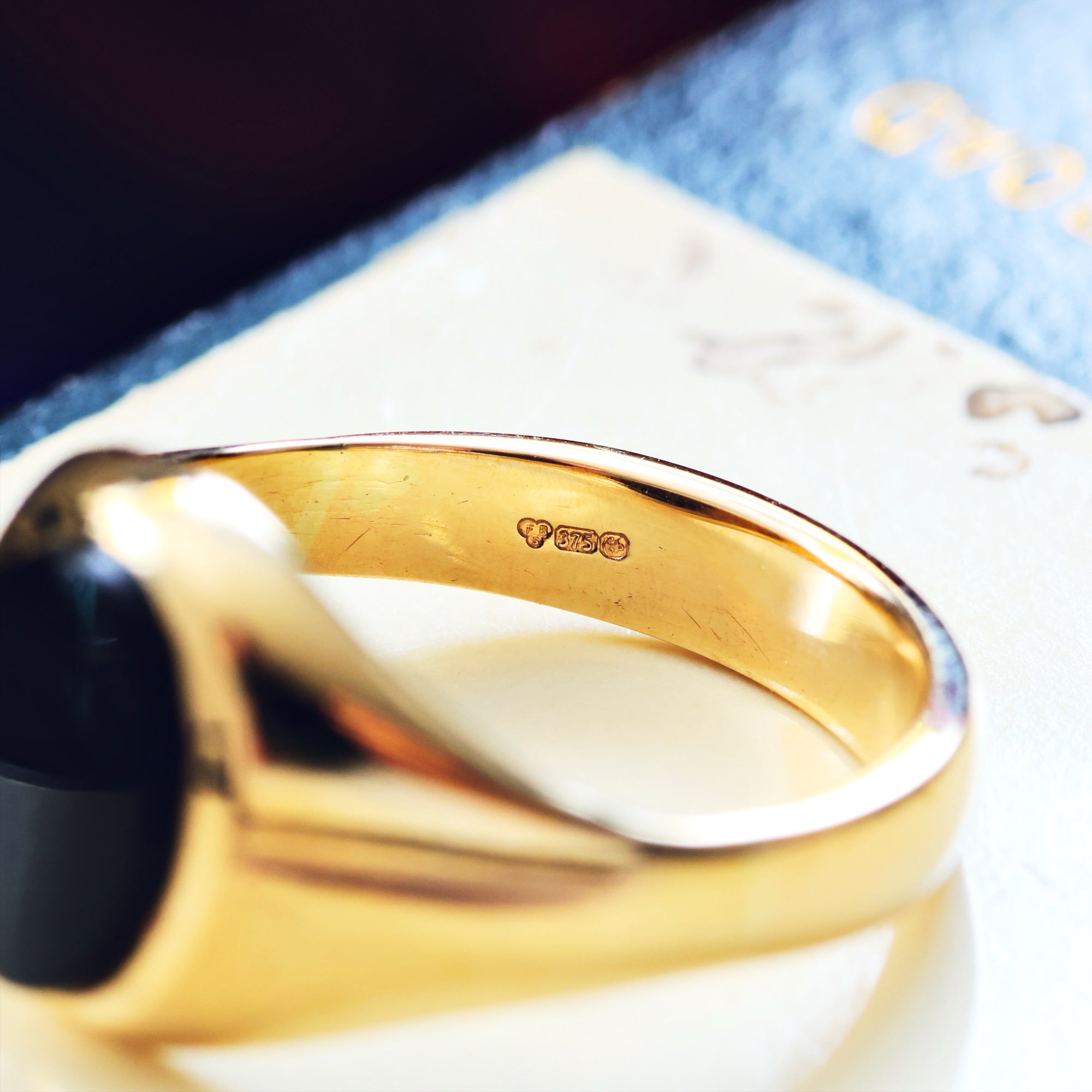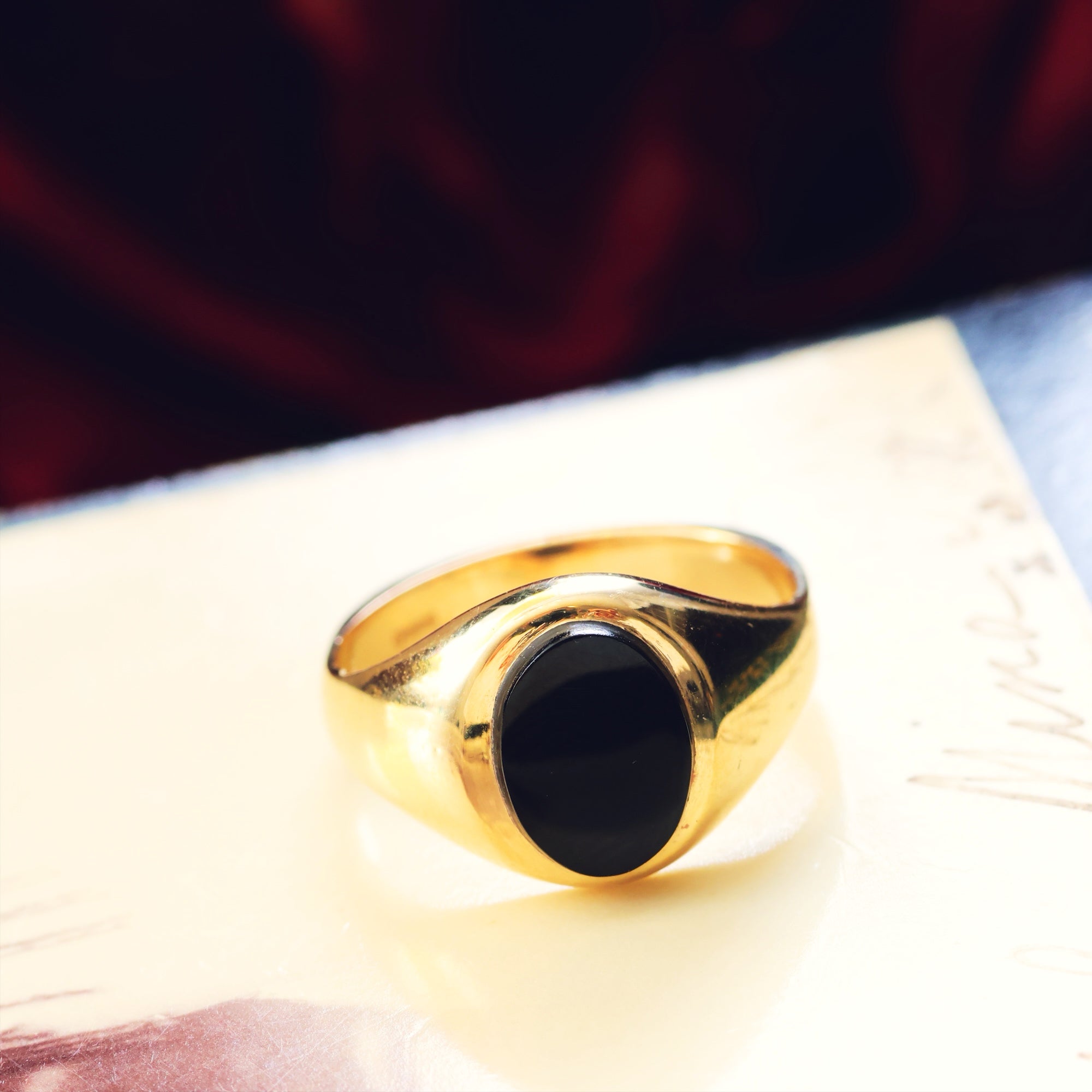 Ideal for a pinky finger this cute little 9ct Gold signet ring is the perfect finger trim as the oval shape of the classic Black Onyx is so flattering to the hand. With a streamlined gleam to the shoulders all is very pleasing to the eye. We have had the Onyx repolished by our lapidarist and shined up the whole beautifully.
