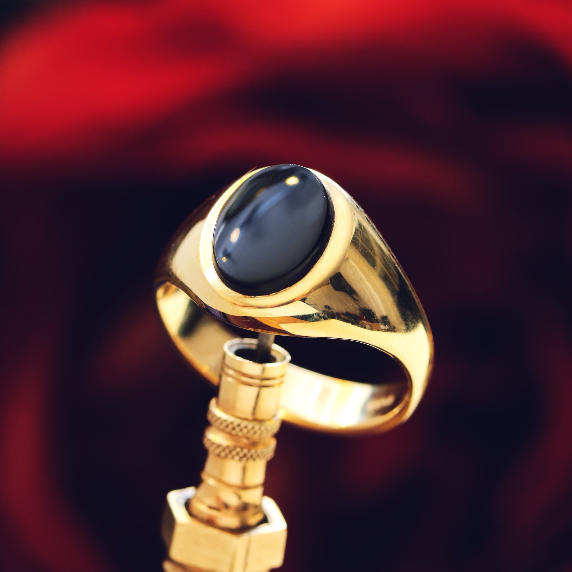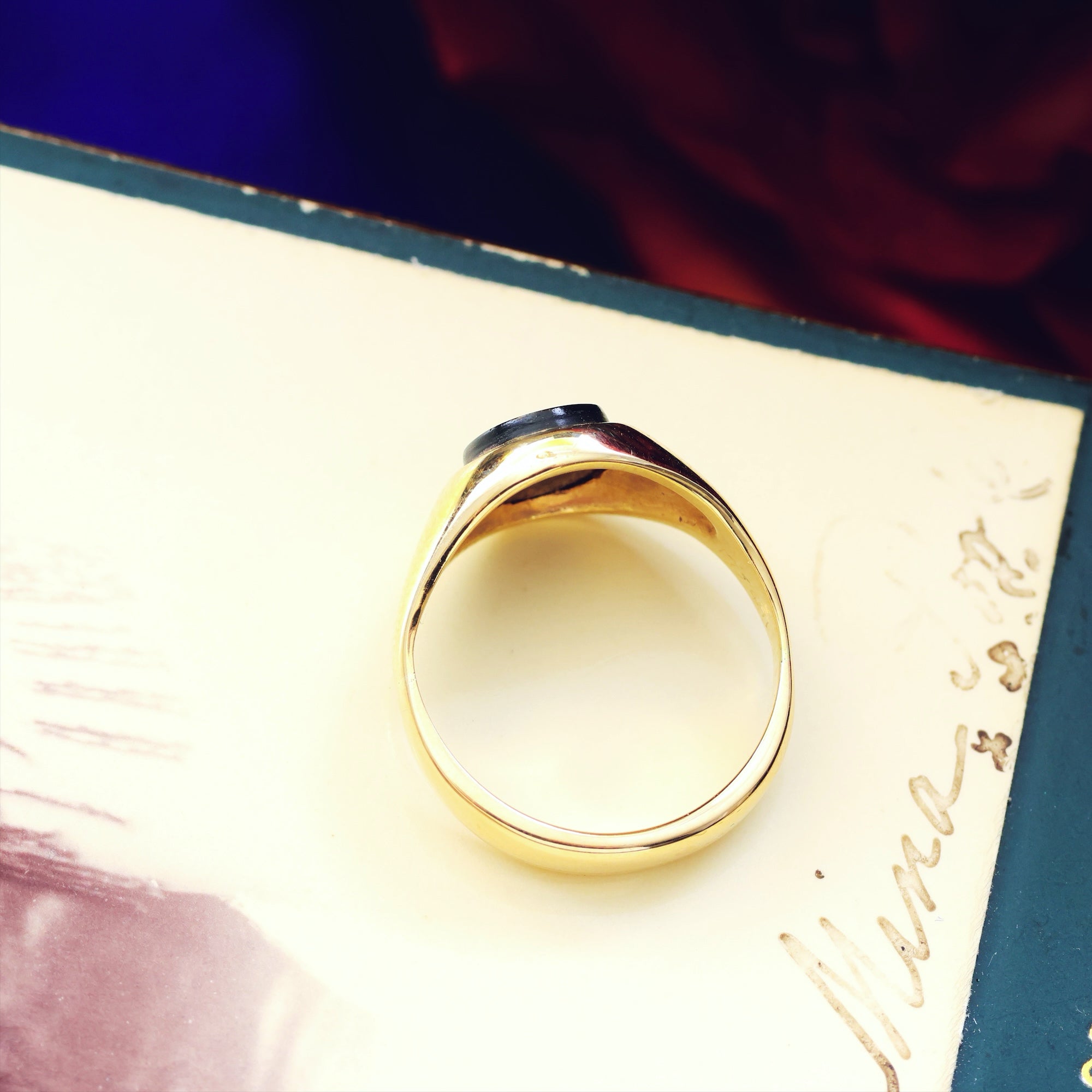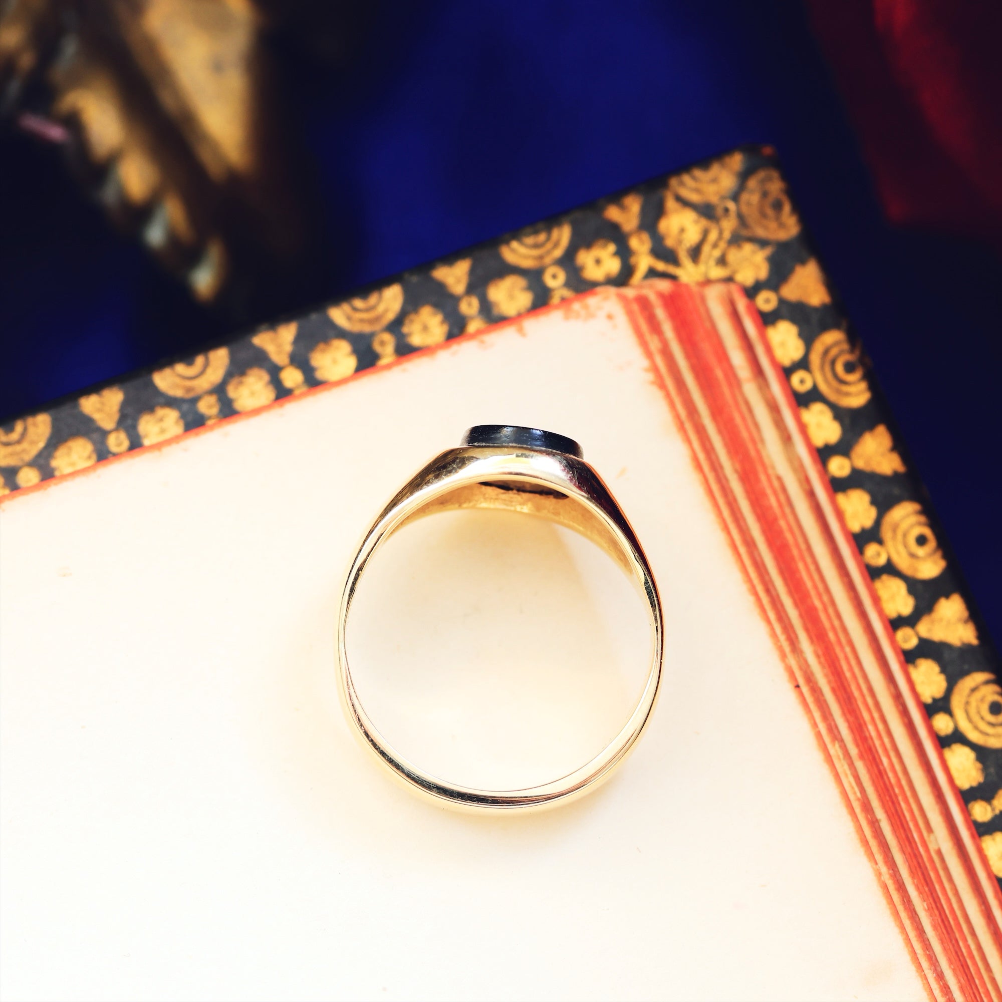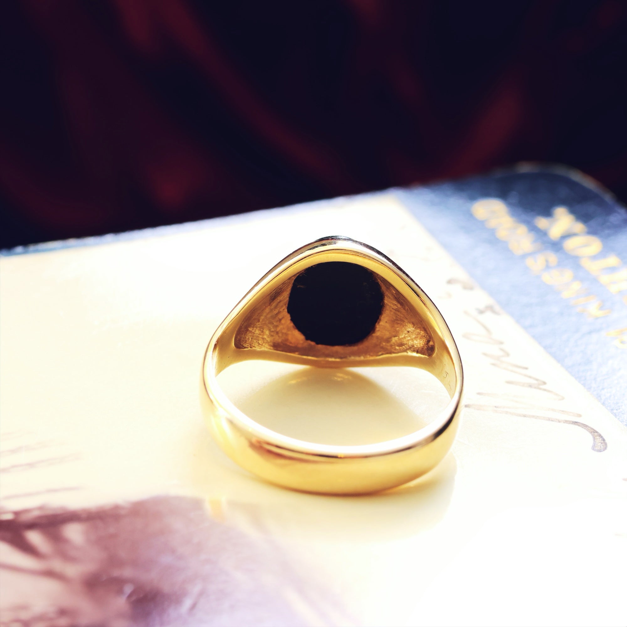 Ideal for a pinky finger this cute little 9ct Gold signet ring is the perfect finger trim as the oval shape of the classic Black Onyx is so flattering to the hand. With a streamlined gleam to the shoulders all is very pleasing to the eye. We have had the Onyx repolished by our lapidarist and shined up the whole beautifully.
