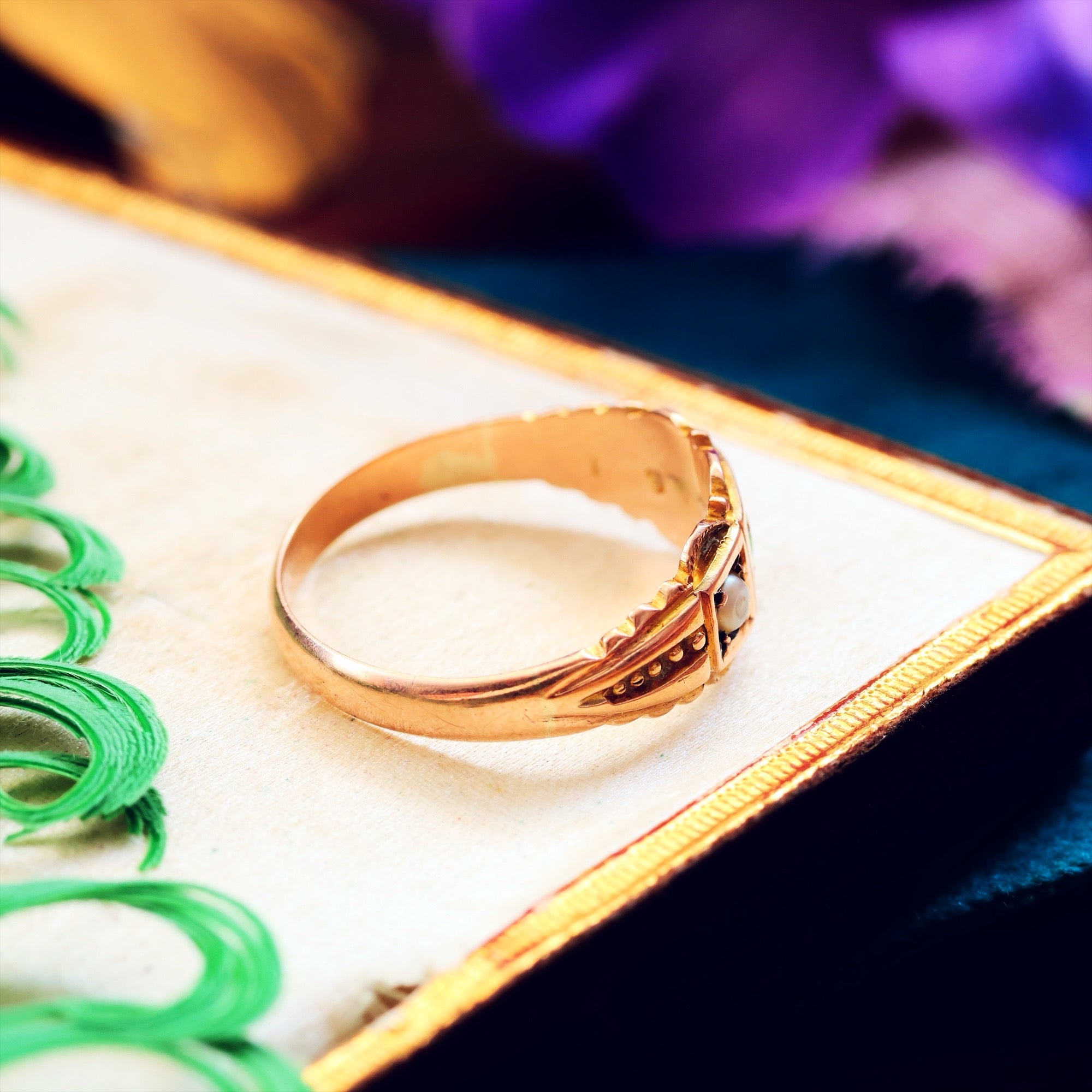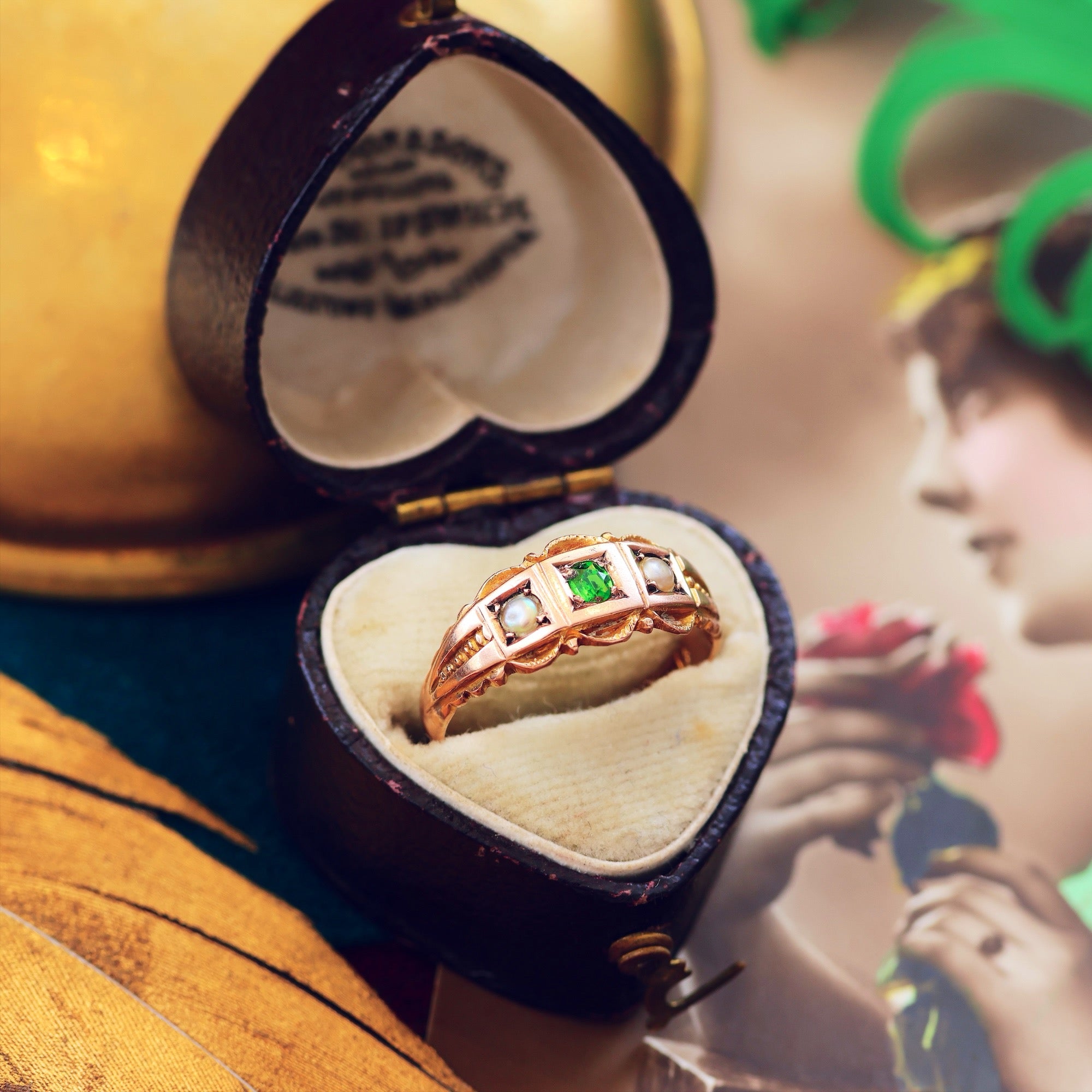 A very pretty little antique ring decorated in the simple and refined fashion of the day with a harmonious frilliness around the three gems; a zingy bright green Demantoid Garnet and two teeny wild Pearls. The perfect little treat!