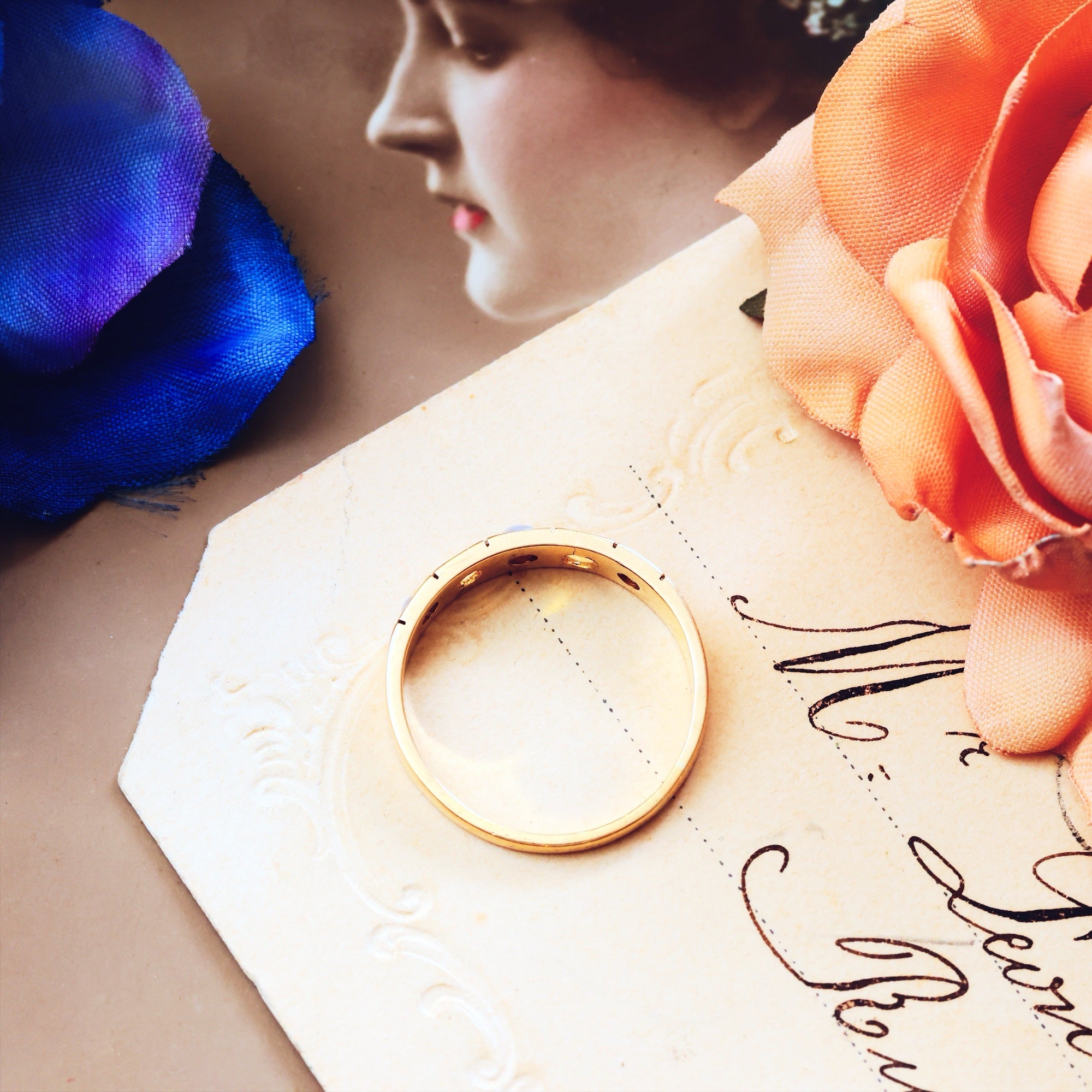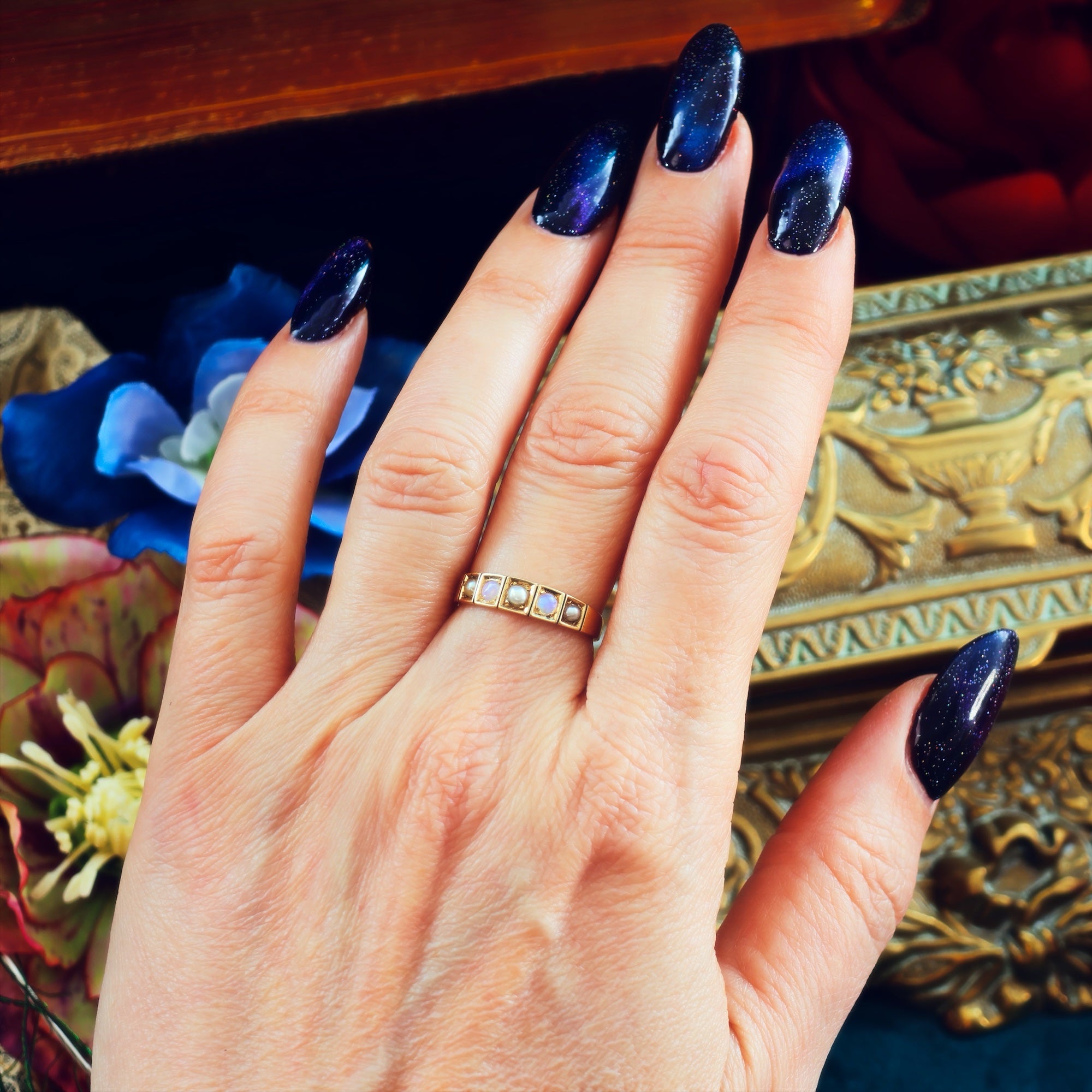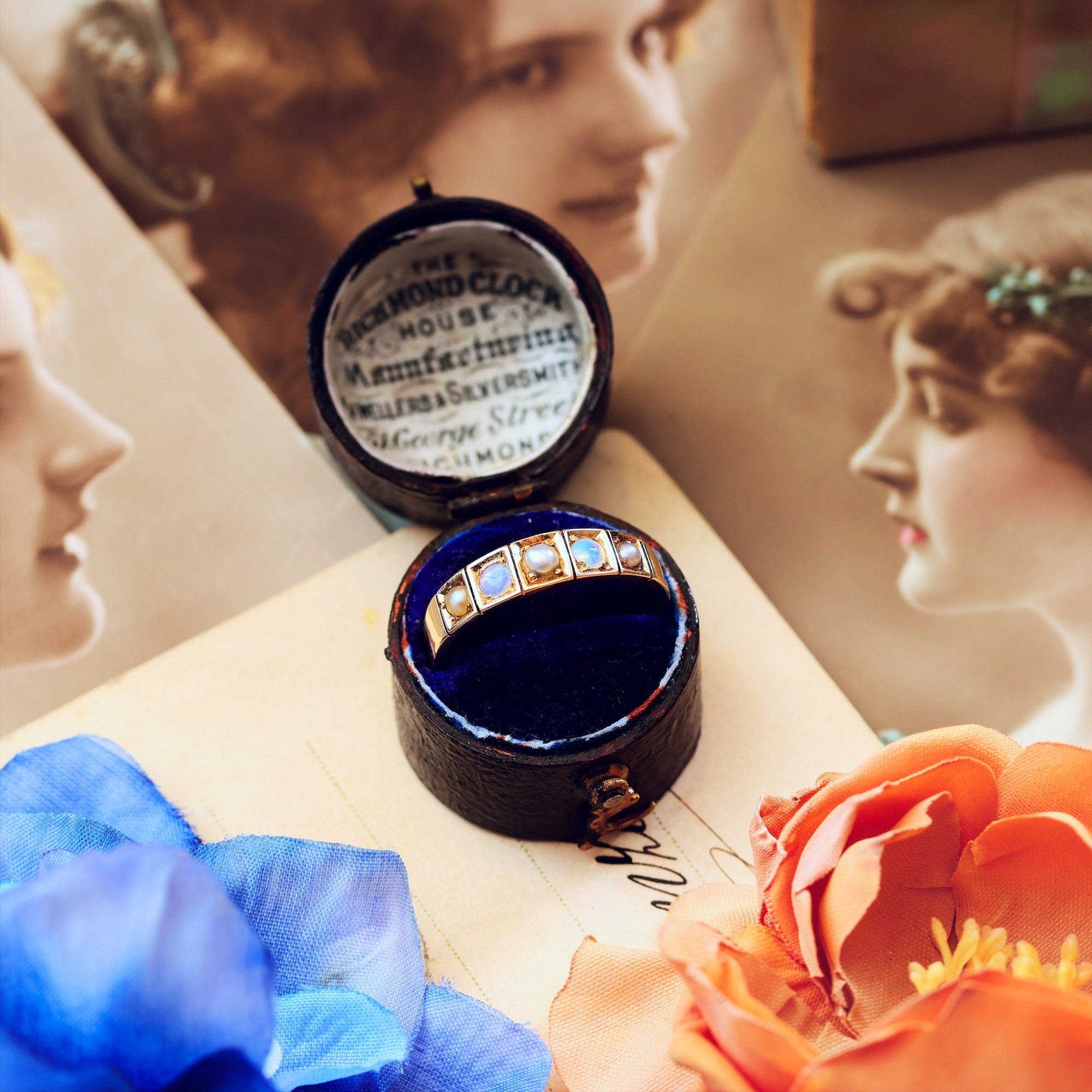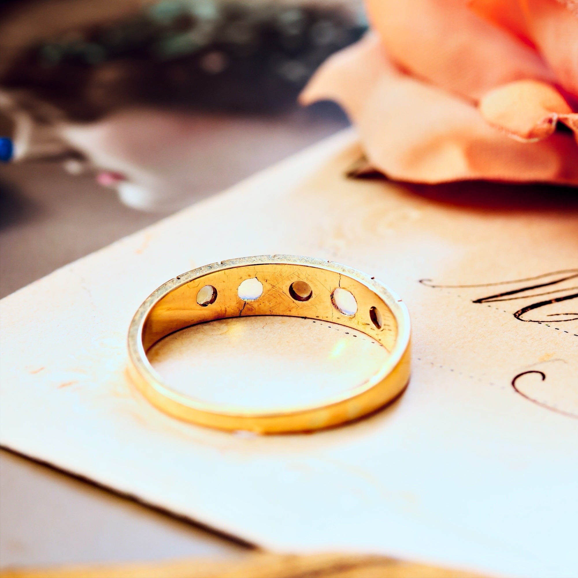 A simple and pretty design for this band ring dating to 1876 and capturing a slightly mystical femininity in the gems, both calling to Venus, the alluring spirit of the waves. Crafted in 15ct yellow Gold, each of the gems is set in a box which contrasts with the roundness of their curves. Quite lovely in fact.