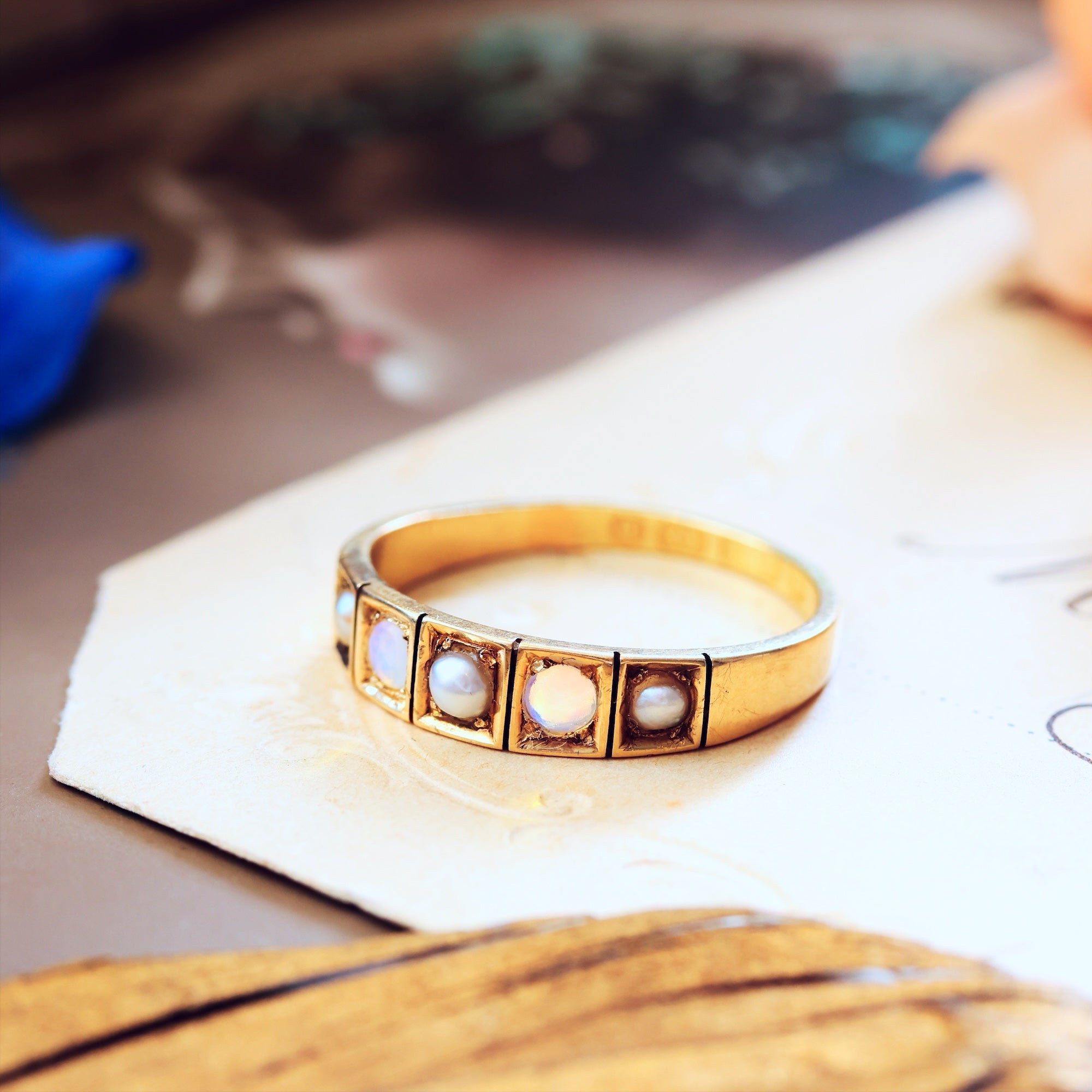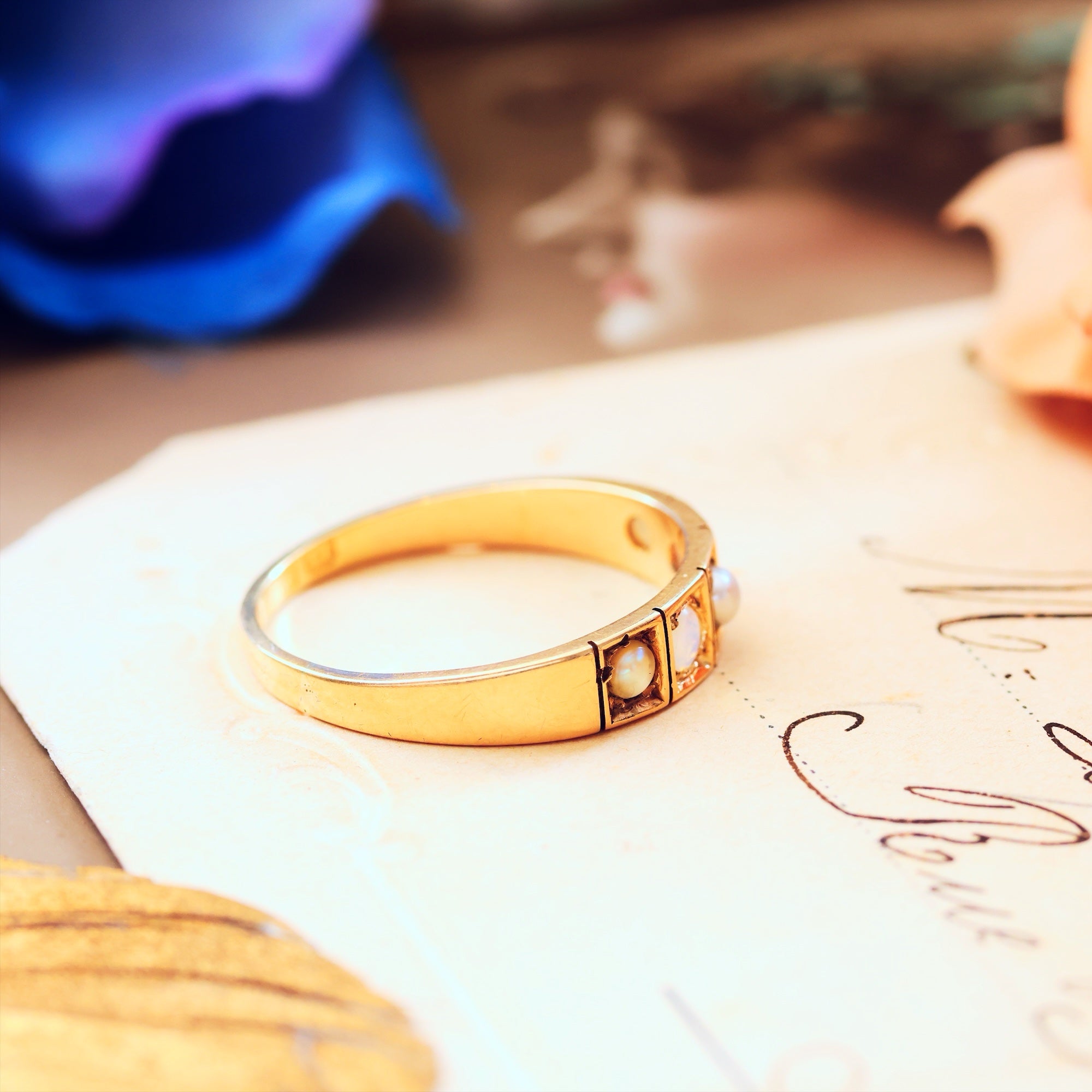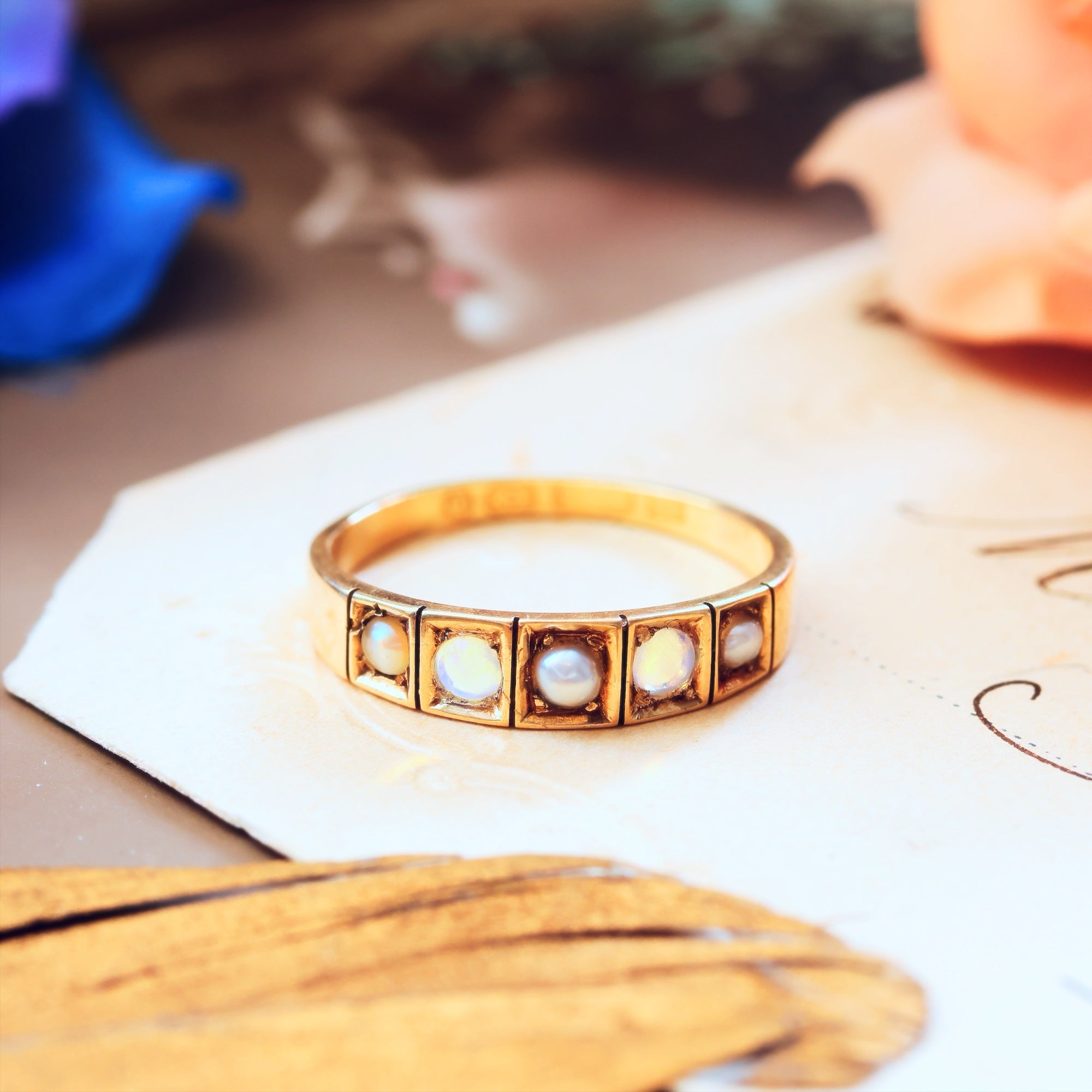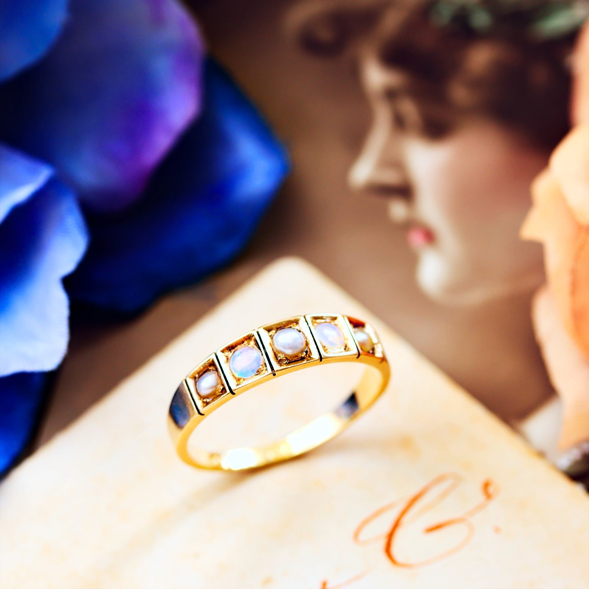 A simple and pretty design for this band ring dating to 1876 and capturing a slightly mystical femininity in the gems, both calling to Venus, the alluring spirit of the waves. Crafted in 15ct yellow Gold, each of the gems is set in a box which contrasts with the roundness of their curves. Quite lovely in fact.