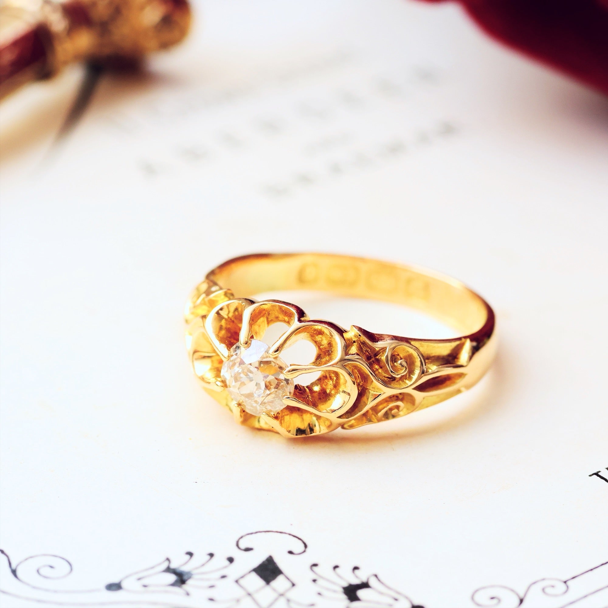 A privilege to wear: a scarce and very beautiful antique Diamond engagement ring in a Gothic Revival mood and dating to 1895. Quietly contemplative, the gentle glimmer of the olden hand cut Diamond is fascinating, and we particularly love the nod to the Medieval in the scalloped belcher setting to the gem and deeply carved shoulder ornamentation which reflects designs seen in ecclesiastical buildings.