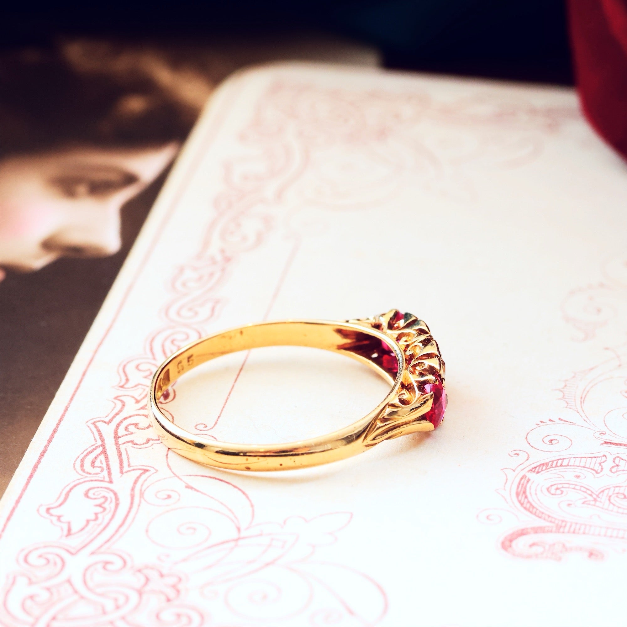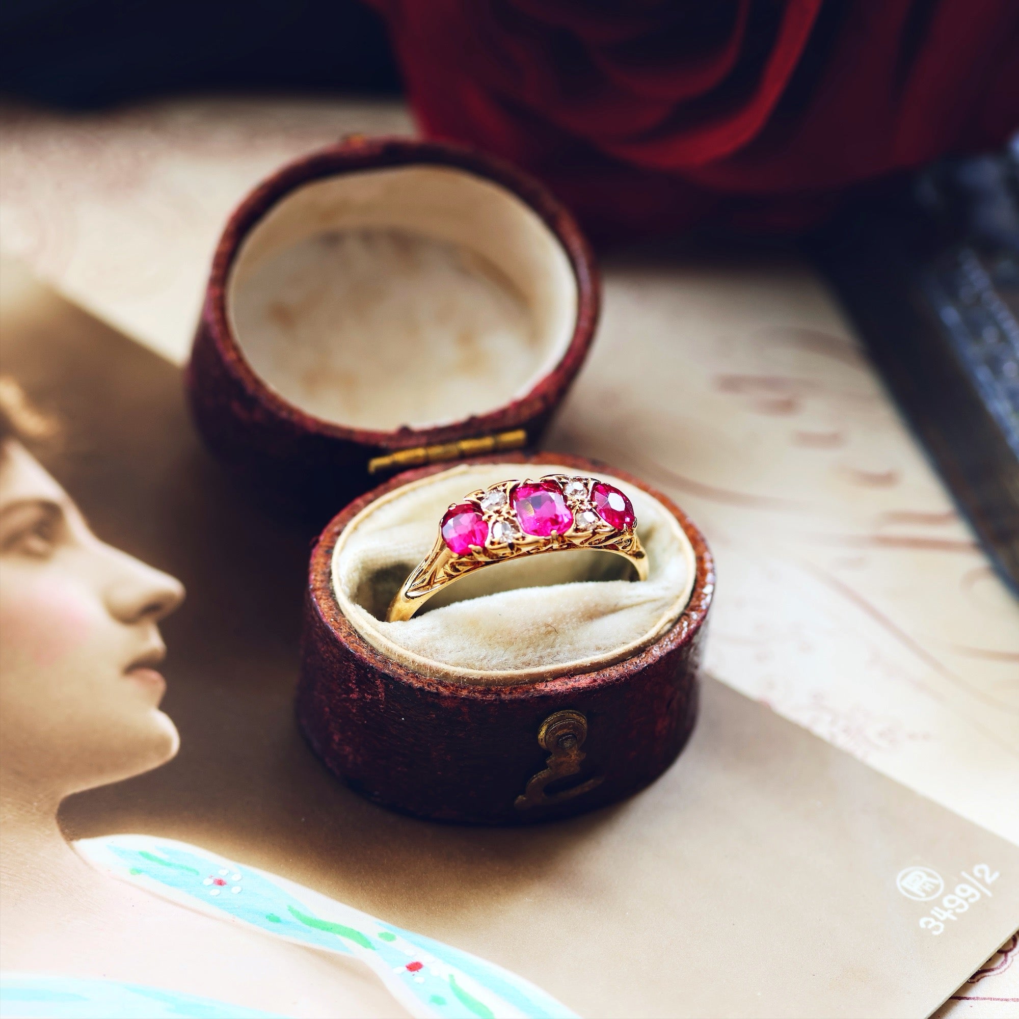 Beautifully appointed with an array of hot pink Verneuil Rubies accented by sparkly antique Diamonds, this old Victorian engagement ring is a most romantic find! An especially lovely example of the 'boat' shaped carved half-hoop ring which was immensely popular in the latter 19th century and into the 1920's, all was fashioned with skill and care to show off the trio of Rubies which are nicely hand faceted in the old way and accented by small gorgeous hand cut 'old mine' style Diamonds; each its own unique personality and glitter determined by the quirkiness of the individual facets to the stone as they are cut in sympathy with the original crystalline shaping.