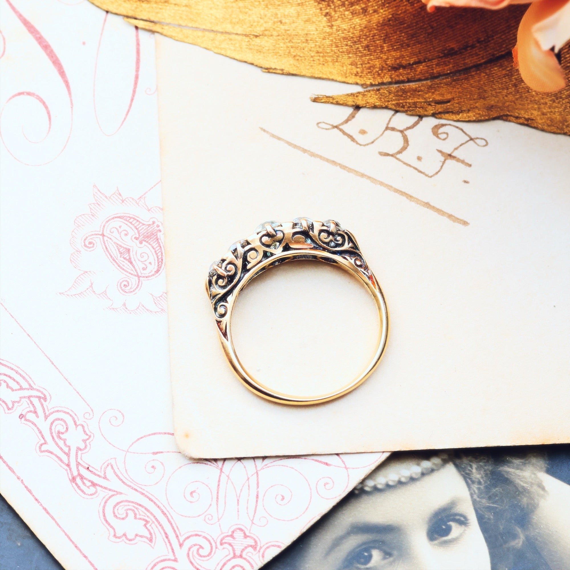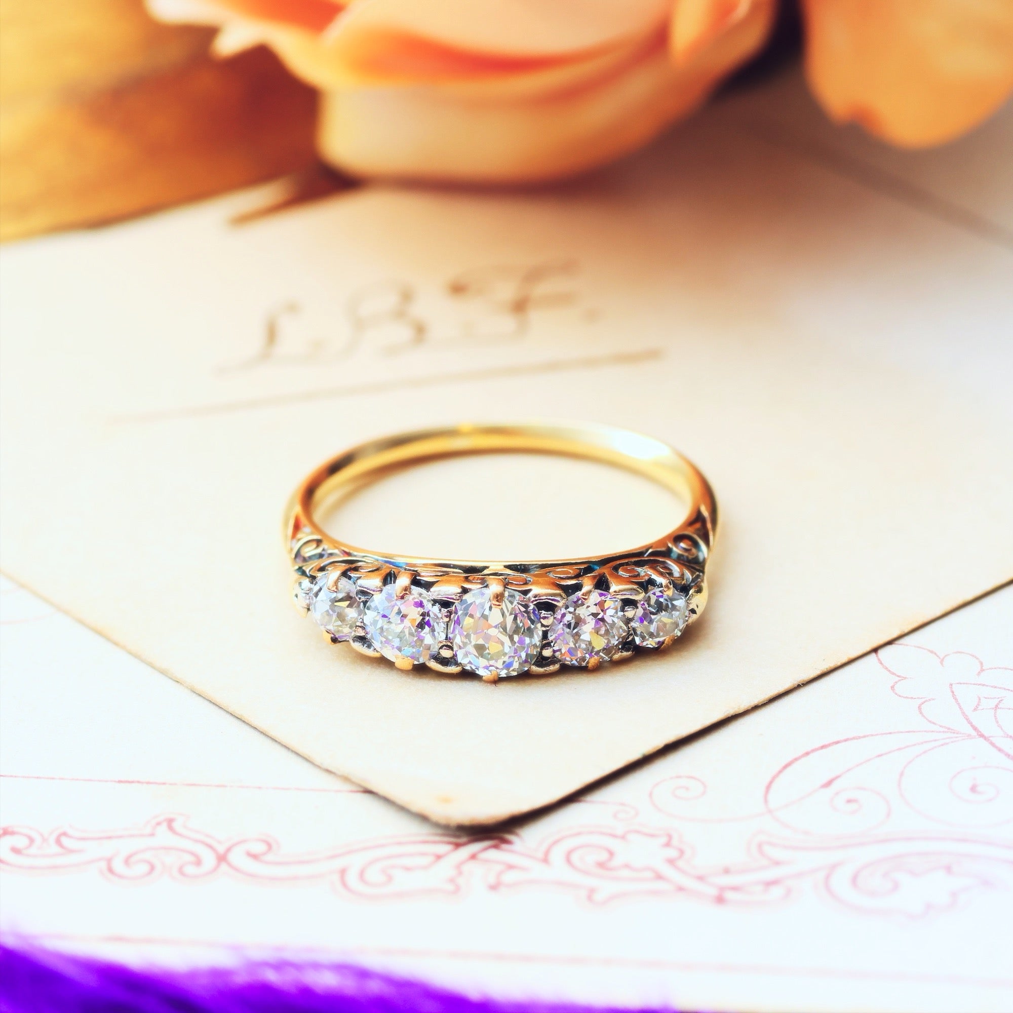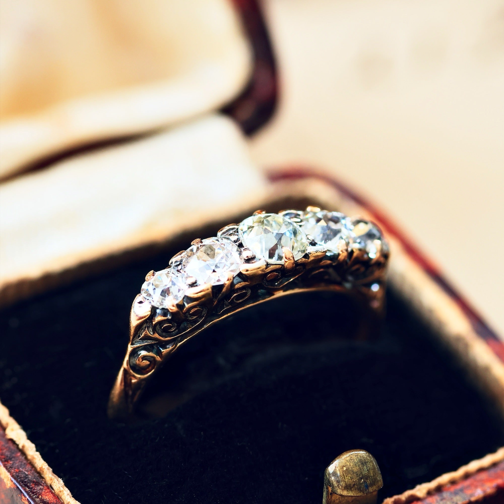 A most magically and marvellous sparkly antique Diamond engagement ring! An especially lovely example of the 'boat' shaped carved half-hoop ring which was immensely popular in the latter 19th century and into the 1920's, all was fashioned with skill and care to show off five gorgeous old hand cut 'transitional' style Diamonds; each its own unique personality and glitter determined by the precision of the facets which were the height of technology at the time. Read our BLOG here.