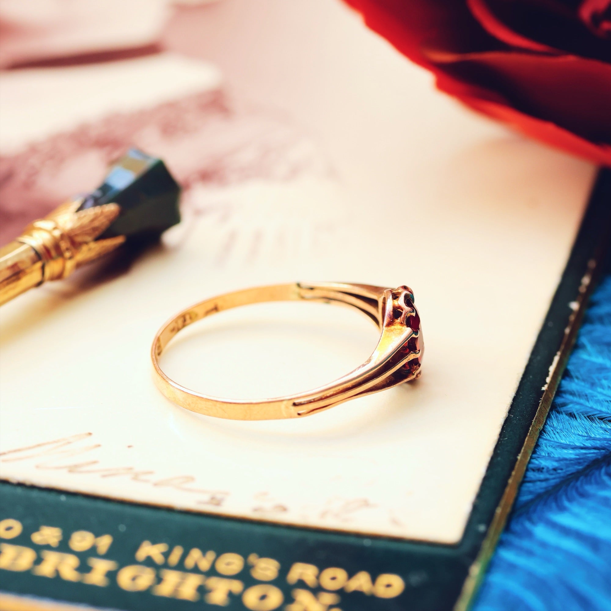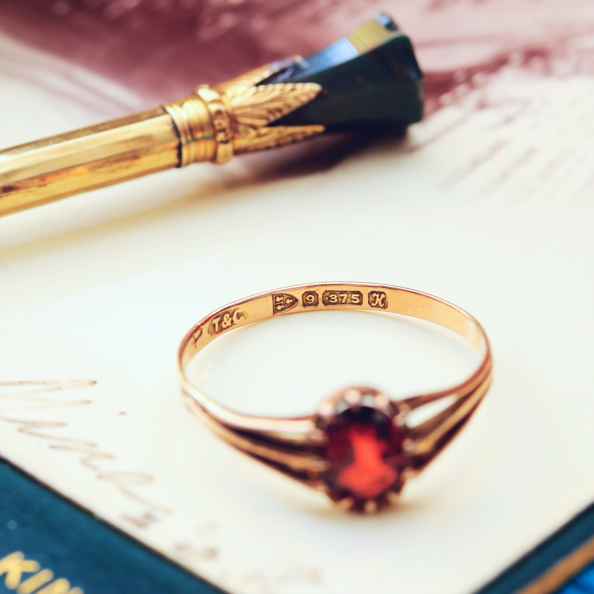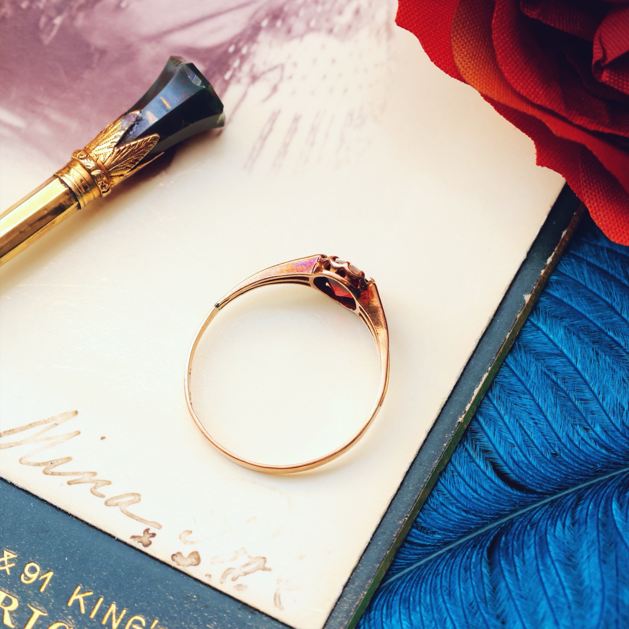 A miniature marvel that this modest little ring has survived a century as she is so fine and slender of construction. After the Arts & Crafts manner, the shoulders are gently tapered and all is pared back harmony. Loved and worn, the deep wine hued Garnet, (you'll notice if you look at our magnified images) has chips to the edges, but these are barely visible without a loupe. We've priced with these factors in mind and hope she'll find a fond new home.