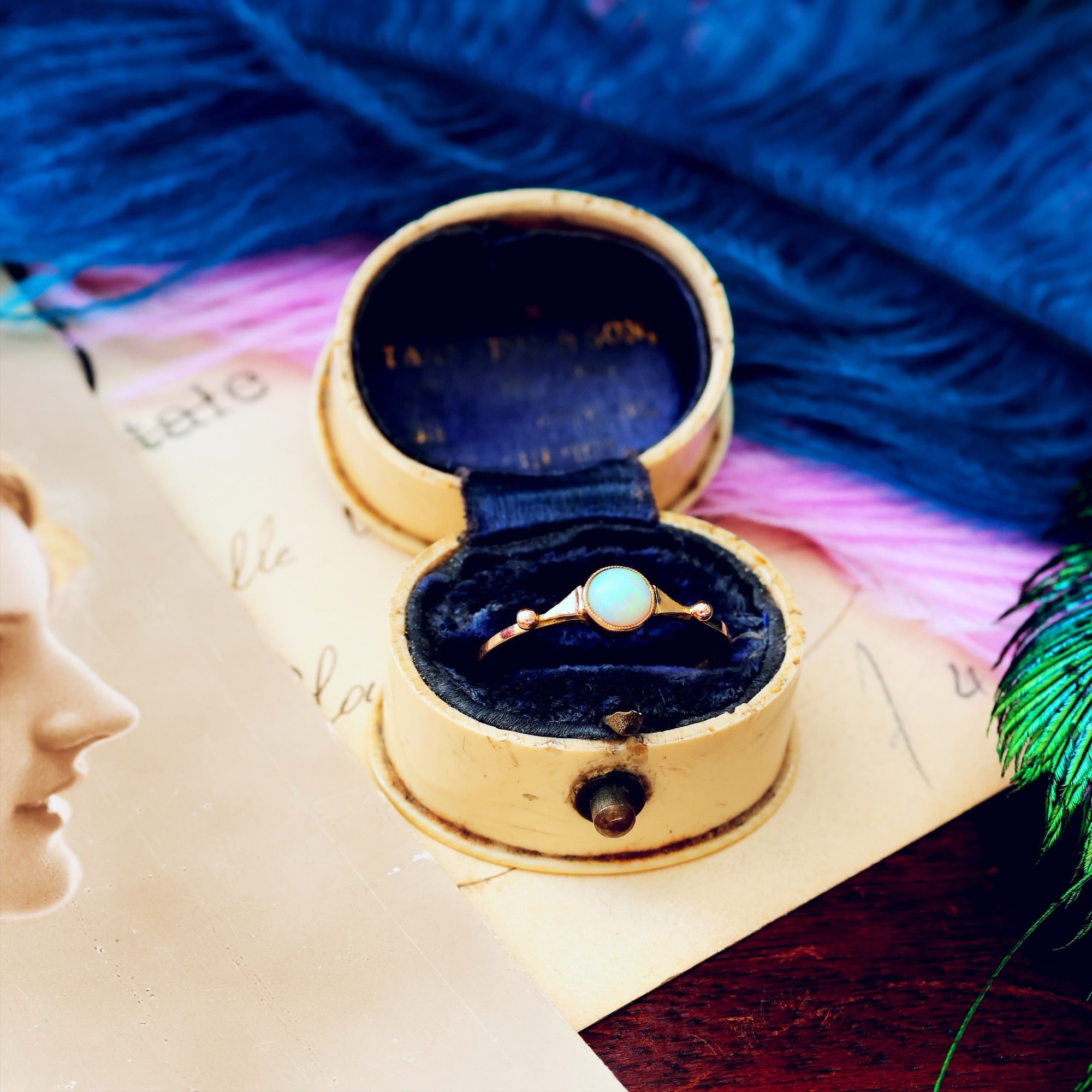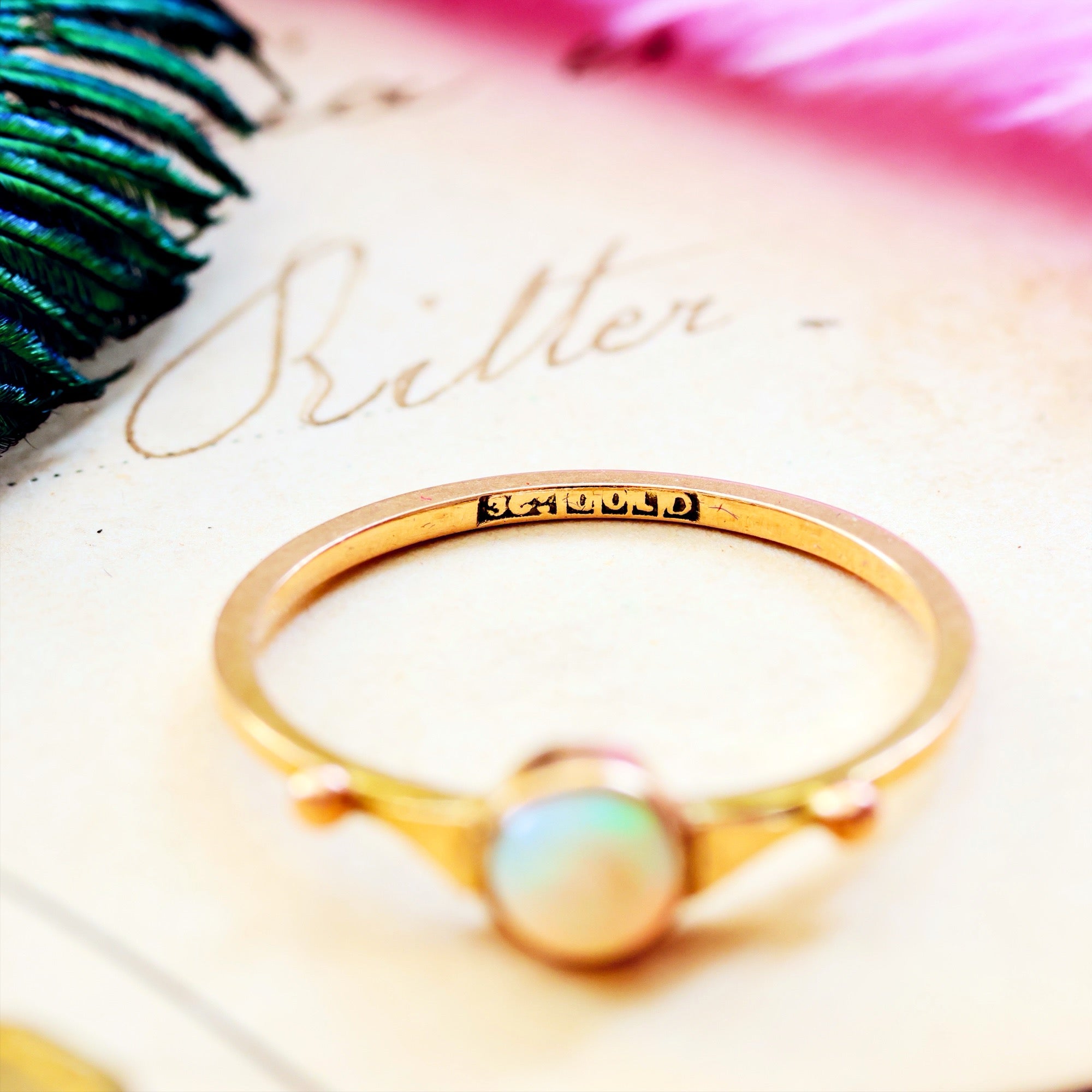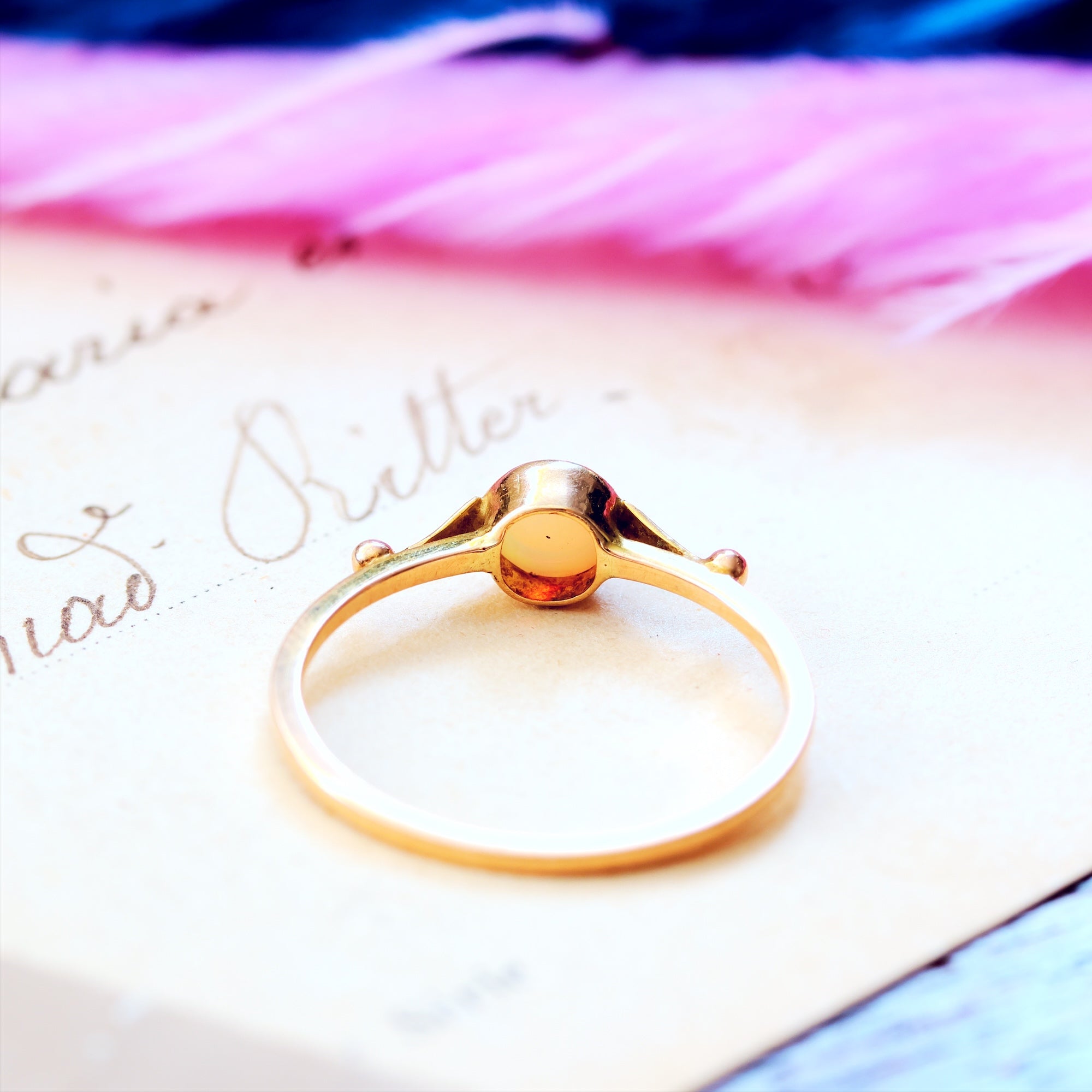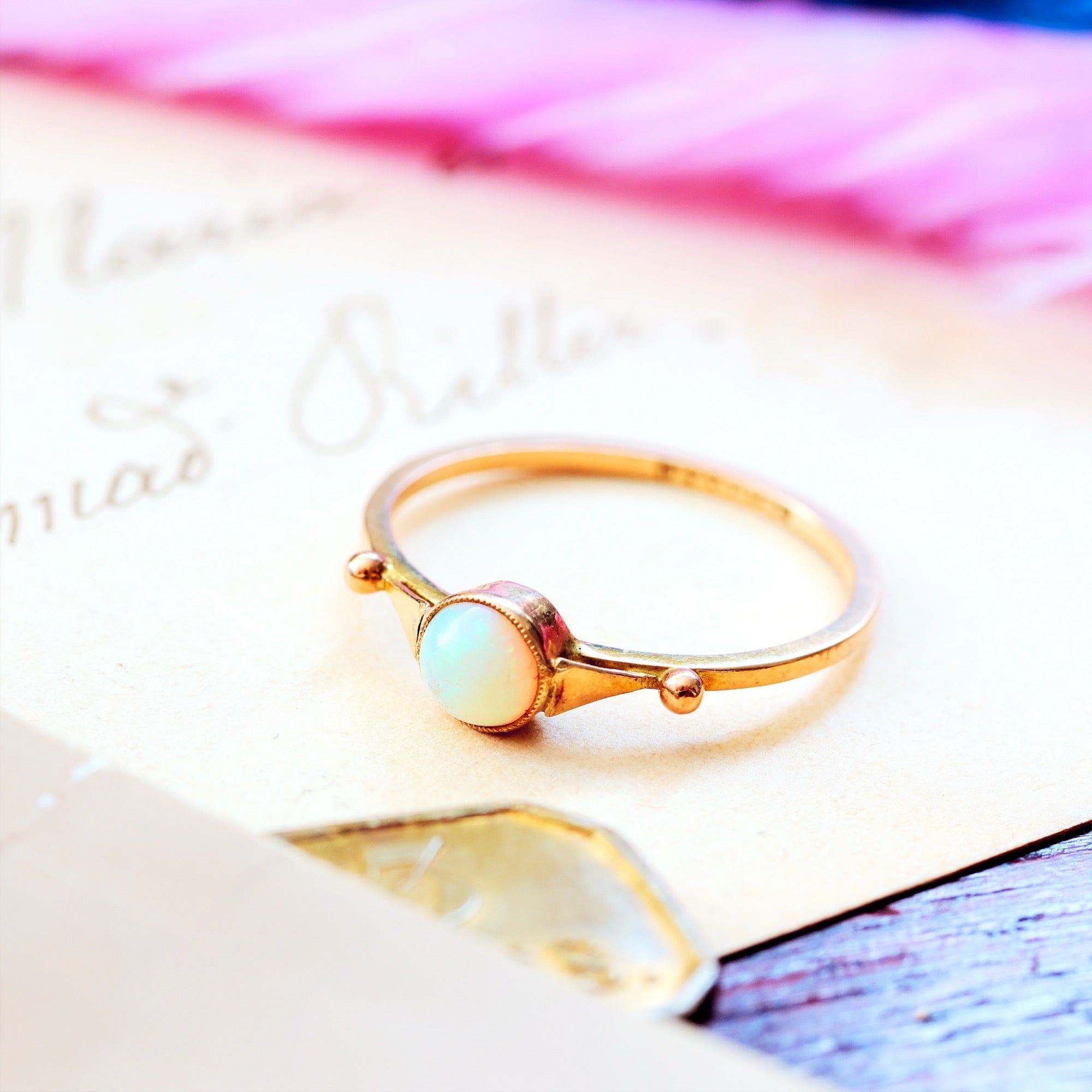 The brightest little rainbowed cabochon Australian Crystal Opal which displays the whole spectrum of colours to beautiful effect is set in a hand crafted mount of gentle 9ct Gold with cute little details to the shoulders. Dating to around the 1920's, a perfect little something for a special birthday or celebration.