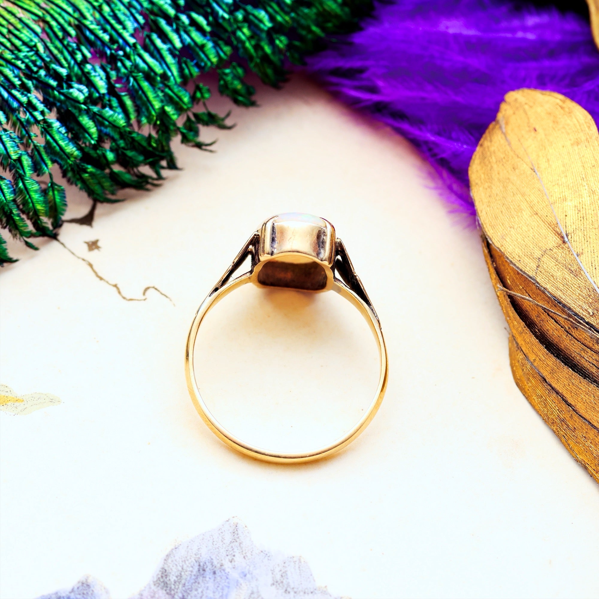 The brightest piece of natural rainbowed Australian Crystal Opal which displays the whole spectrum of colours to beautiful effect is set in a hand crafted mount of gentle 9ct Gold with cute little details to the shoulders. Difficult to capture the true beauty of this gemstone in a still photo, it has a milky pink background with deep blues, reds, oranges shape-shifting at each turn of the hand. Dating to around the 1970's, a perfect little something for a special birthday or celebration. All 100% ethical as recycling and re-homing is truly the best way to go!