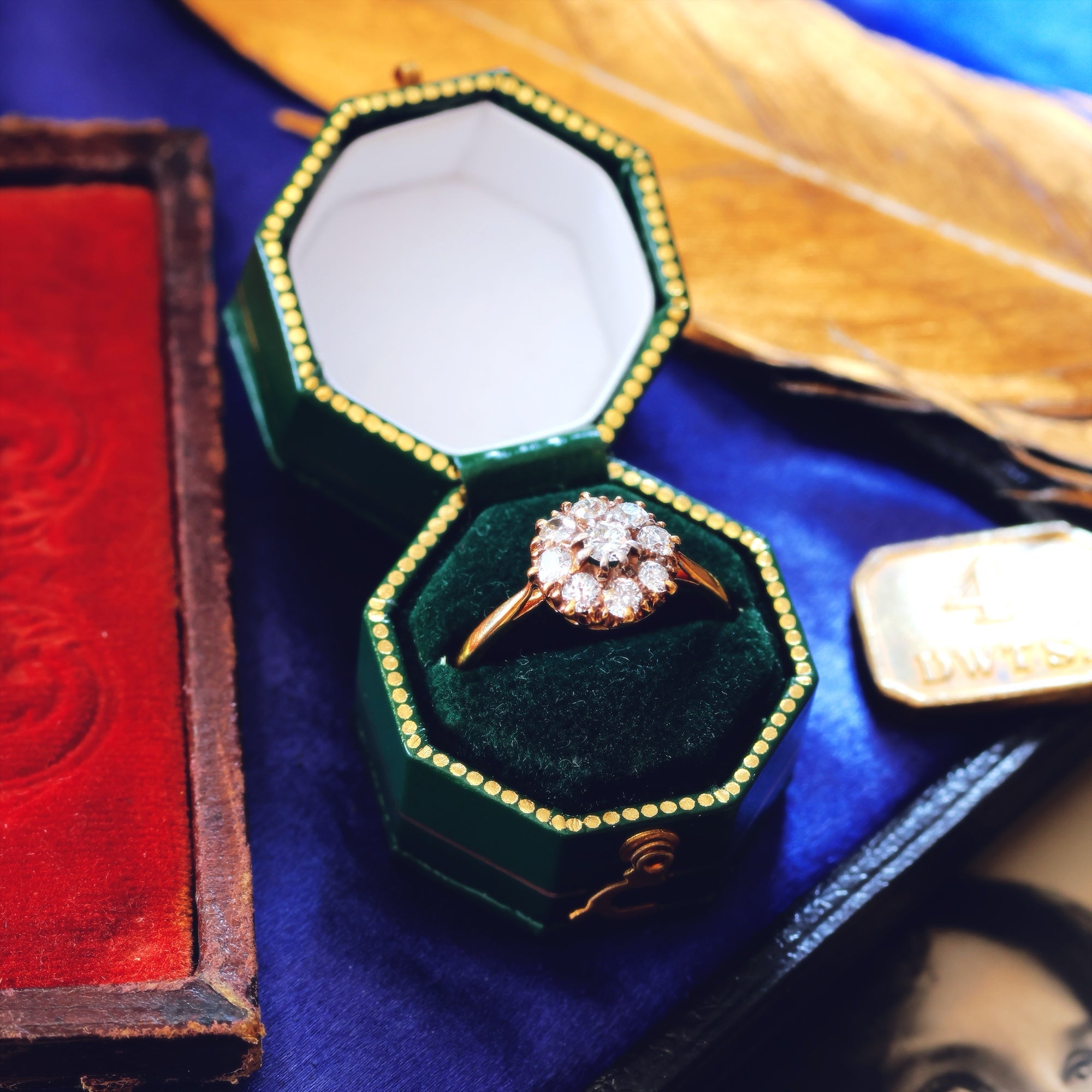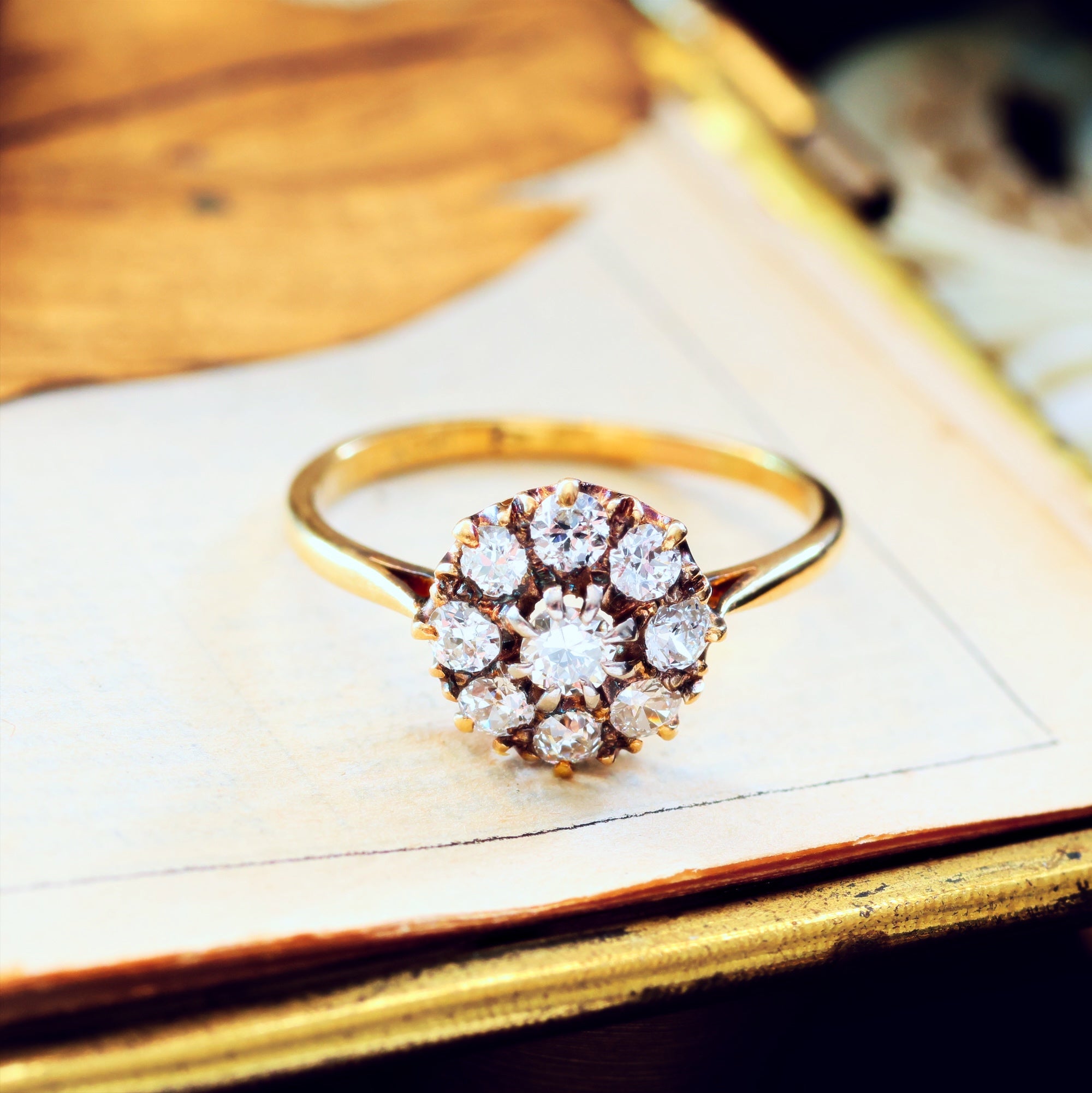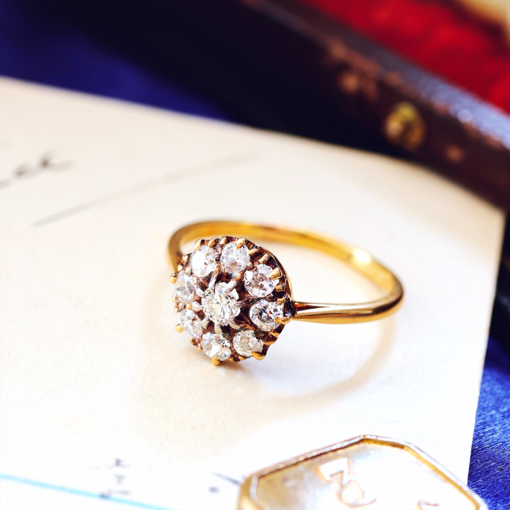 A romantically scintillating vintage Diamond Daisy cluster ring, expressing the mood of the time with oodles of impact. The Daisy a perennial reminder that love never dies, this ring is all hand crafted as you would expect, with a Platinum setting to the gems; the nine sparklesome beauties are each a hand faceted and a unique creation being each everso slightly different to each other. So special!