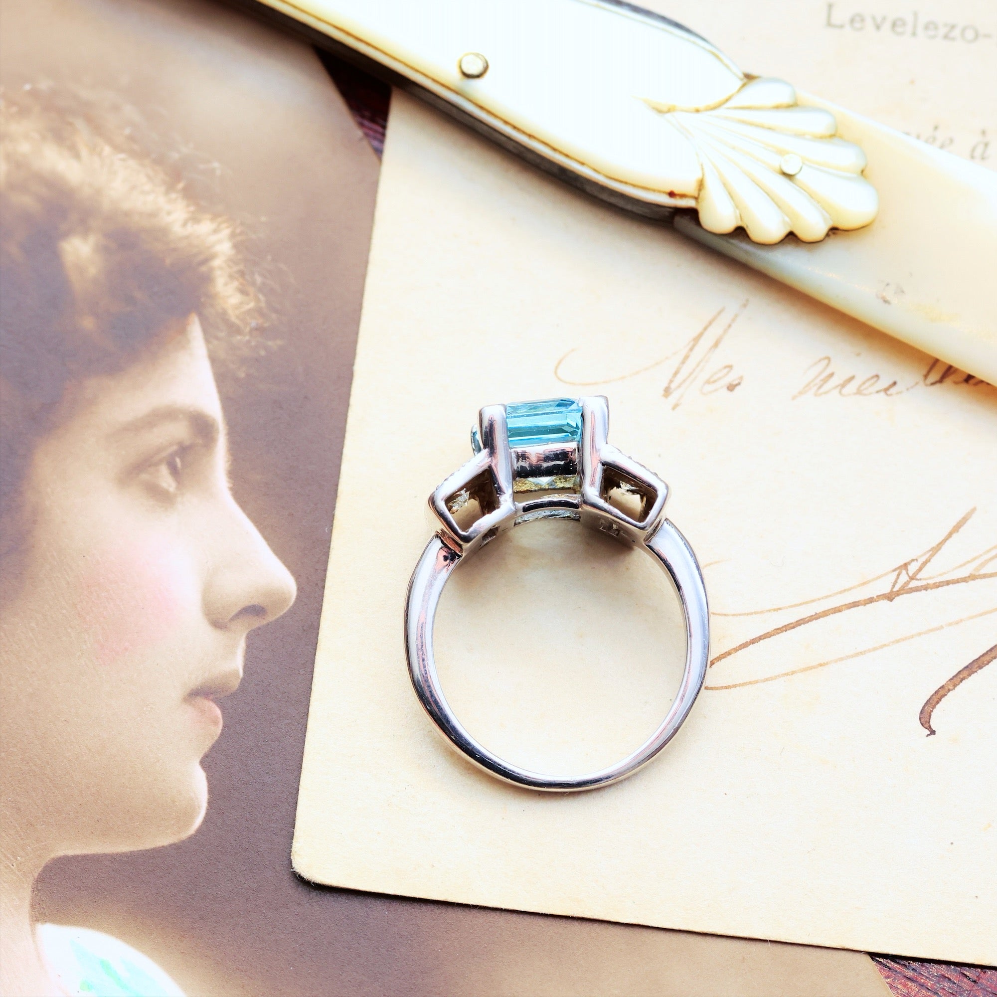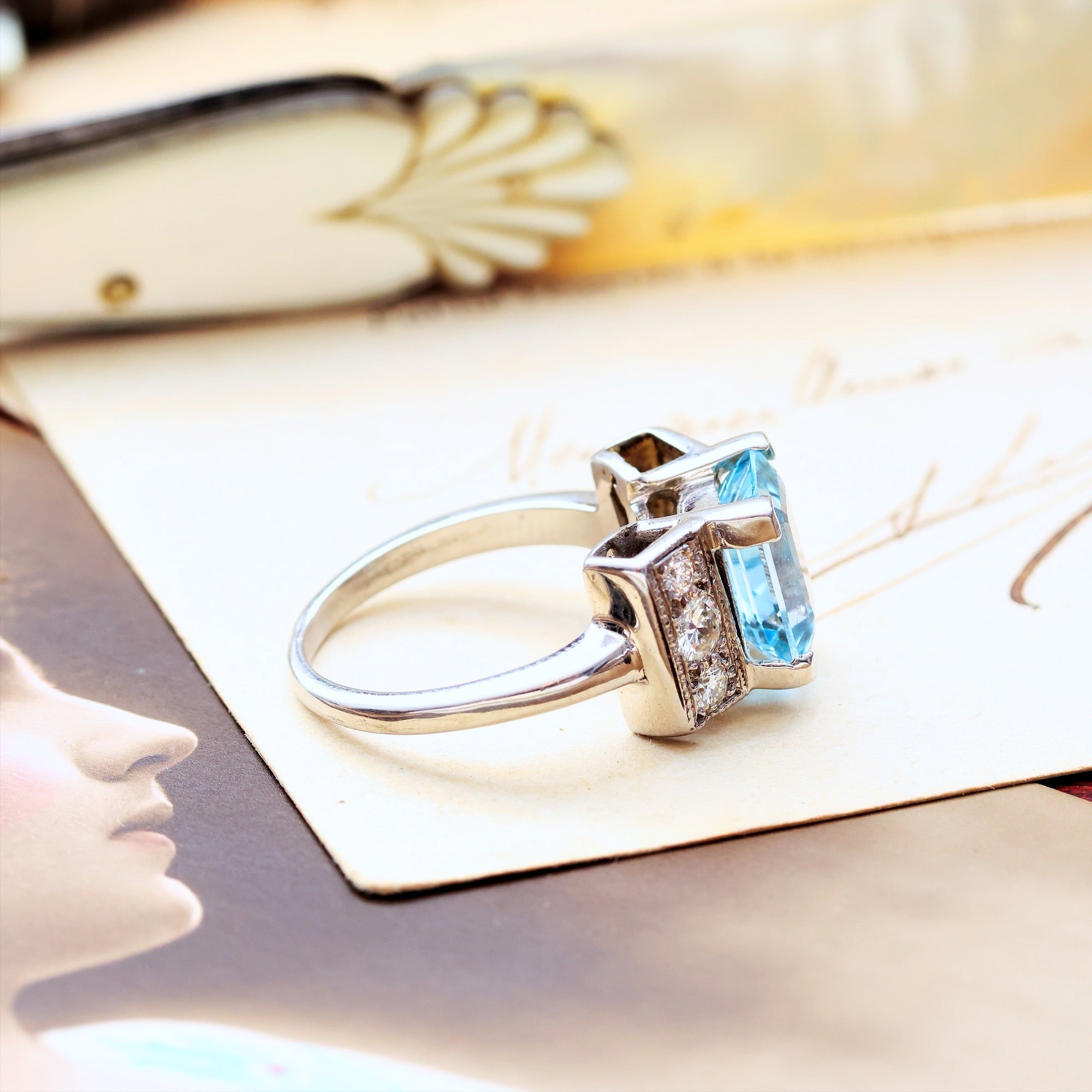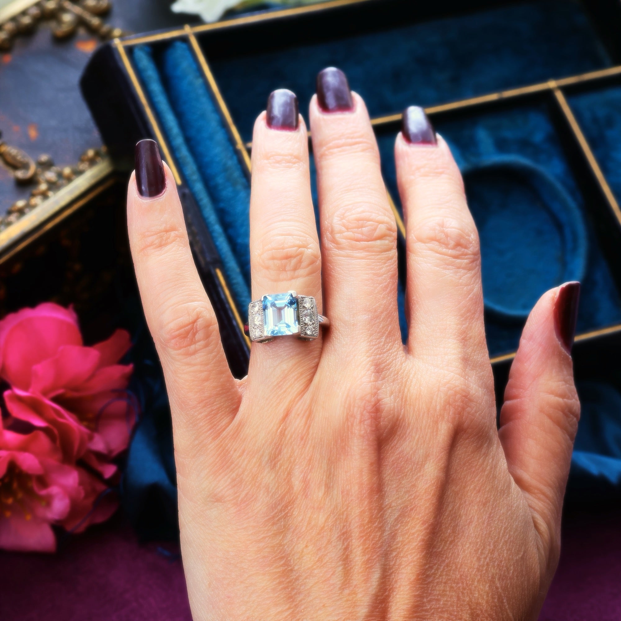 An impressively exuberant Aquamarine and Diamond cocktail ring dating to the 2000's and taking a wink at Art Deco design. A nicely confident size on the hand, all is of 18ct White Gold allowing the beautiful Aquamarine to show to her best, with a trio of fizzily sparkly brilliant cut Diamonds. Neatly set and shaped to the finger, this vintage ring will always garner envious glances and could be your new statement jewel.