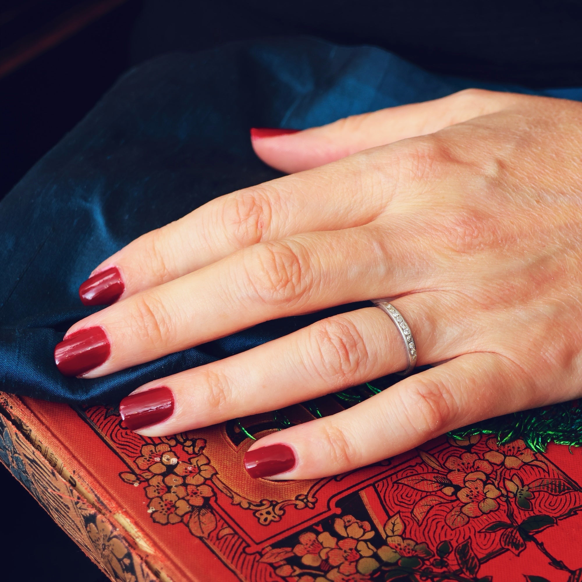 A nice quality vintage Platinum half eternity style band sparkled across with ten beautifully clean and white eight-cut natural Diamonds, each set in a smooth and neat channel for a precise and pleasing effect which will set next to a wedding band closely. Circa 1960's or so
