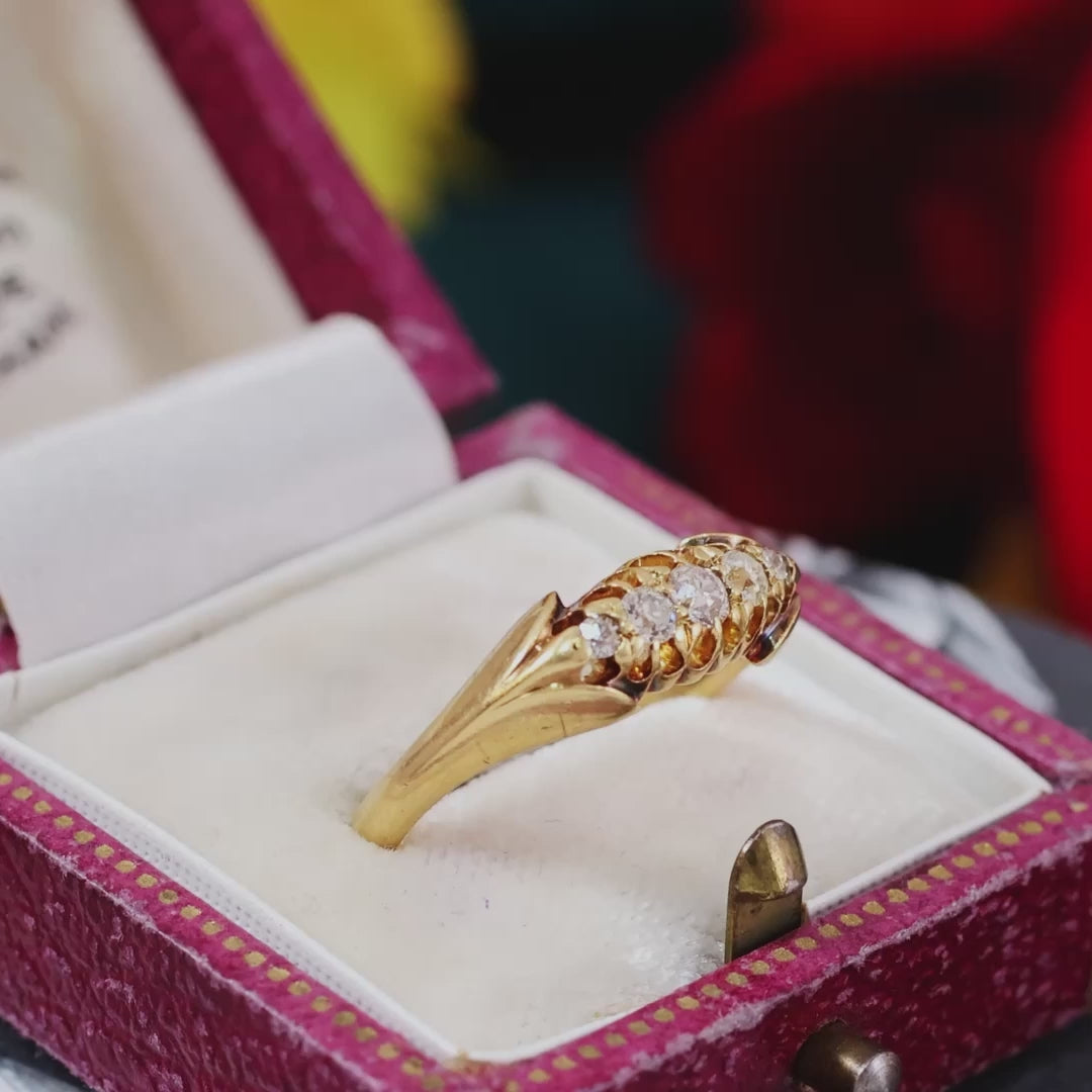 A genuinely lovely old romance and the very best option for both sustainability, ethical reasons and originality. The ring size is a 'P and a half' or '7.75' as is but we could alter to suit if you leave a message on your order form. The combined Diamond weight is in the region of 0.25ct.
