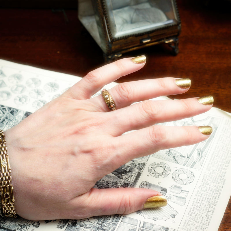 Rare Precious Date 1875 Etruscan Revival Coral & Pearl Ring