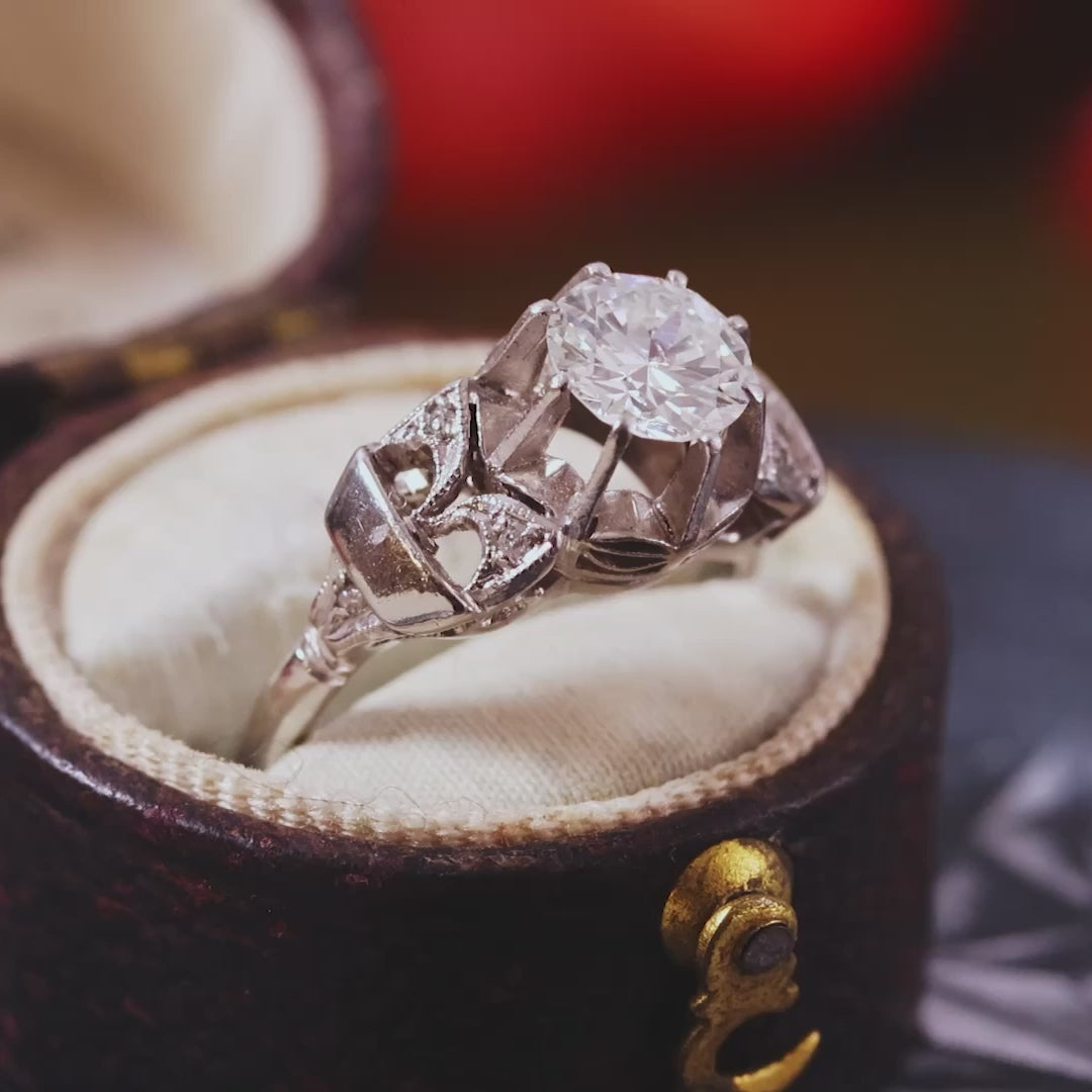A totally one-off piece of vintage glamour! This beauteous Art Deco Diamond engagement ring, is a marvellous feat of Platinum engineering! From the gorgeous tulip-style setting, to the fine hand construction of the underbezel, this ring has interest from every view. The Diamond is an especially effervescent antique brilliant-cut with a measured weight of 0.86ct, certificated at I Colour & SI2 Clarity, and two teeny cushion-cut Diamonds adorn each leafy shoulder. A wonderful Art Deco floral creation, this ring is a finger size 'M' or '6 1/4', but can easily be adjusted. Circa 1950's, English. A valuation certificate for insurance purposes will be provided with this item.