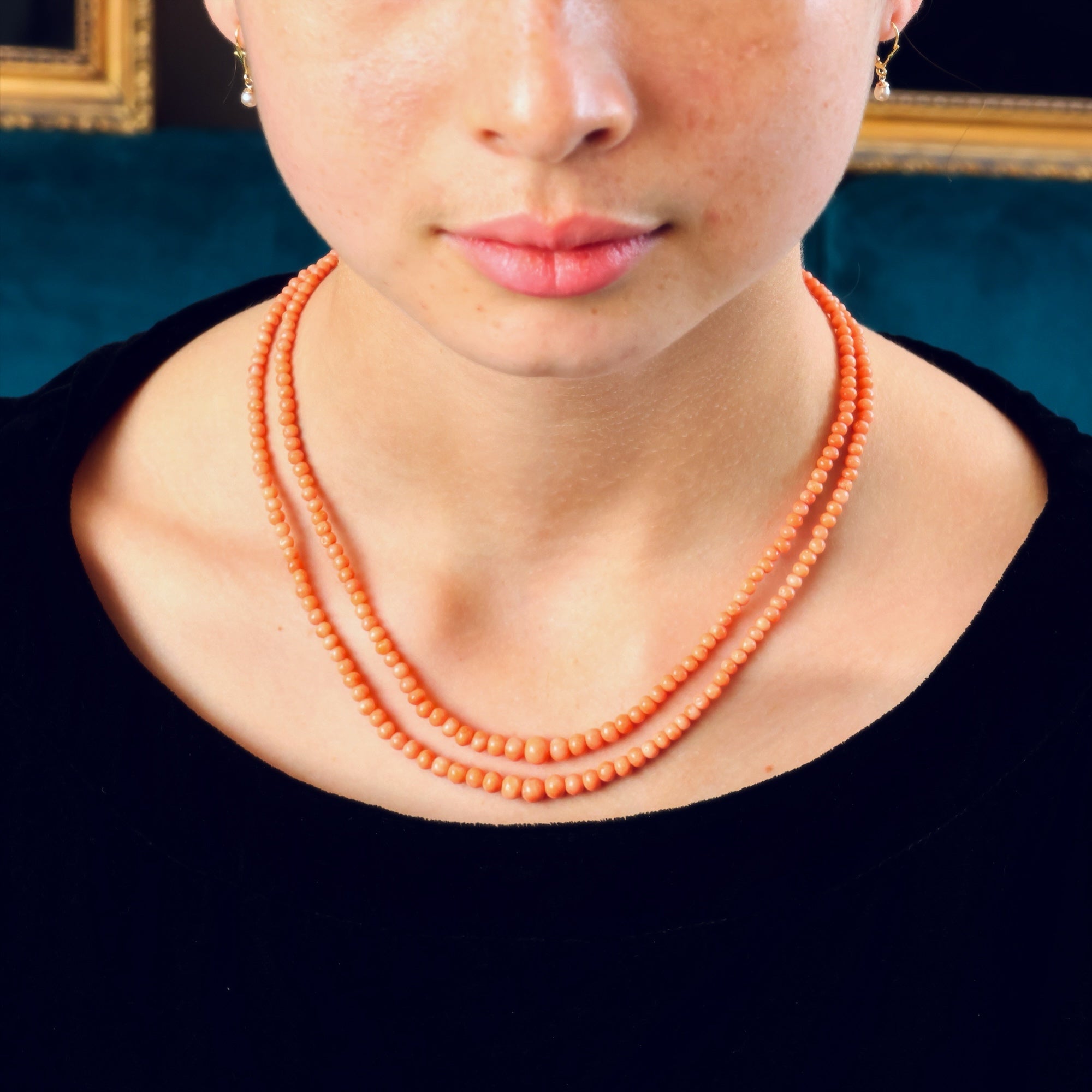 The most special of finds and a wonderful piece for a collector, this antique double row Victorian period necklace of graduated hand carved peachy hued Sciacca Coral beads is a lovely find. A semi fossilised Coral found off the coast of Sicily, Sciacca Coral has an interesting story; read our BLOG about Sciacca Coral here. A necklace such as this would likely have been a souvenir from the Grand Tour when visiting Italy and fastens with its original hand made and engraved box clasp. See the portrait Monna Vanna by Rossetti for tips on how to wear!
