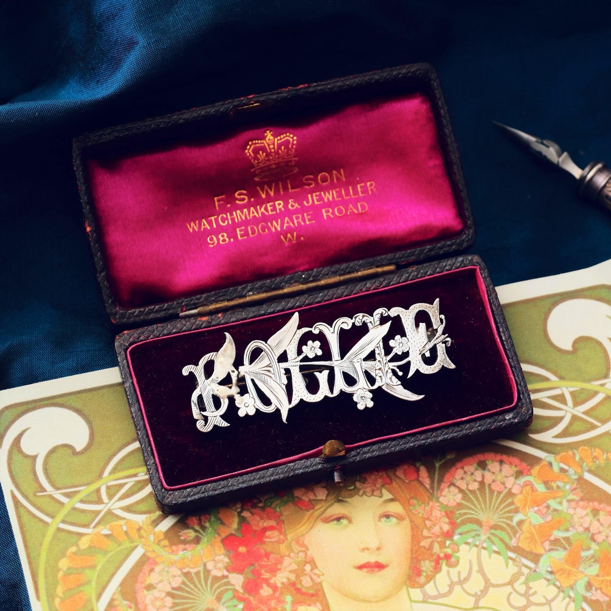 A pretty little something for Polly (or Pollie as the name is spelt here). Made in the great and famous jewellery quarter in Birmingham, and hallmarked in the year 1878, there is much work in the hand piercing and engraving of this piece. Decorated with threaded Forget-me-not flowers, this piece is a superior example of a design which was popular at the time.