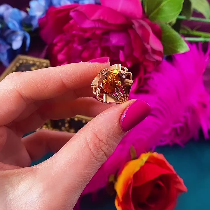 With a confidently glamorous look, this vintage Russian dress ring is totally over-the-top awesome!! Pride of place is a wonderfully intense coloured and elegantly oval faceted cognac Citrine. Every aspect of the construction has been thoughtfully created with an eye for architectural impact, marked for 14ct gold (with a maker's mark which we haven't been able to place as yet) the shoulders resemble sculpted golden bows which arch impressively over the finger, sitting sooo comfortably shaped to the finger. The style is very retro 1940's, but we think it's certainly more recent.
