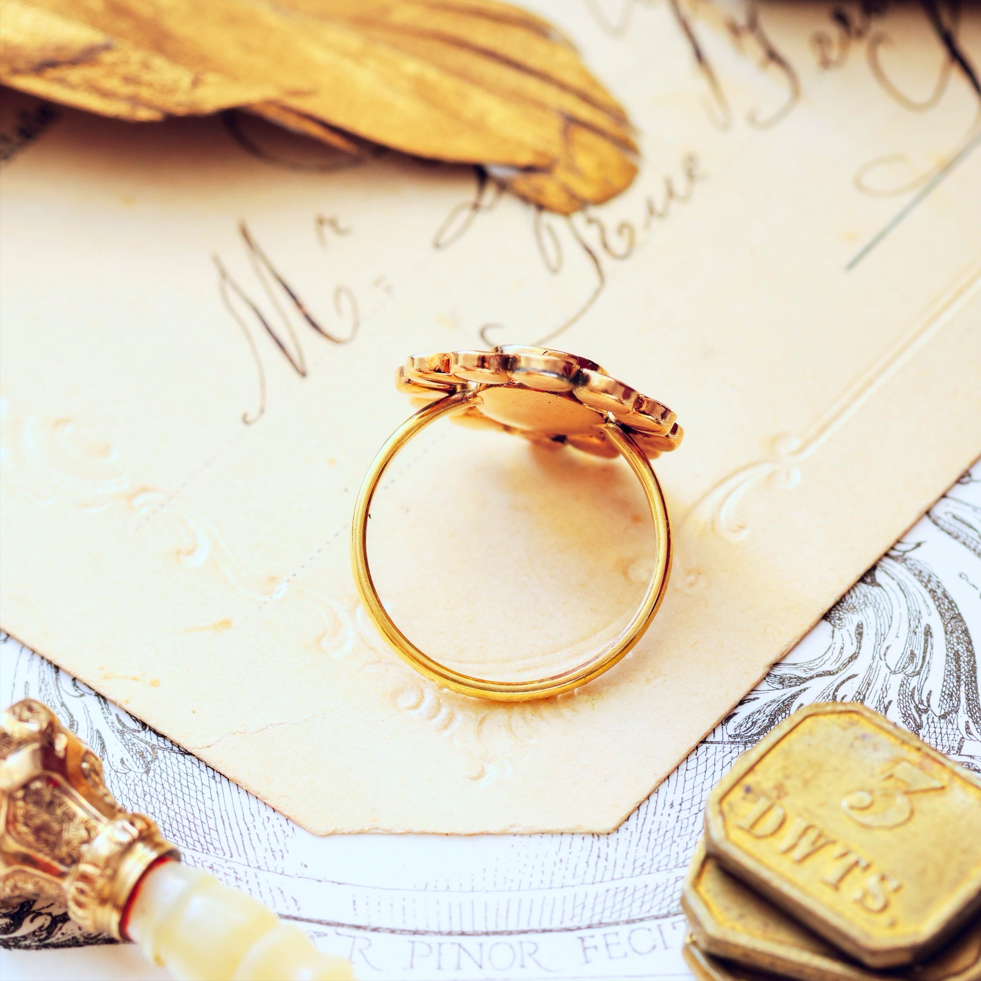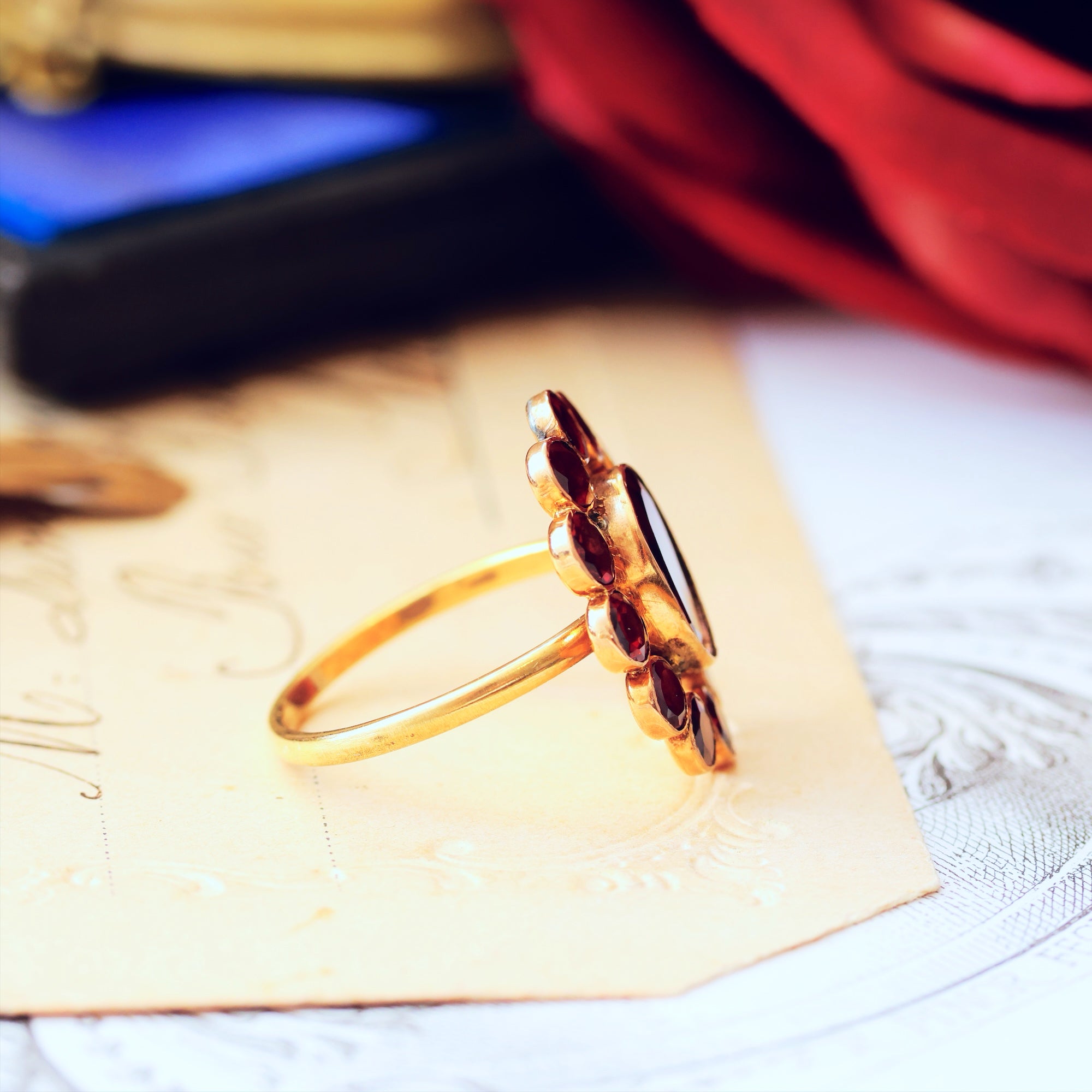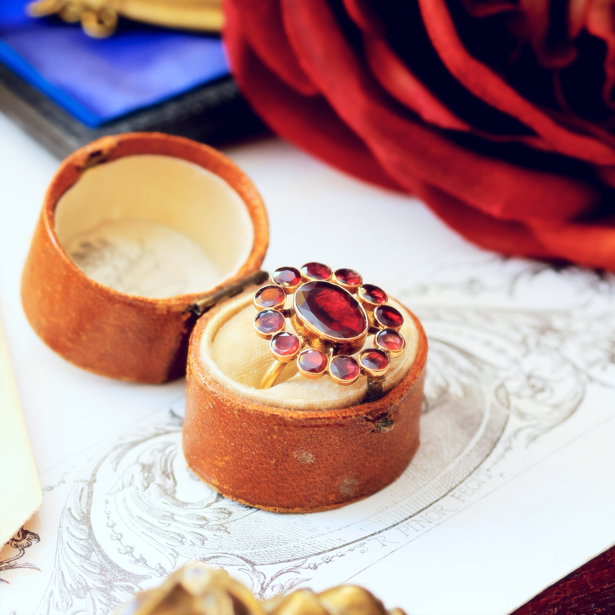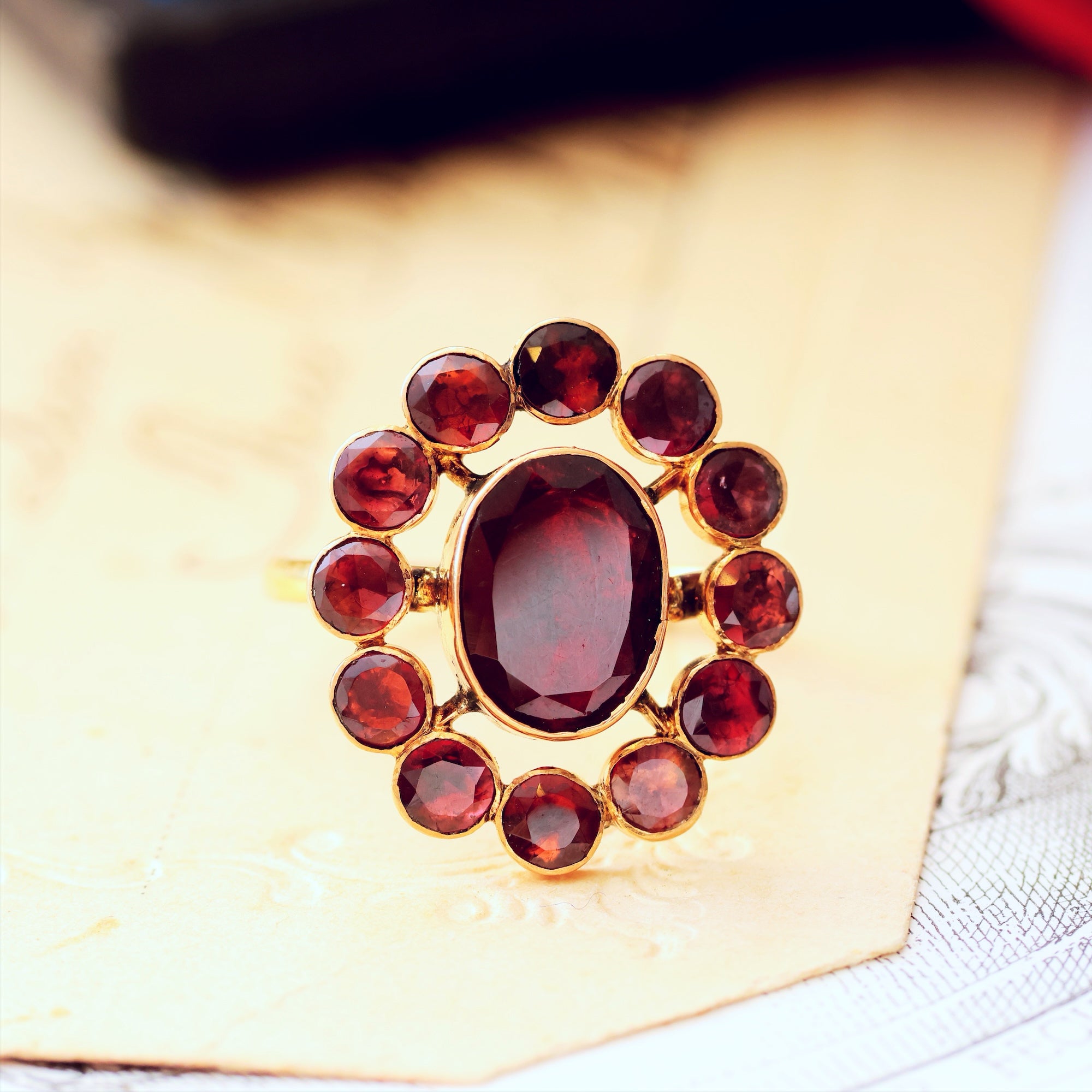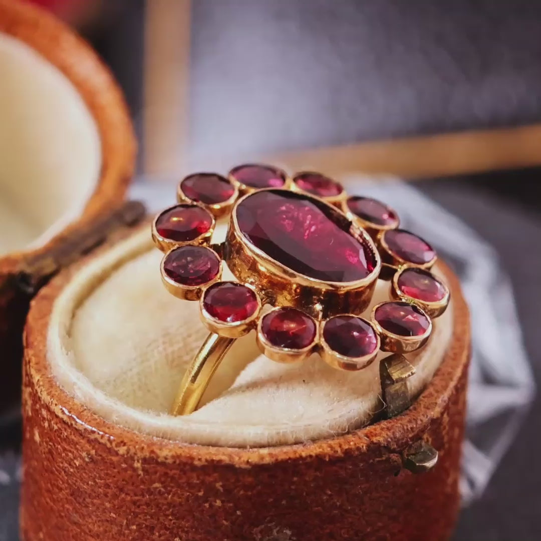 Circa 1800, a fragment of antique beauty; this ovalled rosette of glimmering Garnets is a most happy find! Capturing the opulence of Georgian society just so, it is a conversion from an earlier jewel, in which the slender 18ct Gold band to the ring has been added recently.