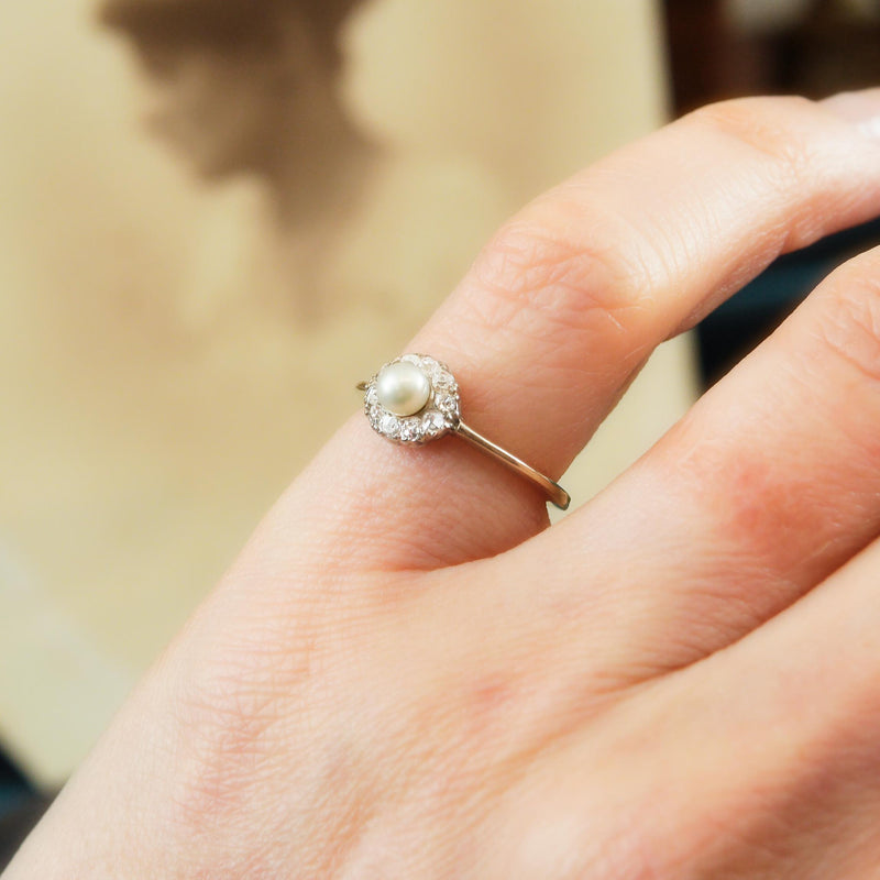 A Sweeet Little Hand Cut Diamond & Natural Pearl Cluster Ring