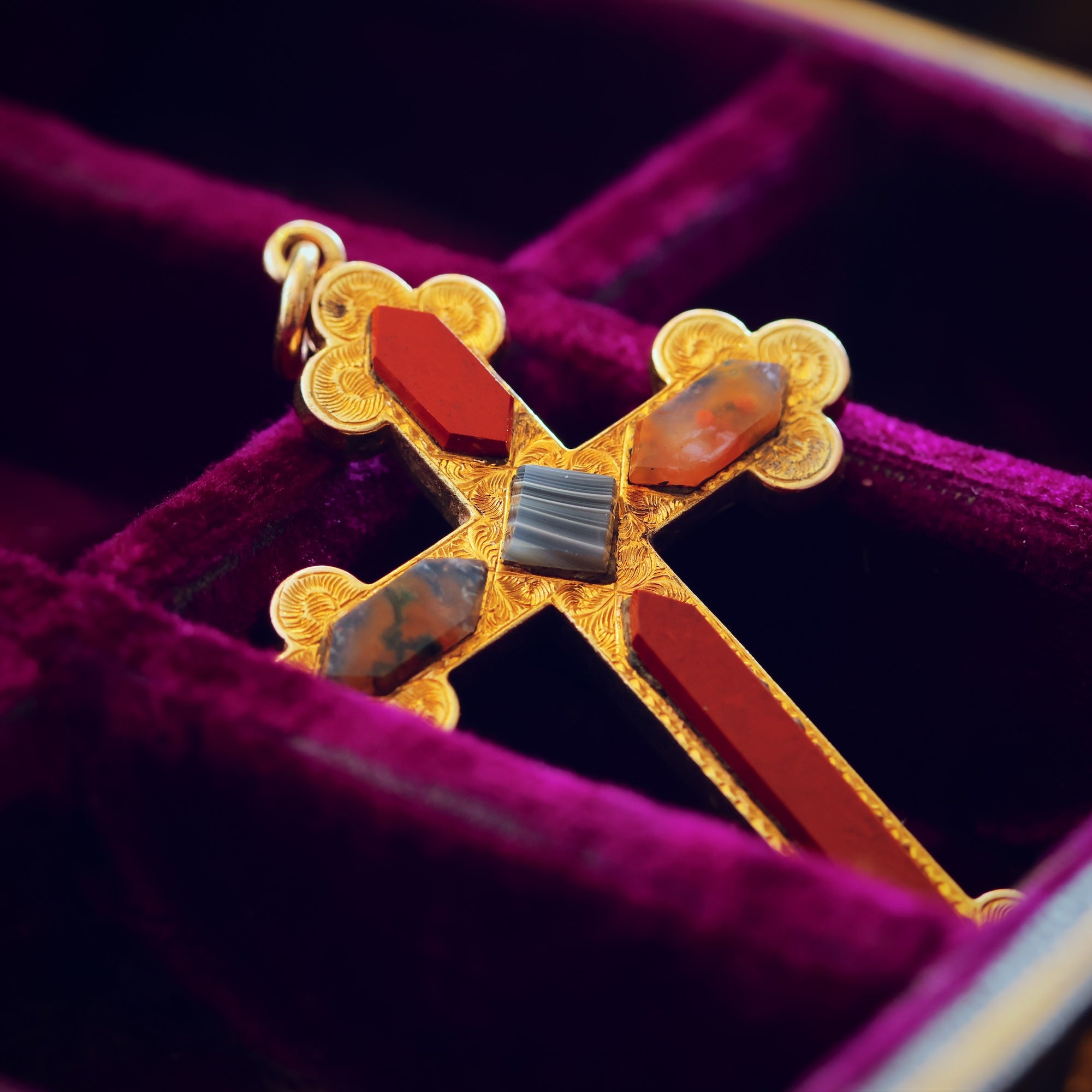A lovely piece for the collector, dating to circa 1850-60 and inspired by the design of a Celtic cross, a splendid hand crafted specimen Victorian Scottish Agate pendant. 'Scottish' Jewellery became very fashionable by the mid 19th century, popularised by the visits of Queen Victoria and Prince Albert to Scotland and after their purchase of the Balmoral Estate in 1852.