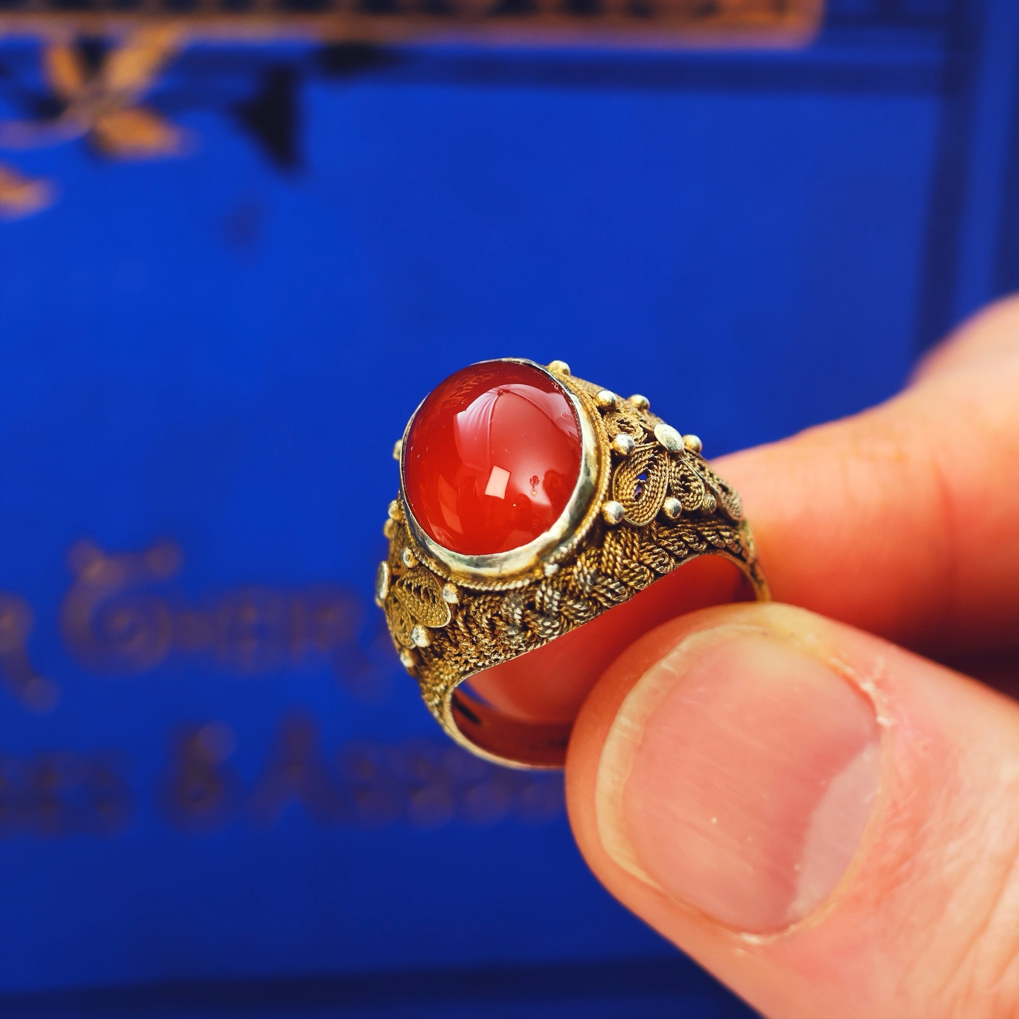 Dating to the 1920's/30's/40's, this incredible vintage ring celebrates a cabochon of natural Chinese Carnelian which is mounted in Gilded Silver bordered with extremely fine plaited and woven filigree. Traditional craftwork which has been honed to an exacting precision and artistry down the centuries, it is a true wonder!