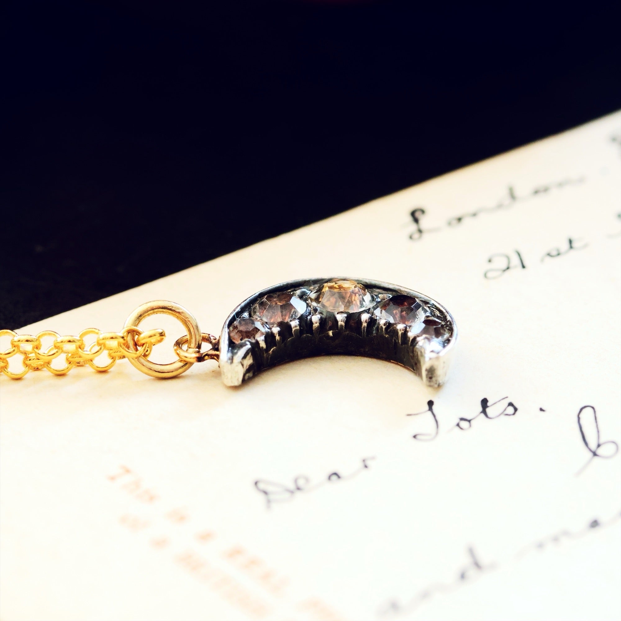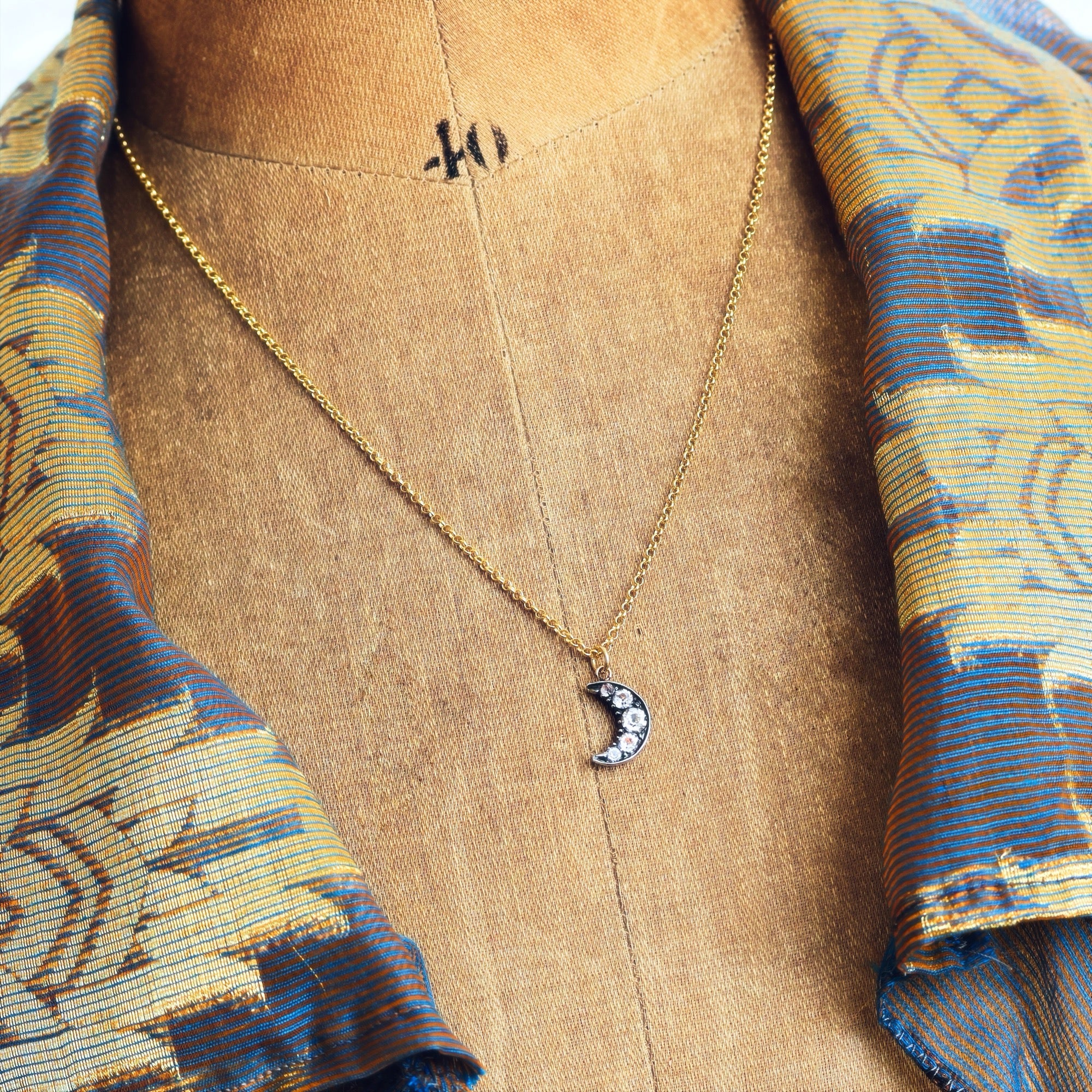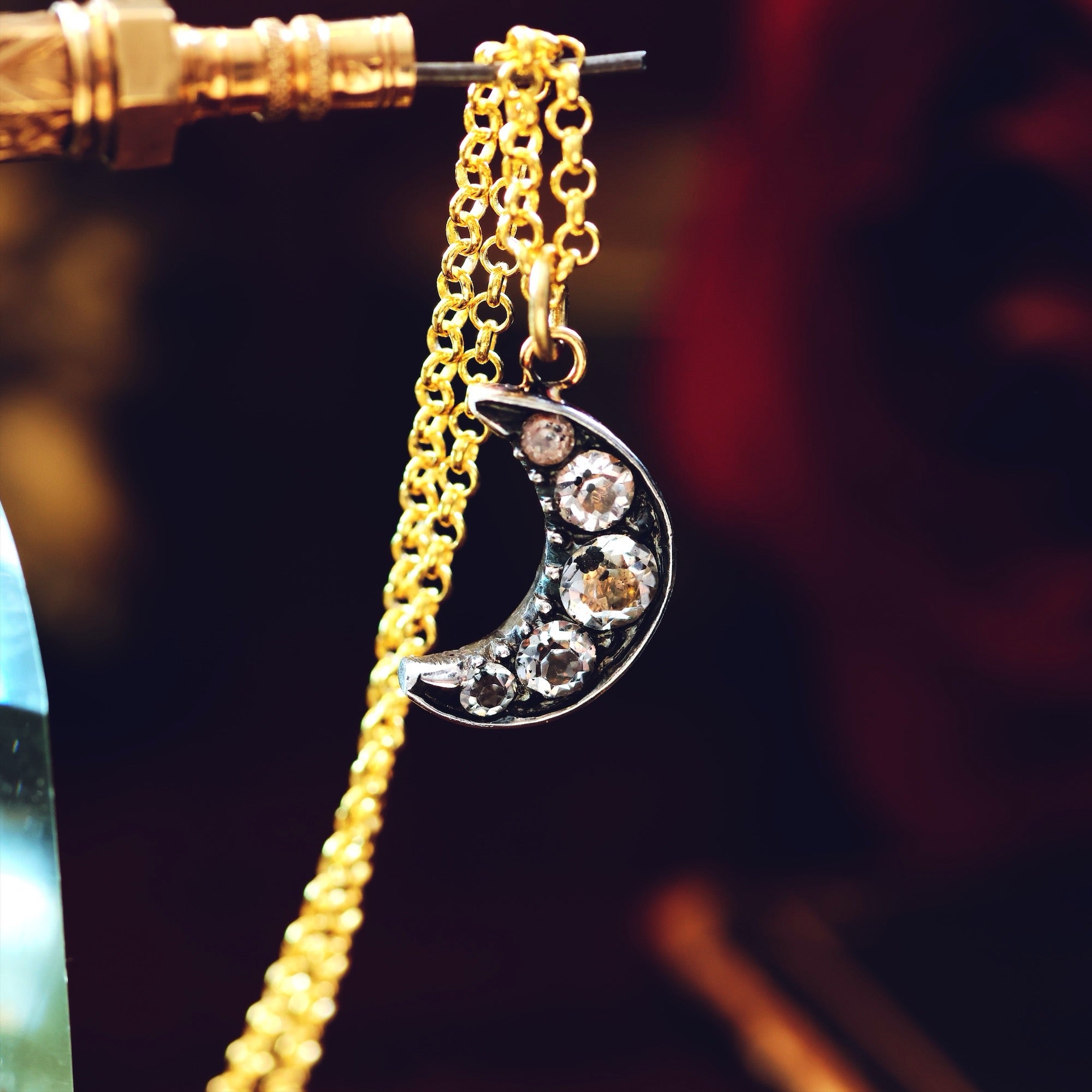 Upcycled in our workshop from a heavily leaded antique 18th century 'brooch' which itself had been constructed from older parts: likely once part of a larger jewel, this antique crescent moon pendant is a nicely special piece to welcome into your jewelbox. We have created a matched pair of crescents: one for the waxing, and one for the waning moon.