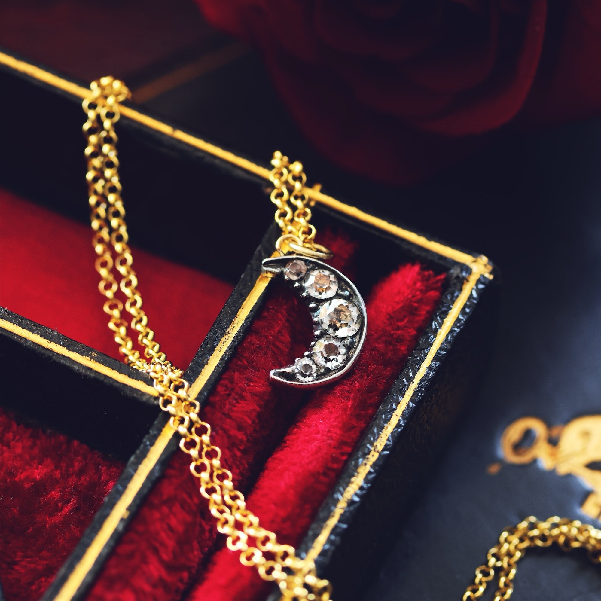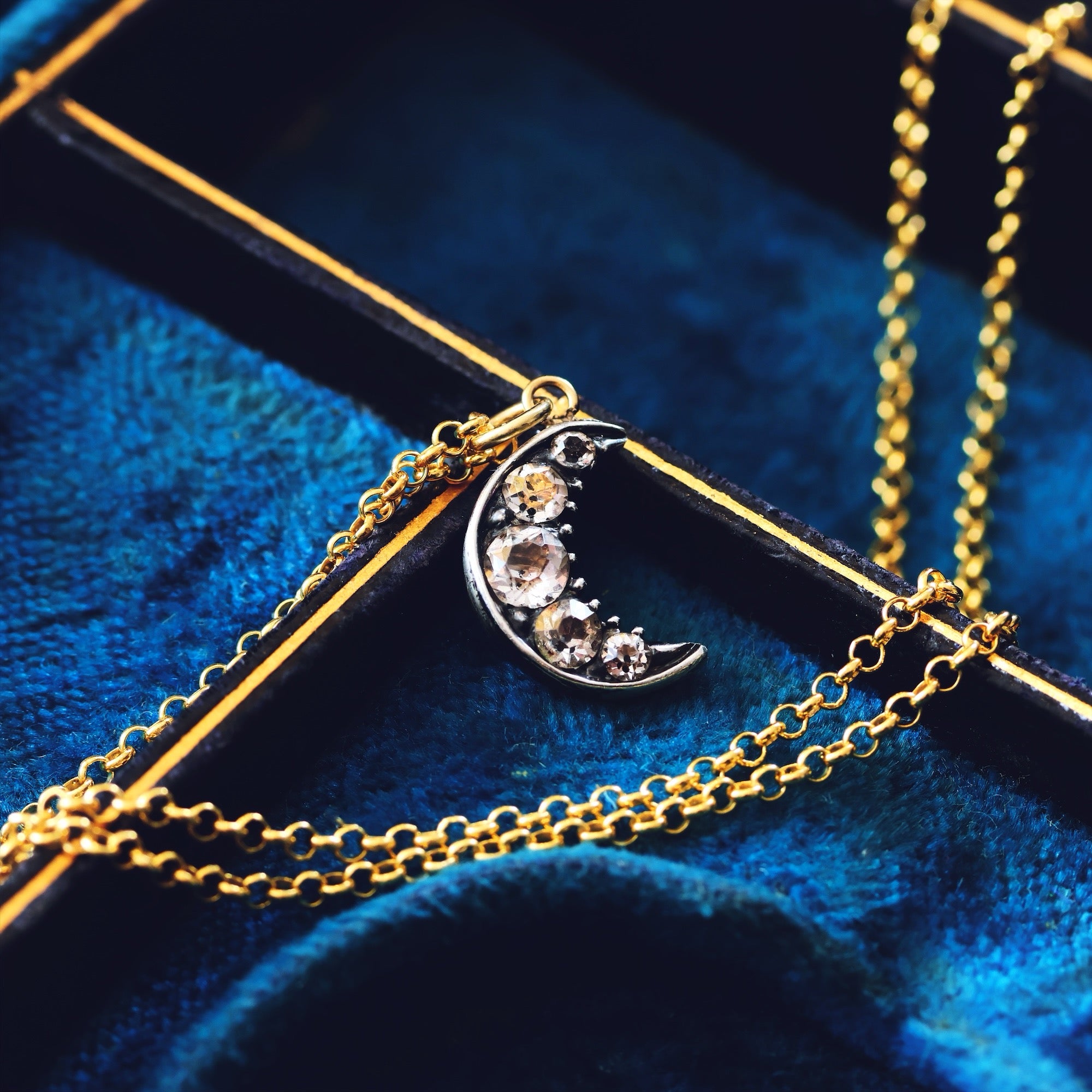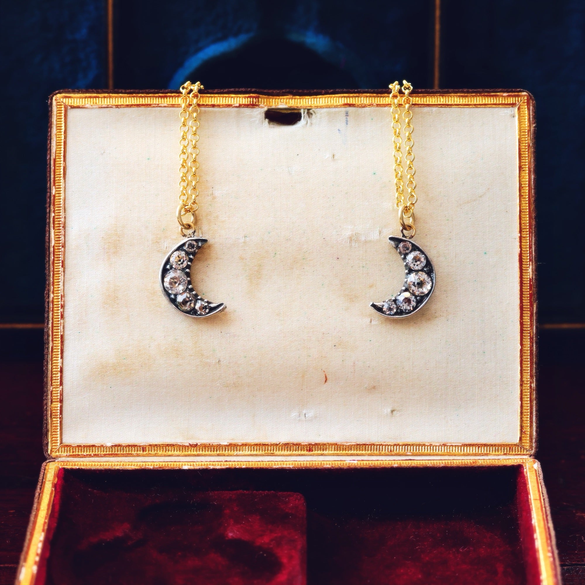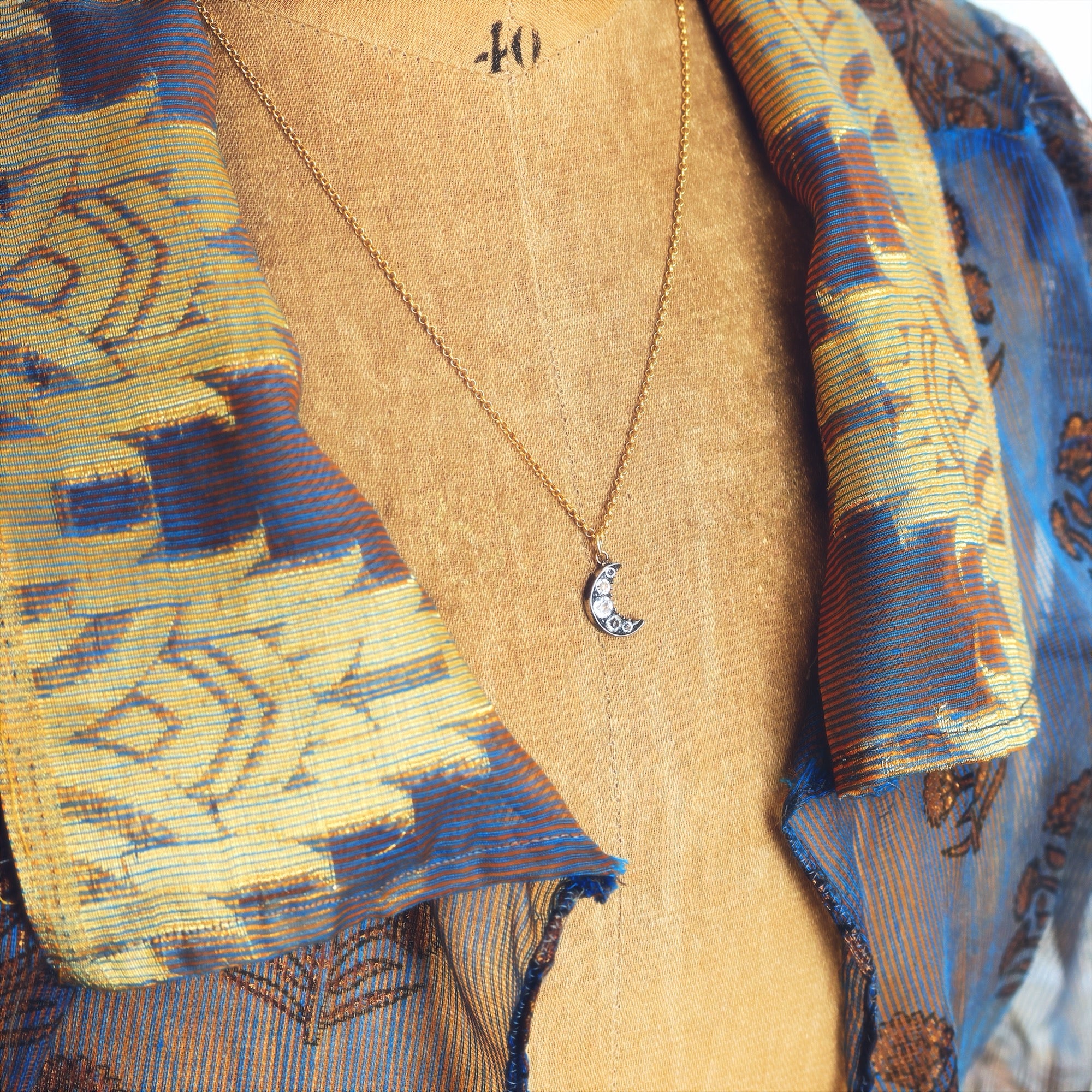 Upcycled in our workshop from a heavily leaded antique 18th century 'brooch' which itself had been constructed from older parts: likely once part of a larger jewel, this antique crescent moon pendant is a nicely special piece to welcome into your jewelbox. We have created a matched pair of crescents: one for the waxing, and one for the waning moon.