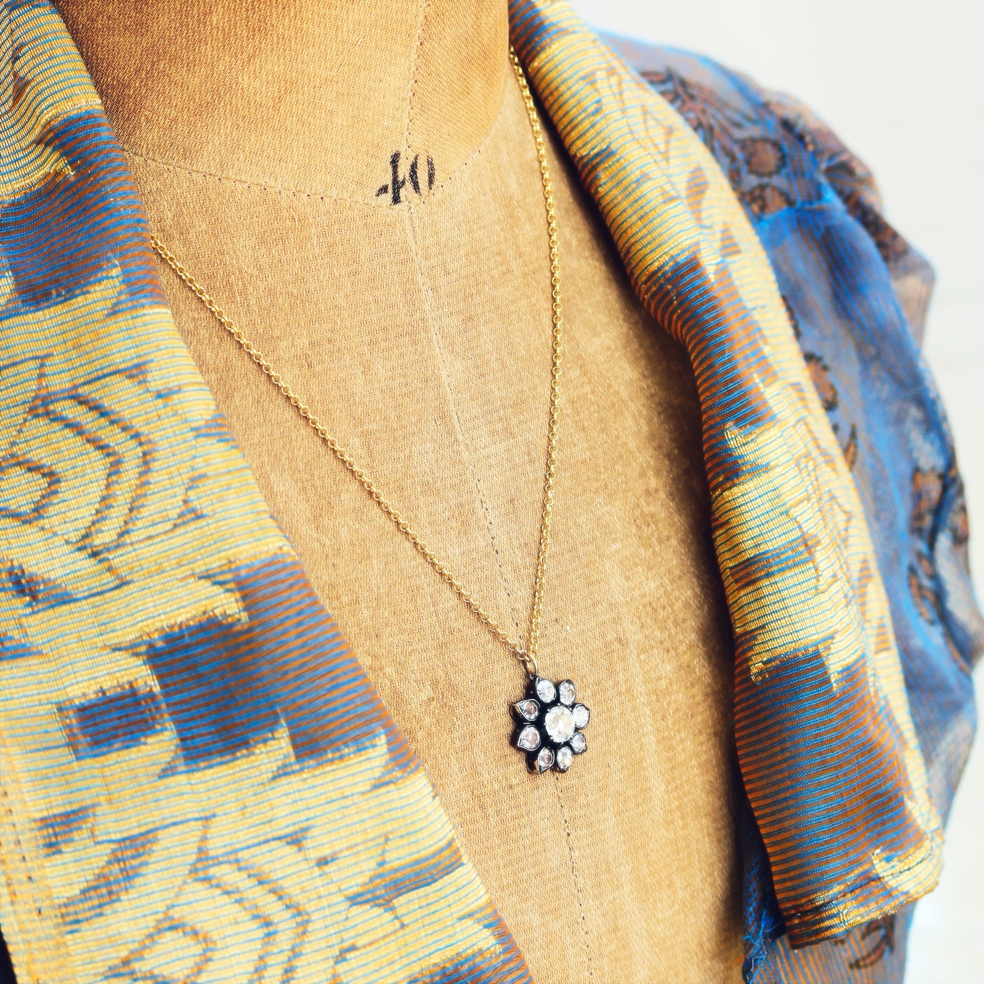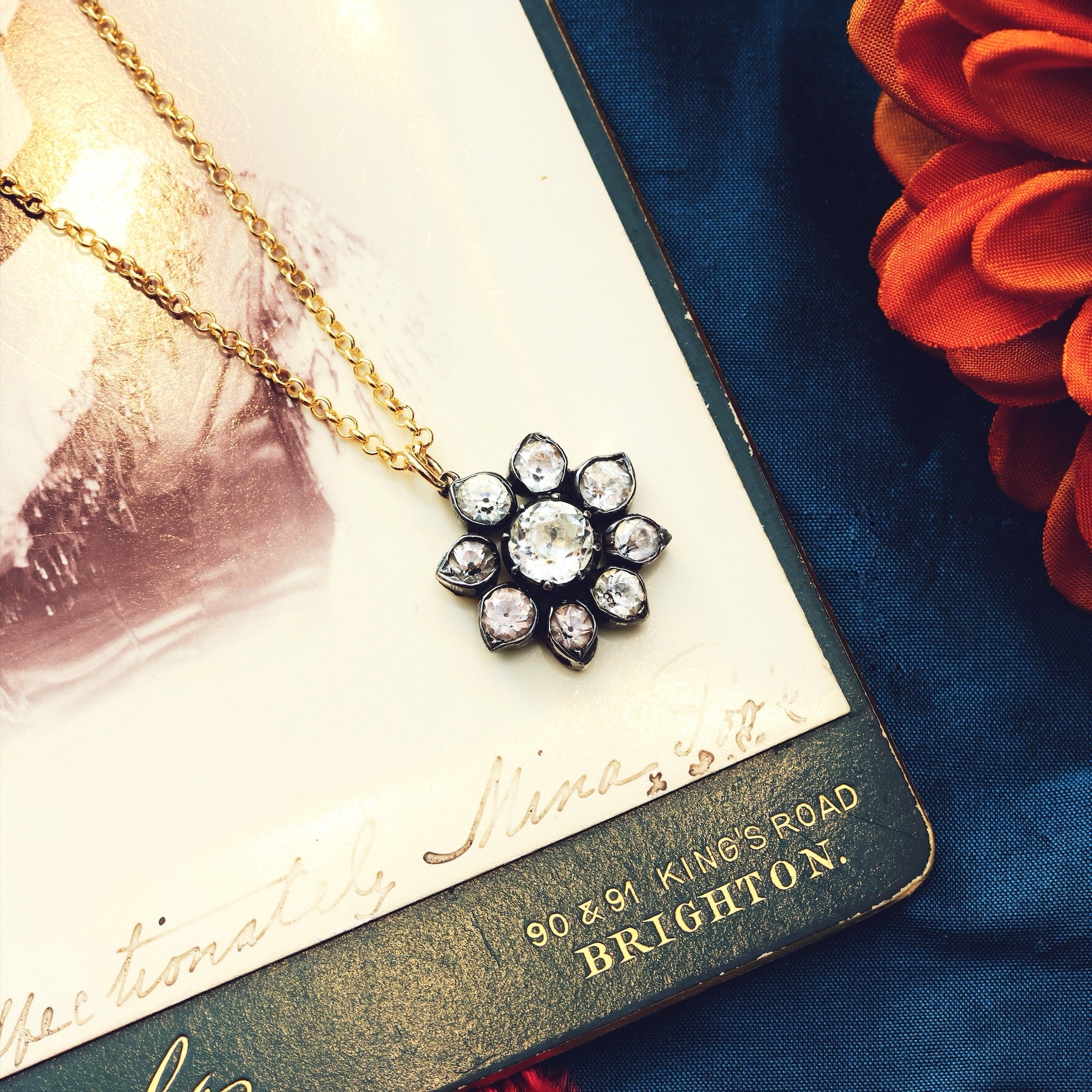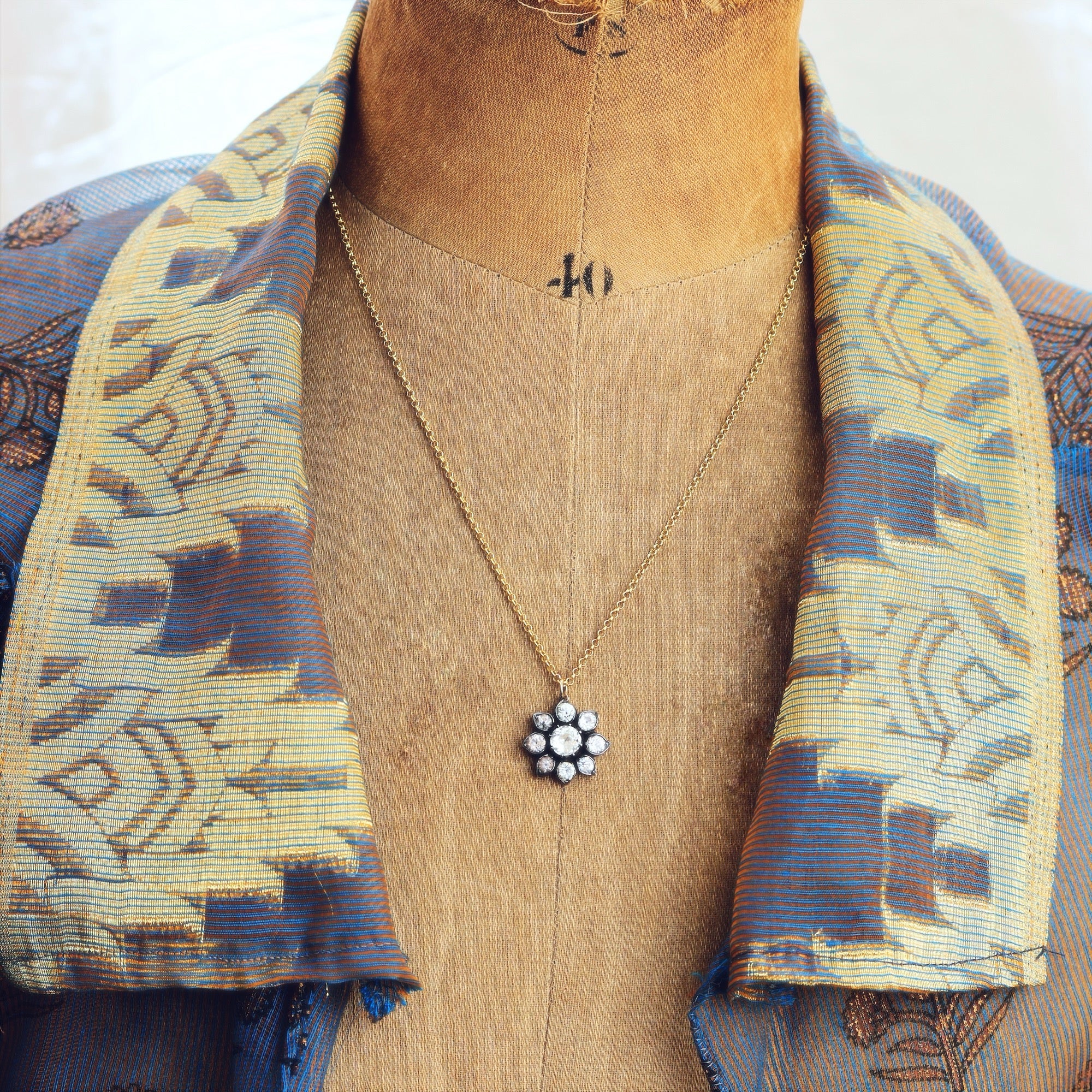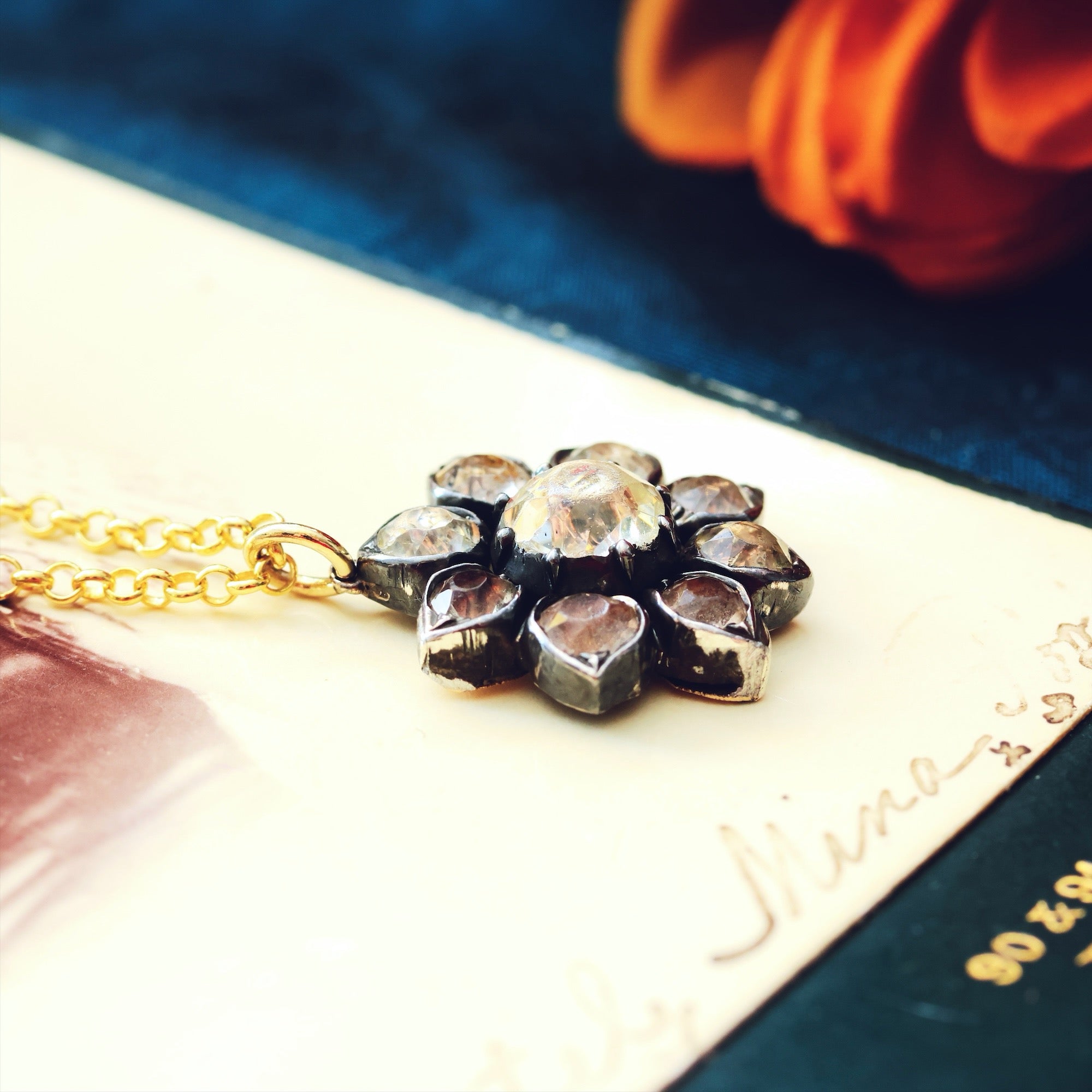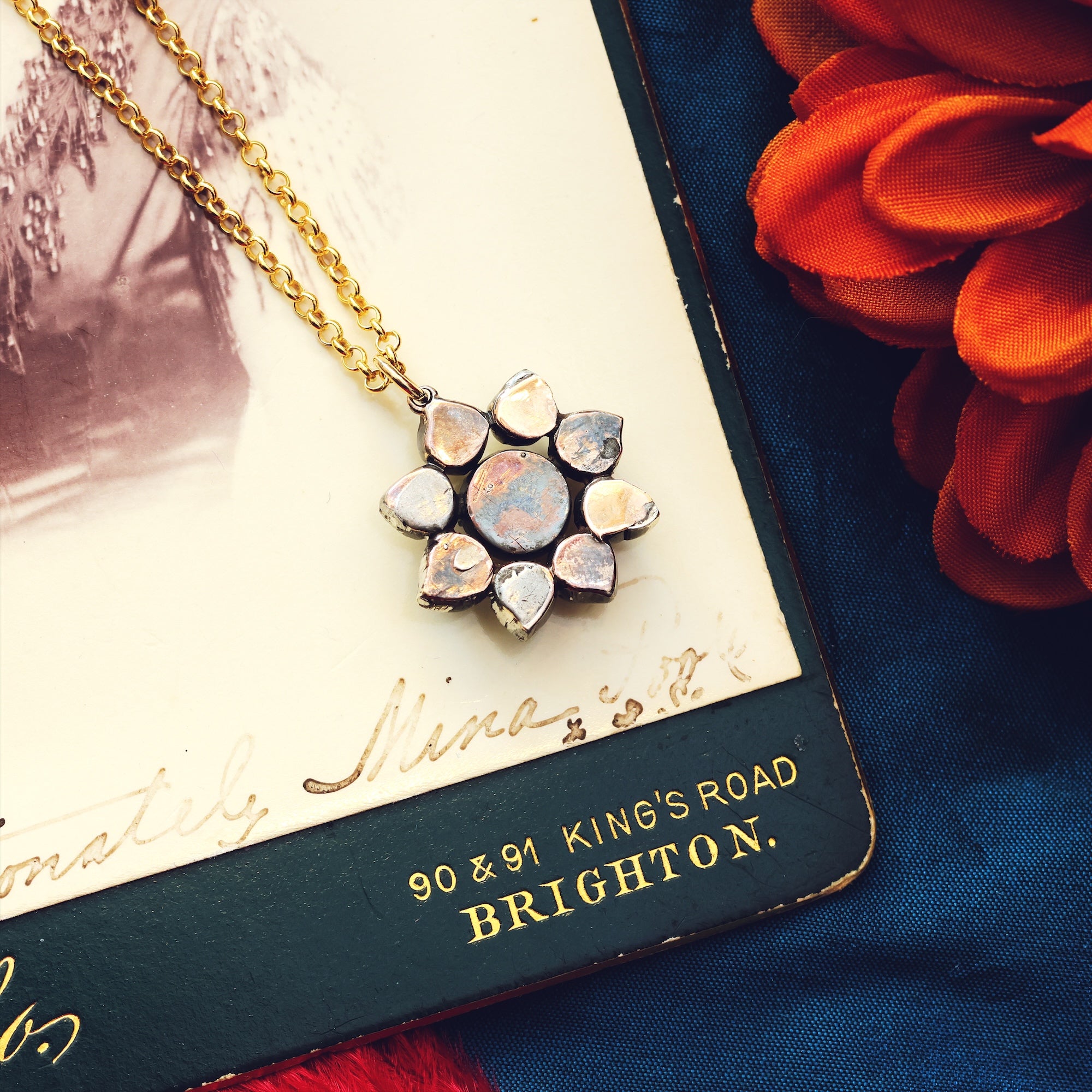 Upcycled in our workshop from a heavily leaded antique 18th century 'brooch' which itself had been constructed from older parts: likely once part of a larger jewel, this antique Rosette pendant is a nicely special piece to welcome into your jewelbox.