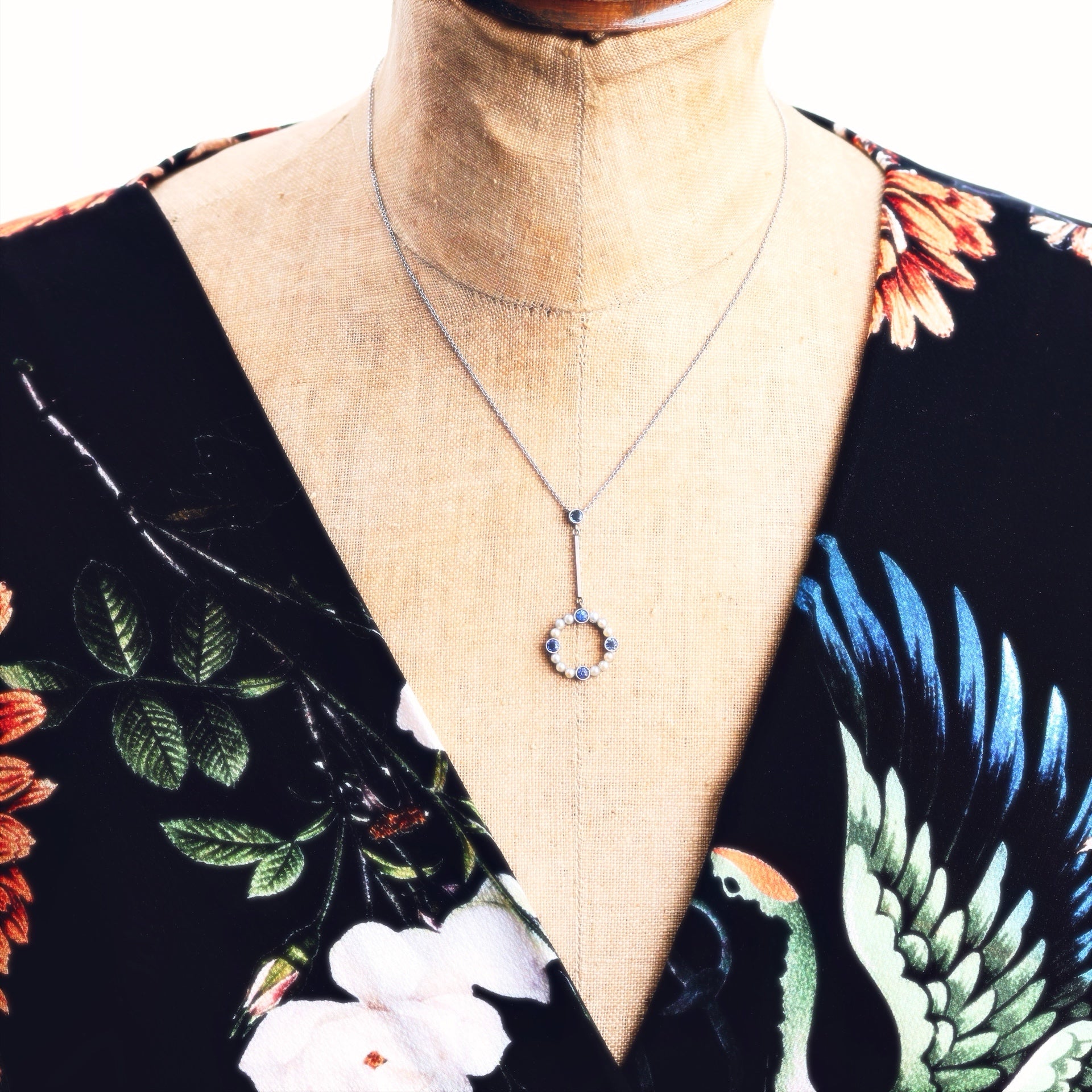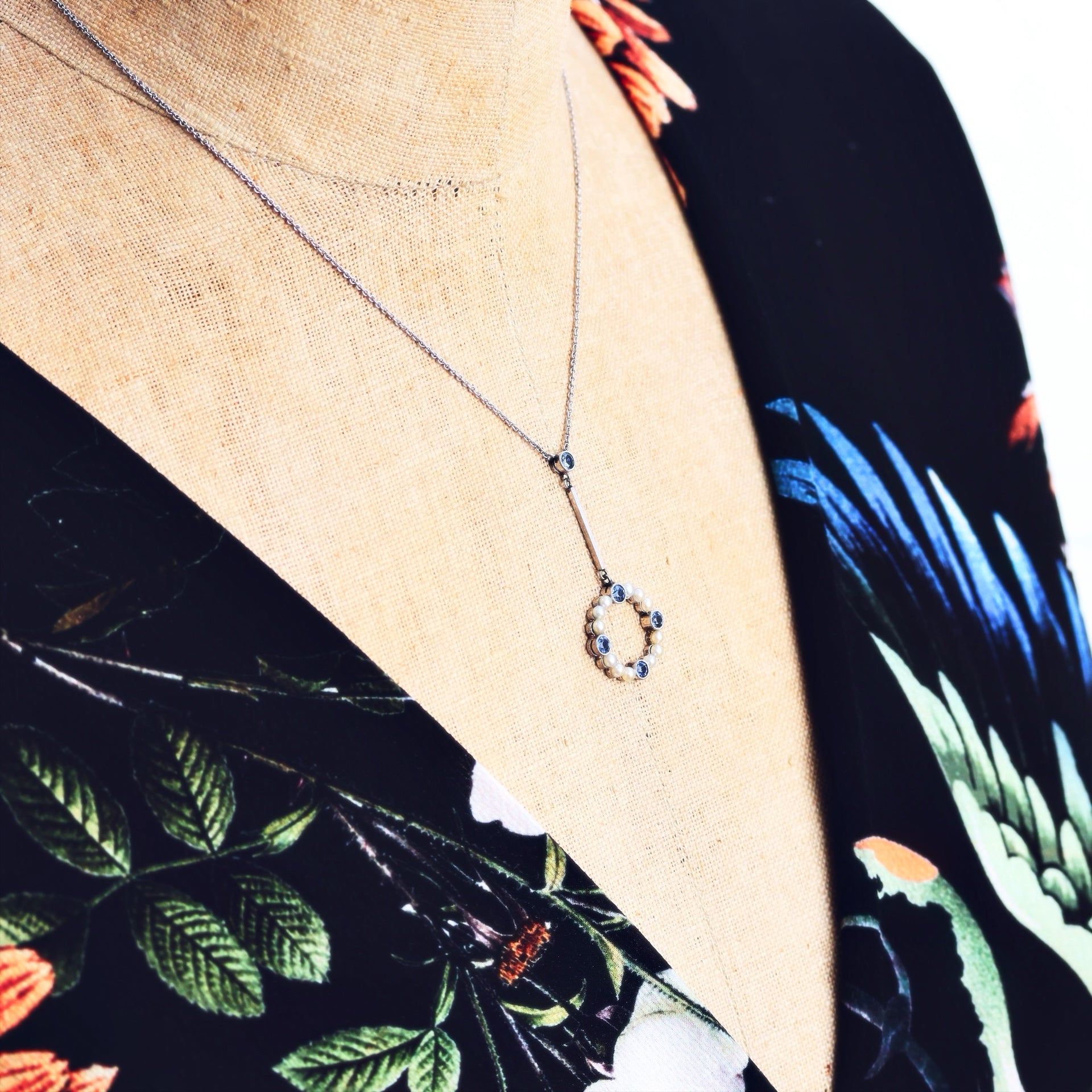 A most special and superior quality antique bright twinkling blue Sapphire and Seed Pearl pendant in the refined and precise version of an Edwardian style which was the ideal amongst British jewellers circa 1910. Skilfully crafted in platinum to a beautifully balanced symmetry reflecting nature's inspiration in the floriate design. Adorable! Light and lovely to wear, the sparkly Sapphires likely hail from old mines and the wonder of the teeny wild Pearls add a touch of sweetness...