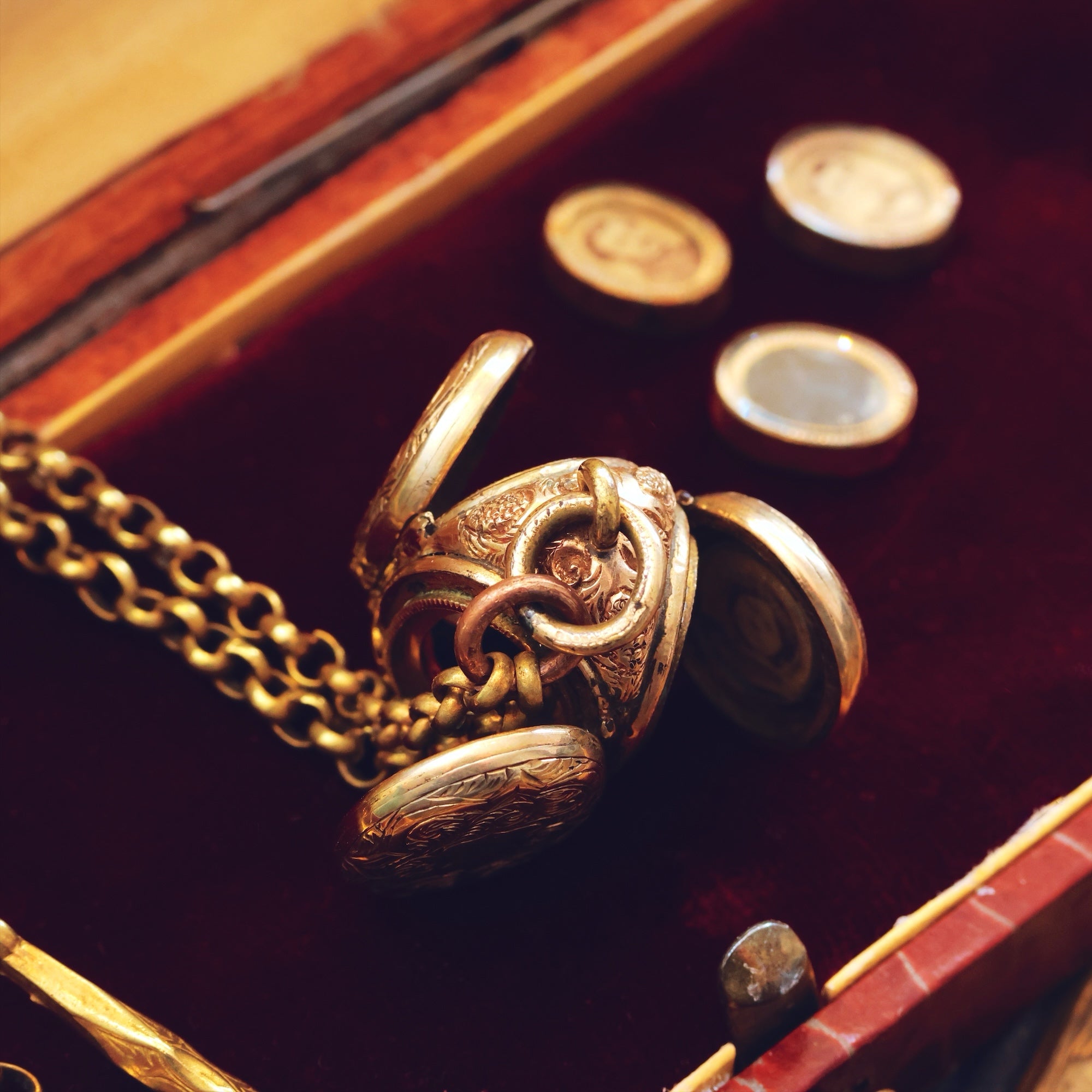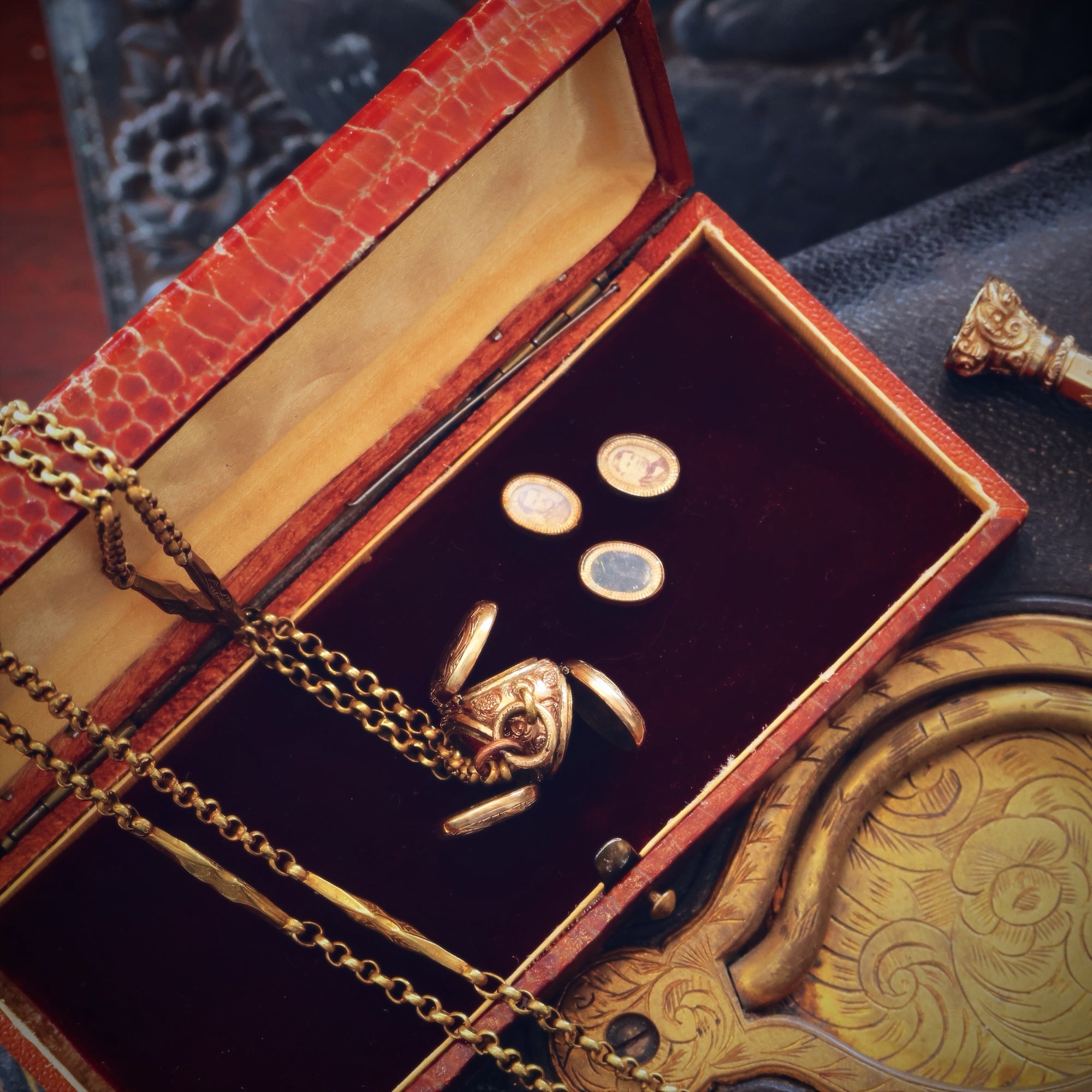 Are you of a Gothic turn of mind? Would your family like to share a place in this antique locket with a trio of individuals long past? If so, please consider this rare and unusually pomander shaped family locket which dates to around the 1860's and boasts a matching guard chain.