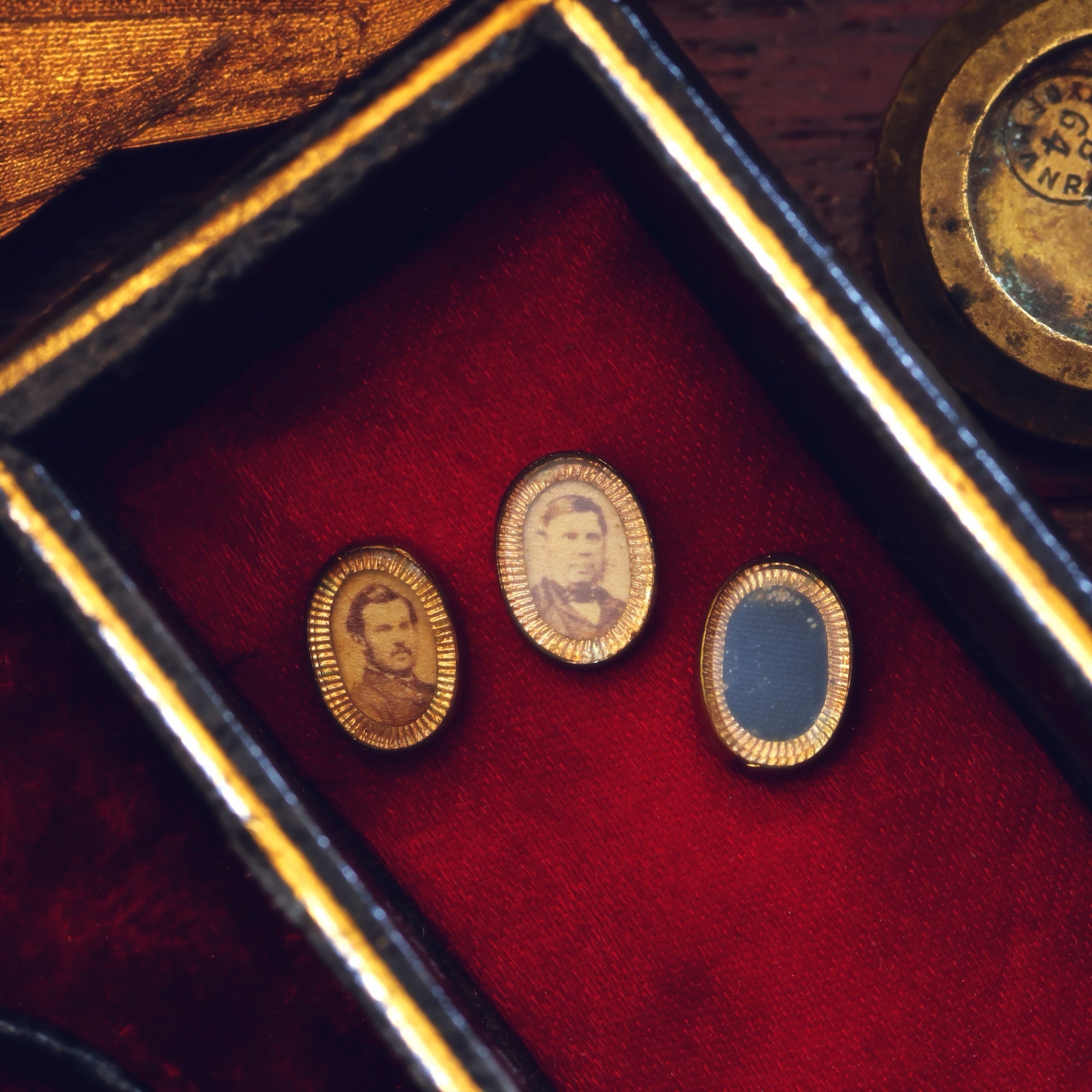We always hope when selling an antique locket that the new owner will simply place their new photographs over the older ones, preserving their story; however in this case it is a slightly different situation... on opening the three tiny doors, miniature oval shaped glassed apertures are revealed. Of the six in total, we have three spots available: the remainder are wedged tightly in and try as we might, we can't budge them.