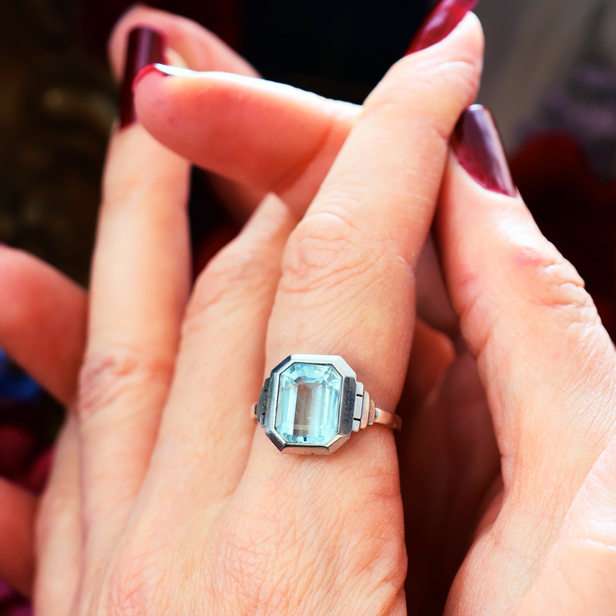 A gorgeous vintage Art Deco Aquamarine ring originating in France and a super of example of the angular style which was so fashionable in the 1920's/30's and remains a classic today. With sleek lines and neatly stepped shoulders around the large sea blue gemstone, all is skilfully crafted. A dress ring rather than for every day as the setting is of Silver, this piece is an unusual and striking find.