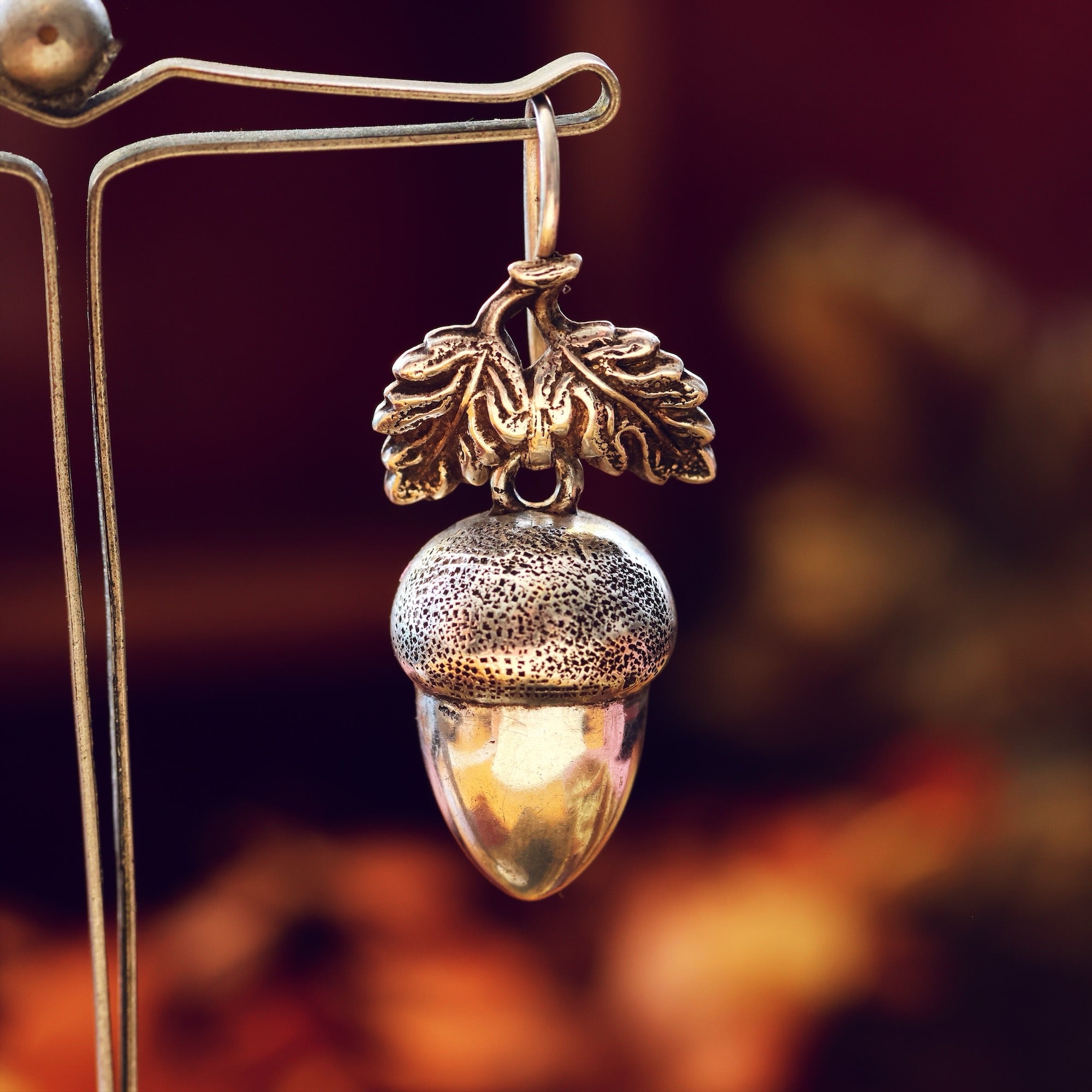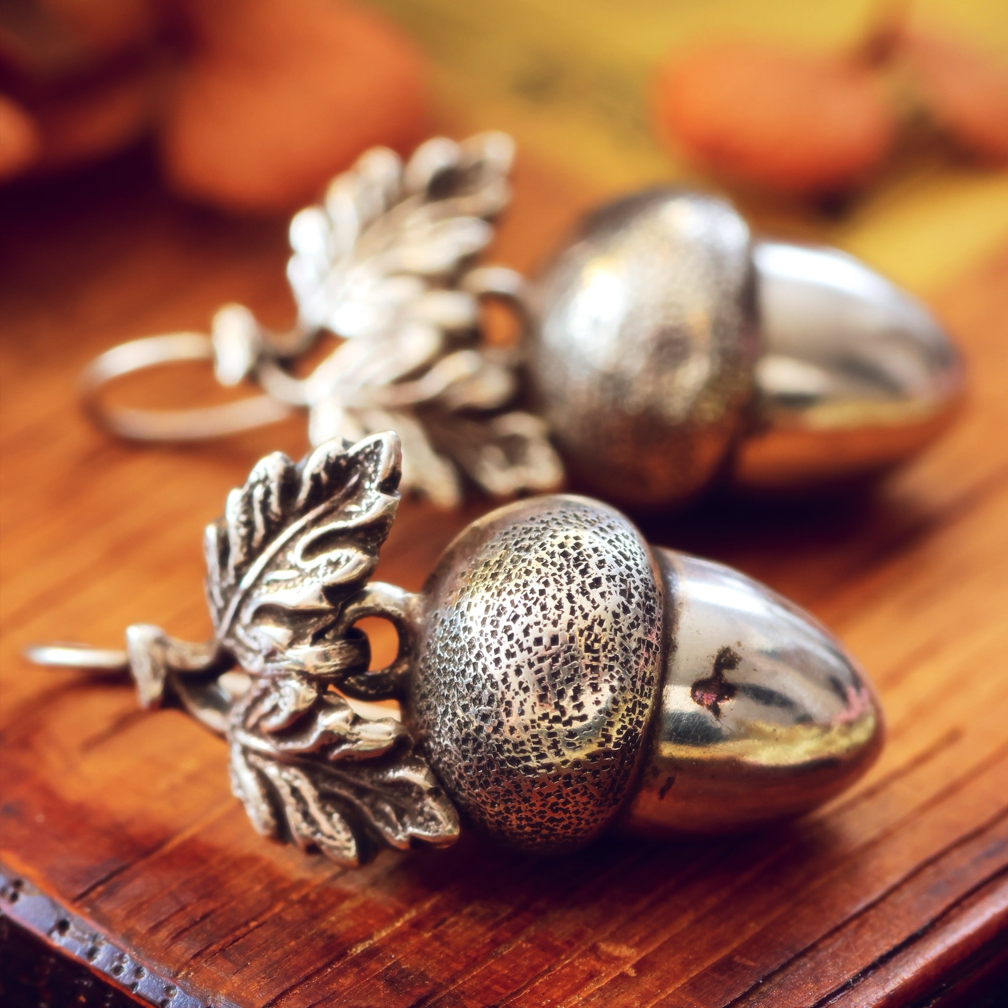 Circa 1880's, an enchanting pair of antique Silver dangle earrings in the form of Acorns with leaves above. A symbol of fertility and perfect for Autumn/Fall or with a significance for a gardener, these are a scarce find. Nicely light as they are hollow, of pressed construction and likely made in Birmingham, the great jewellery centre at that time.