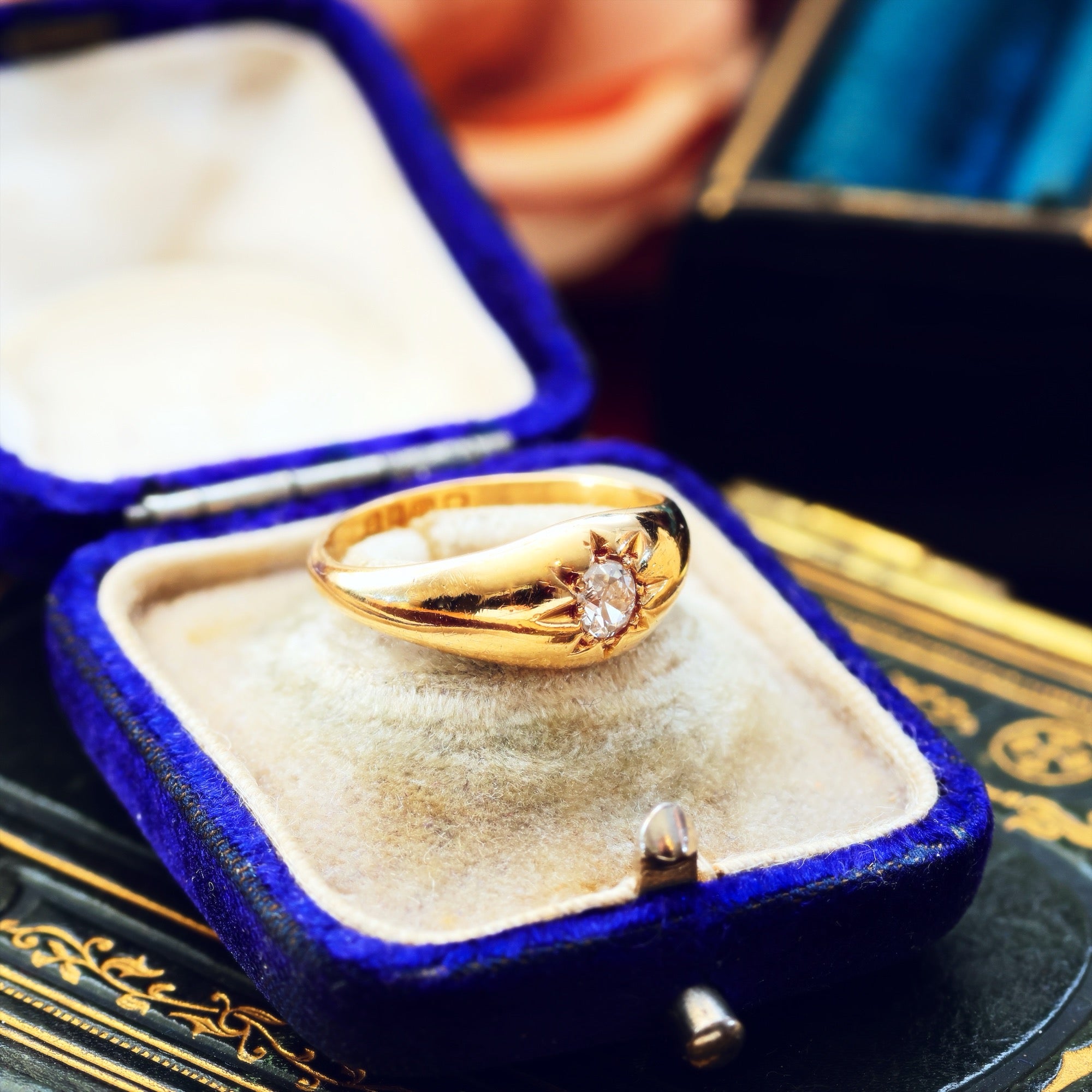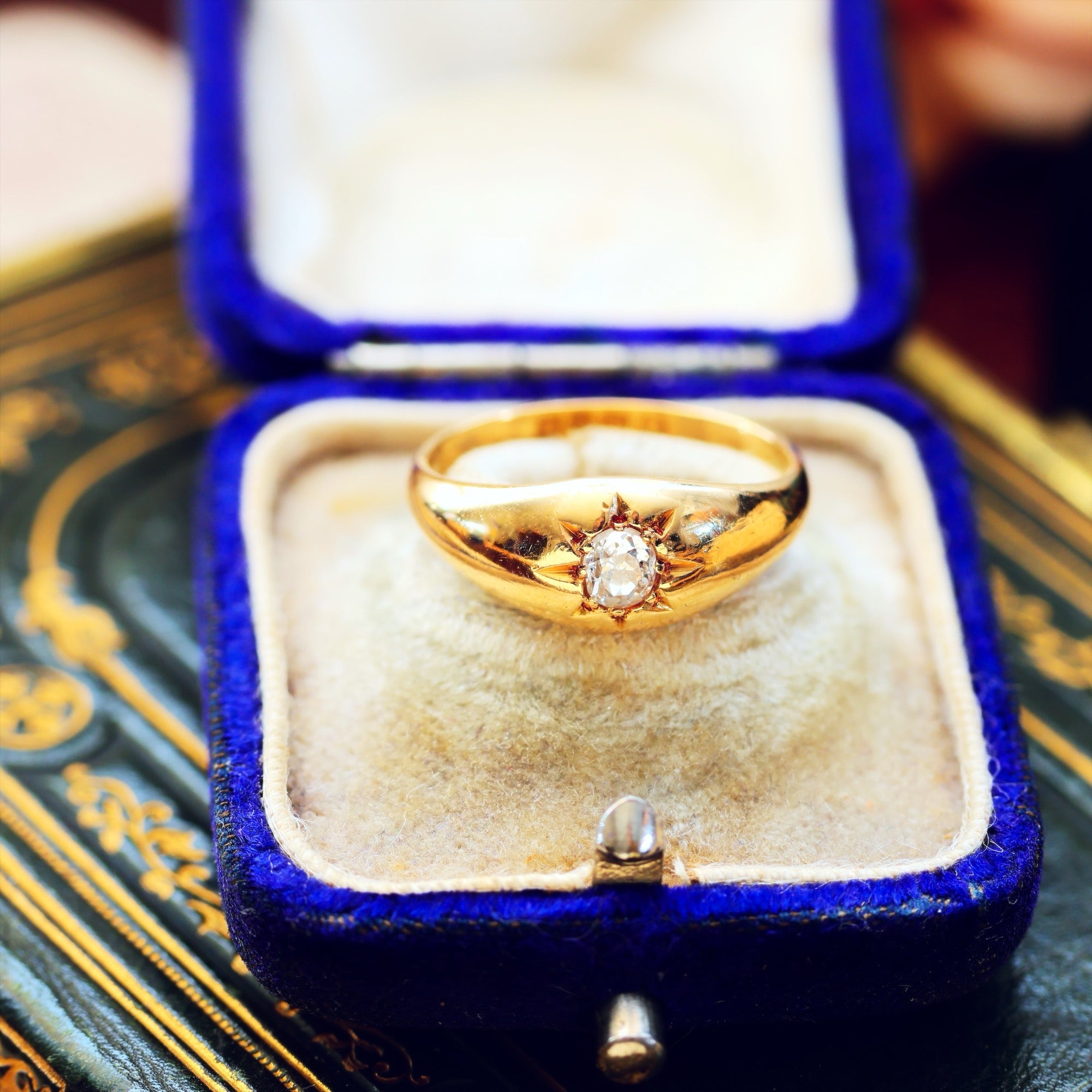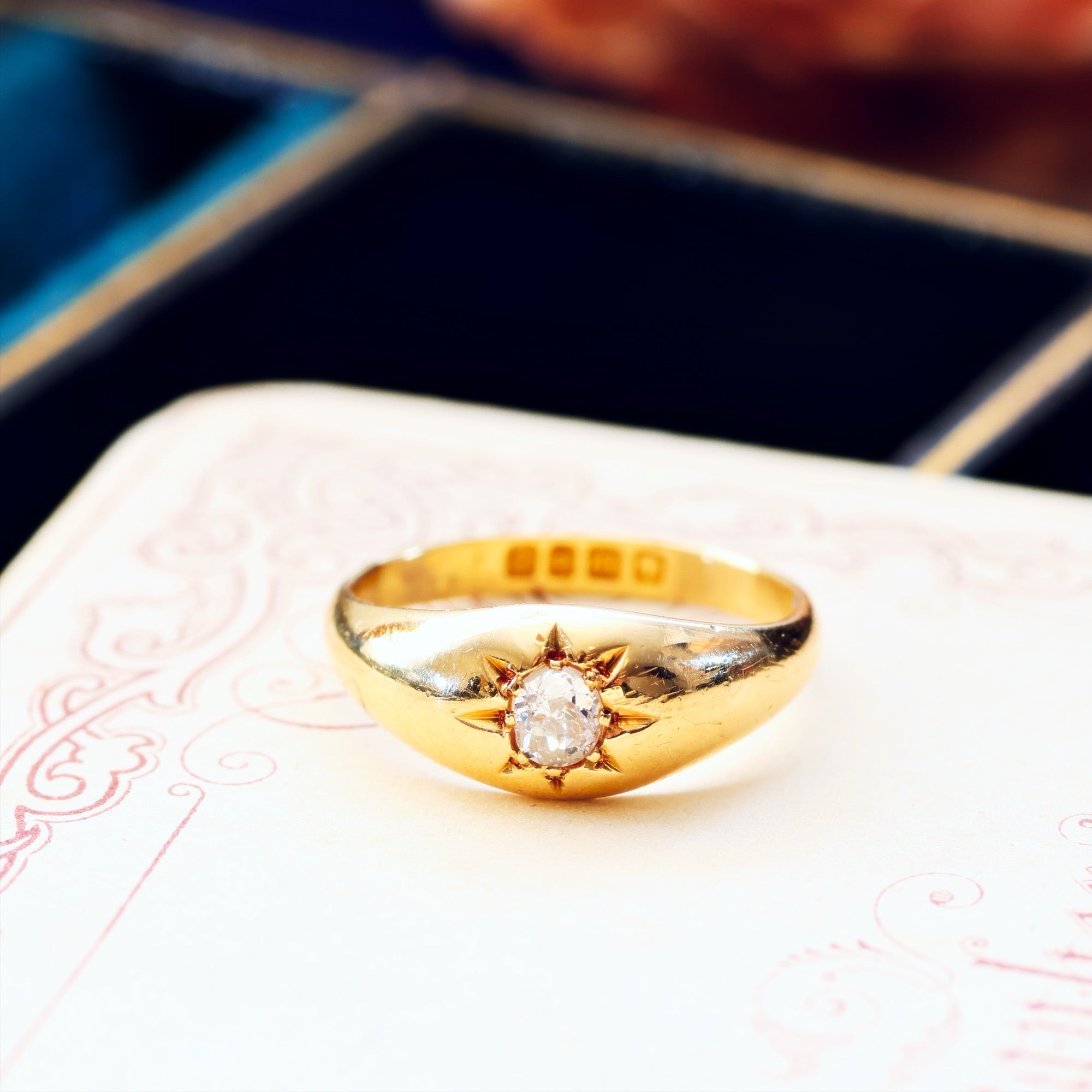 A darling little antique gypsy set Diamond ring dating to 1915 and in gorgeous condition. The old Diamond is a slightly oval shape and was cut by hand in the old mine way with larger facets and a great charm which carries a gentle sparkle down the years. The starred setting was known at the time as a 'Gypsy' style; we believe to reflect the idea of fortune telling and our futures as shown in the stars... the elegantly tapered shape feels familiar and beloved on the finger and we know her next owner will appreciate these thoughts and feelings as we do.