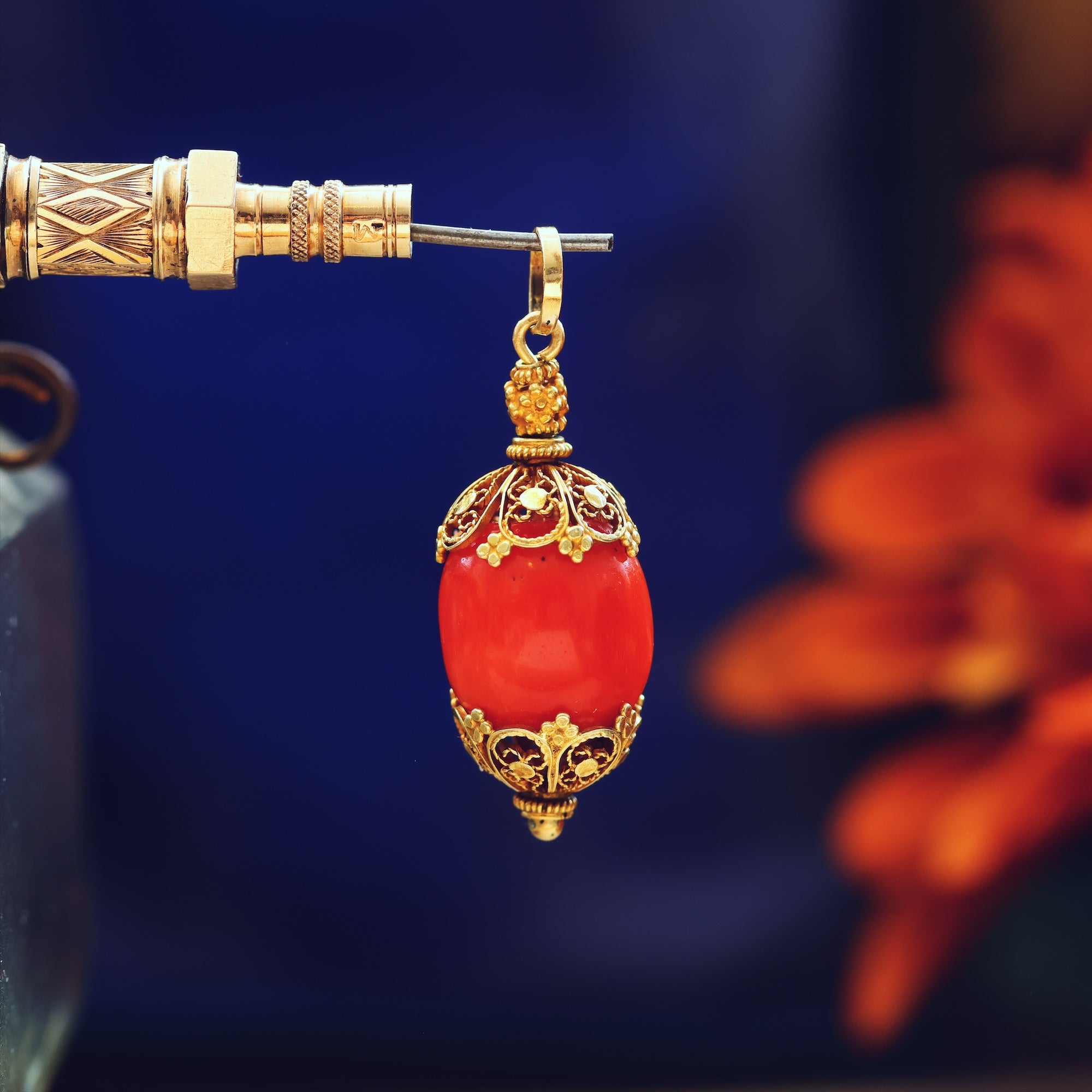 A unique one-of-a-kind antique filigree mounted natural red Coral pendant likely of Portuguese origin and entirely hand crafted. Shaped somewhat as an acorn, the delightfully fine hand spun filigree forms miniature flowers and 'grainti', an ancient technique traditional to the Mediterranean countries.