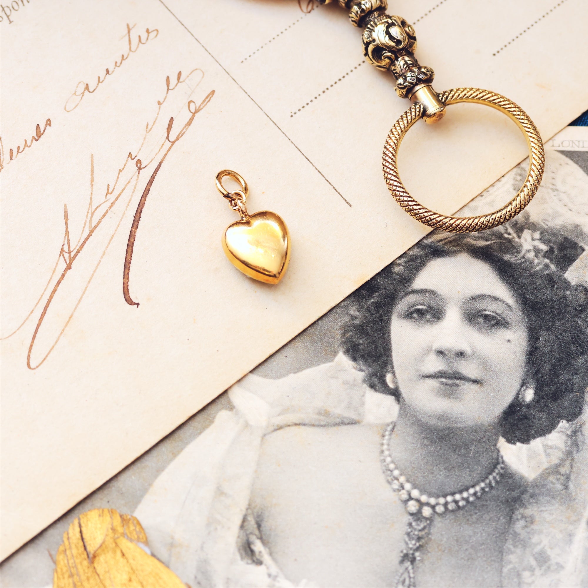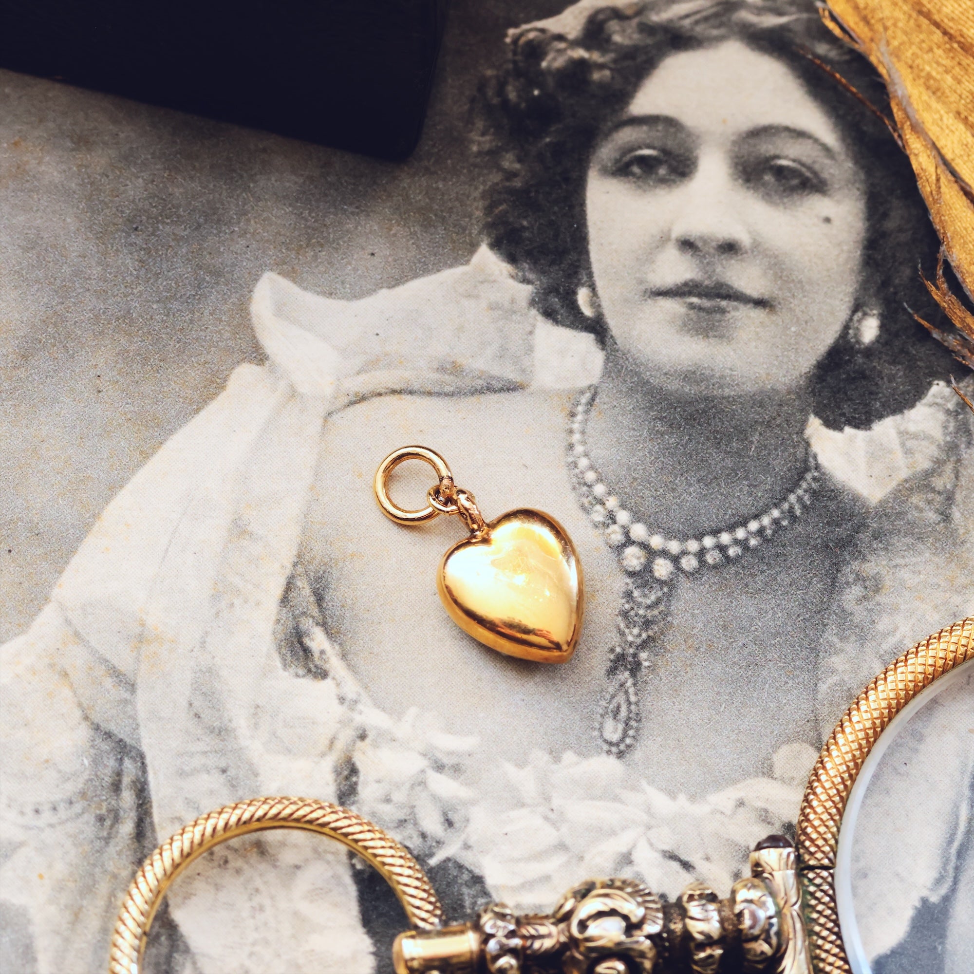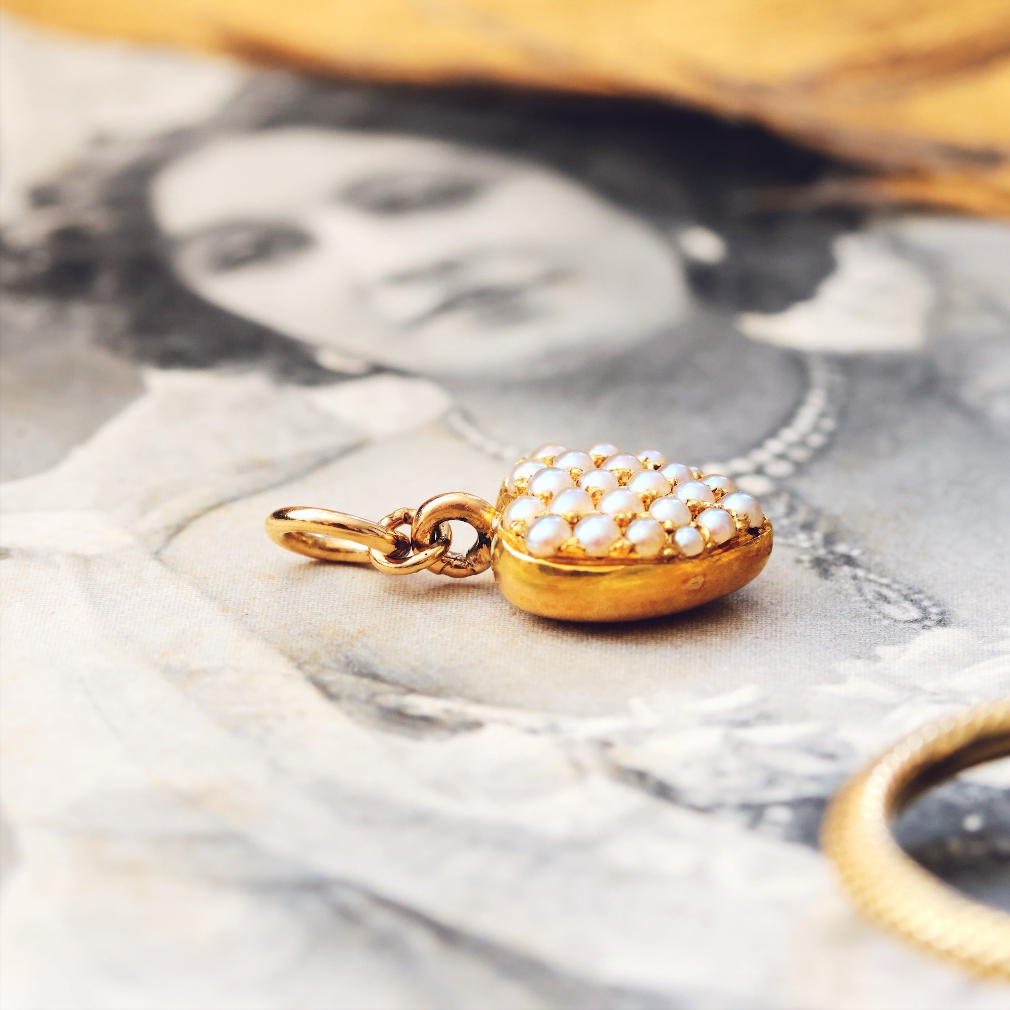 Circa 1890's an antique loveheart shaped 15ct Gold and wild Sea Pearl charm or pendant, perfect as a keepsake reminder of the beauty of love. Hand set with great care, the lustrous prettiness of these mini Pearls is so charming; a delicate oyster pink/grey shade reflecting the inside of the original shell...