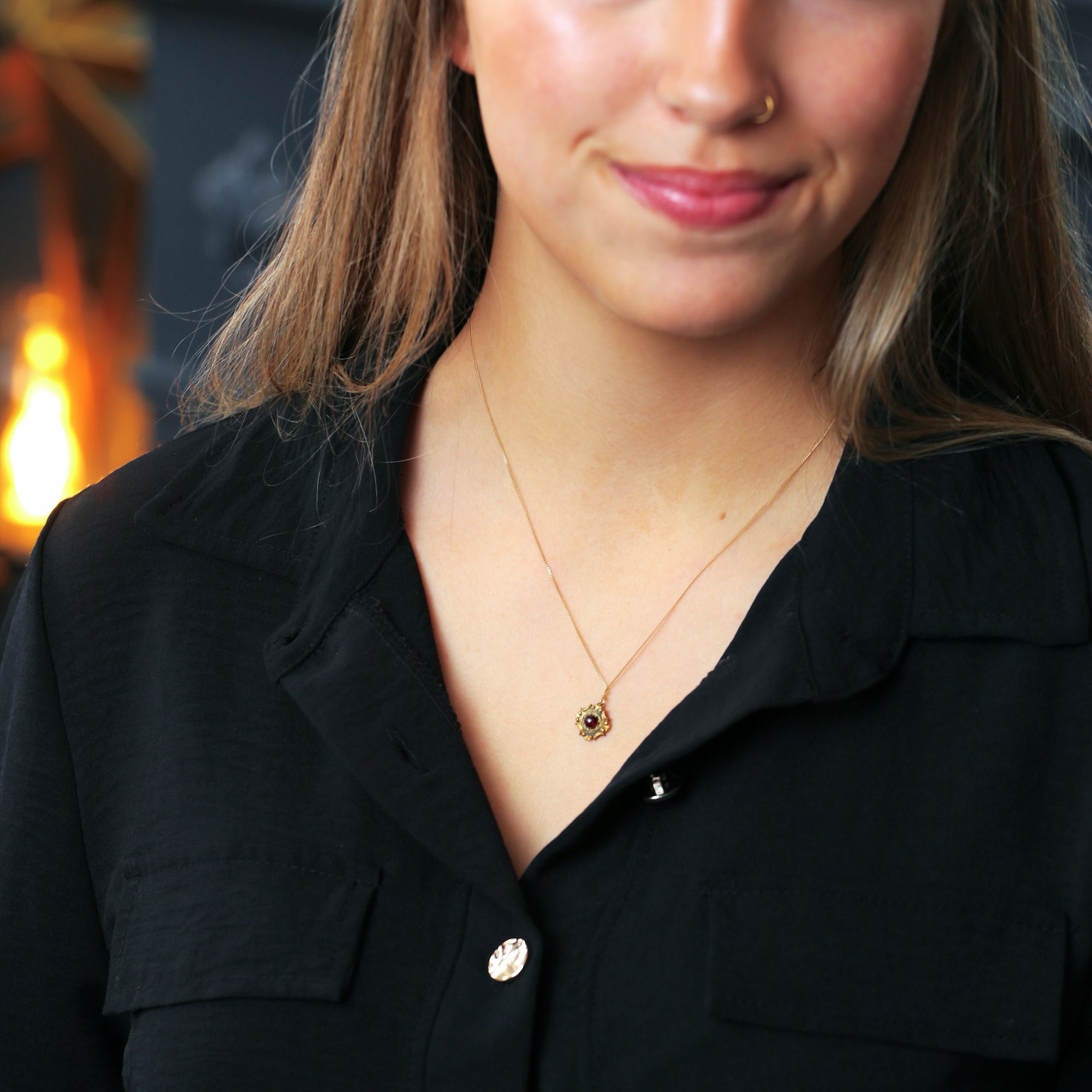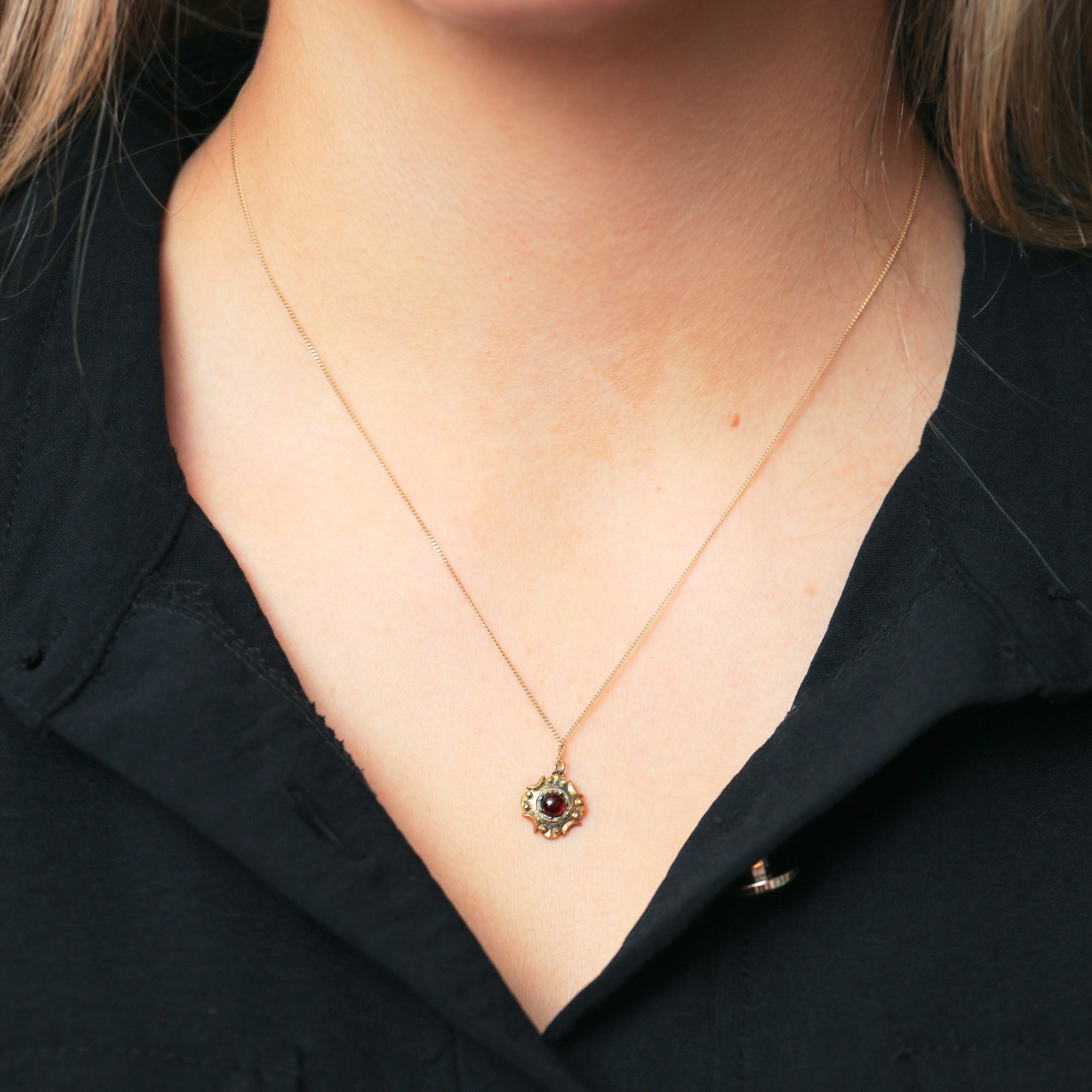In the Gothic Revival style, this weeny little piece of antiquery dates to the mid 19th century and in mood looks back to medieval times for inspiration including that seen in ecclesiastical settings. In 9ct Gold with a rich molded design around the central deepest red Pyrope Garnet. Likely once part of a larger jewel, this tiny charm still has a powerful aura... a pop of blood; a protective device associated at the time with the blood of Christ.