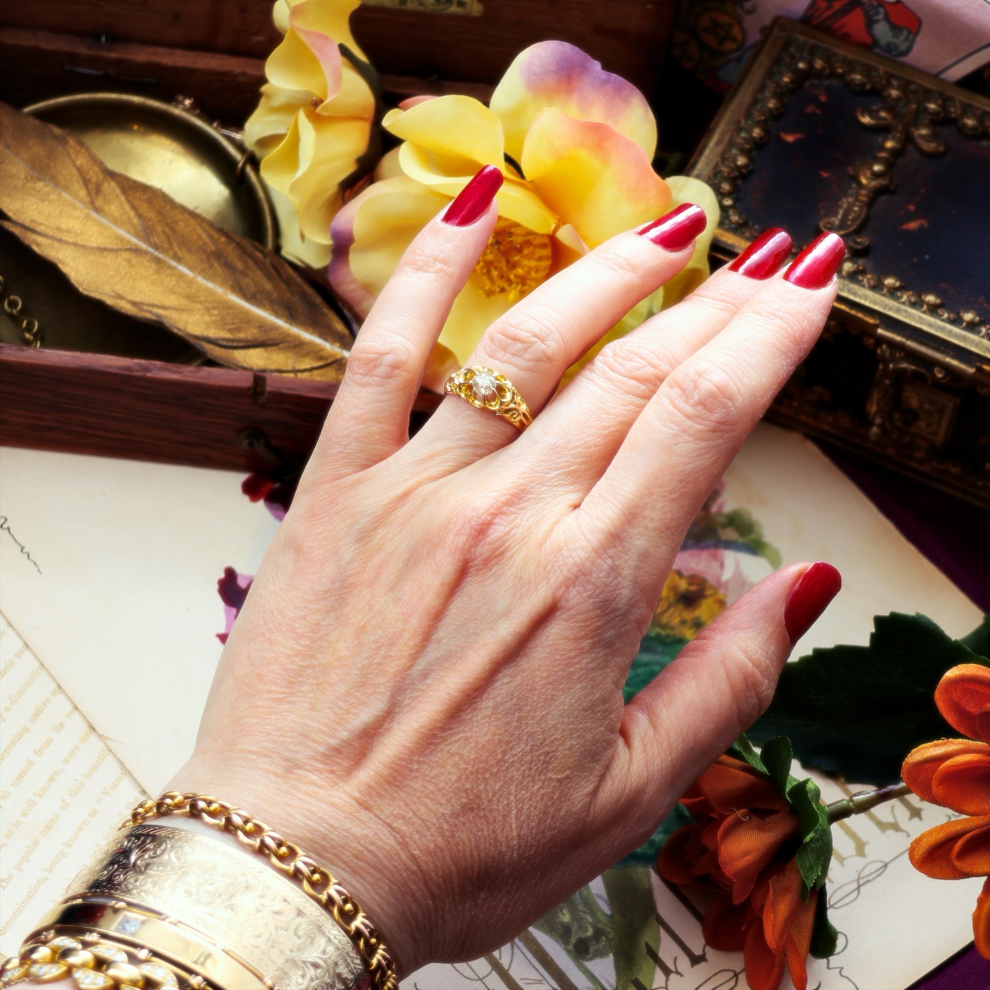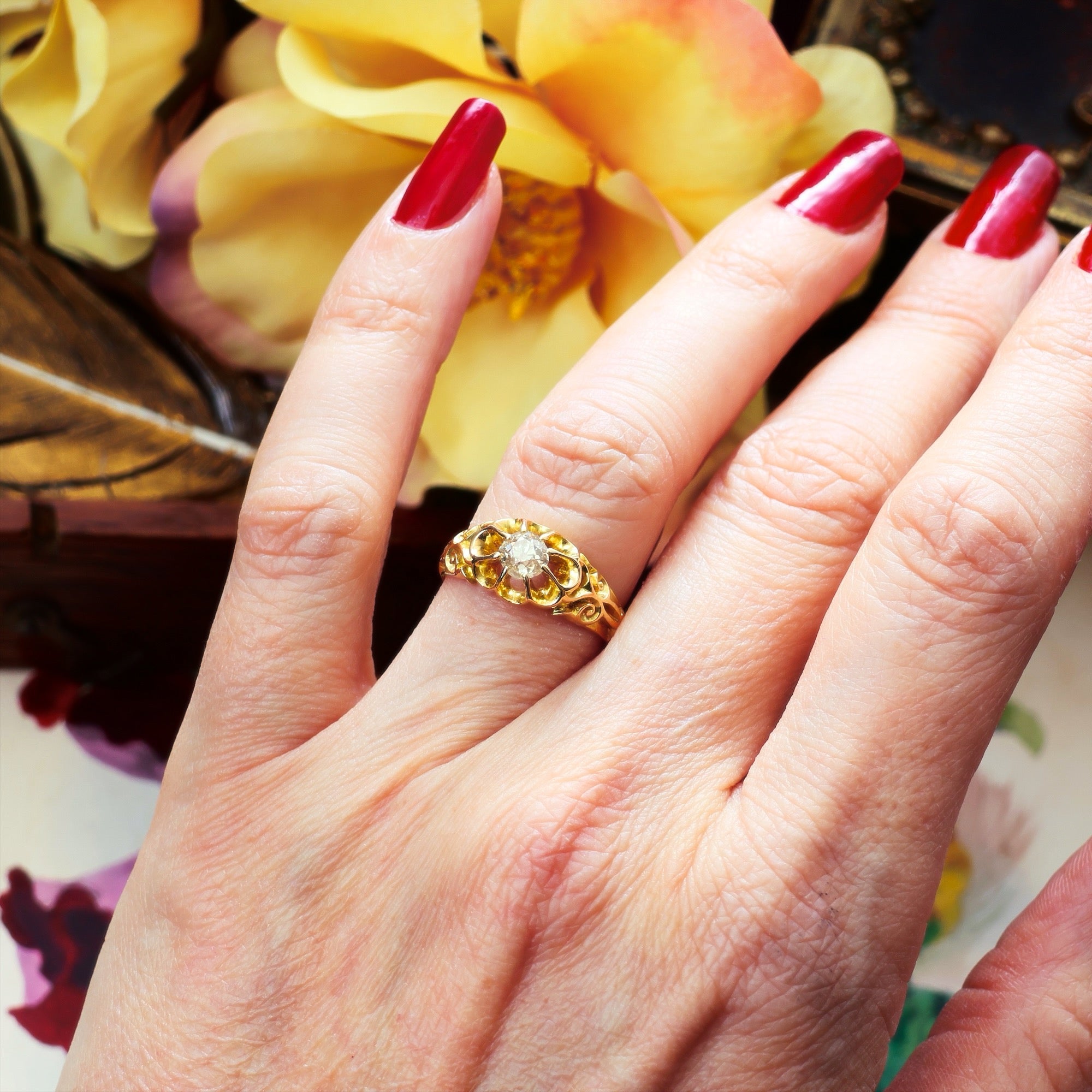 A privilege to wear: a scarce and very beautiful antique Diamond engagement ring in a Gothic Revival mood and dating to 1895. Quietly contemplative, the gentle glimmer of the olden hand cut Diamond is fascinating, and we particularly love the nod to the Medieval in the scalloped belcher setting to the gem and deeply carved shoulder ornamentation which reflects designs seen in ecclesiastical buildings.