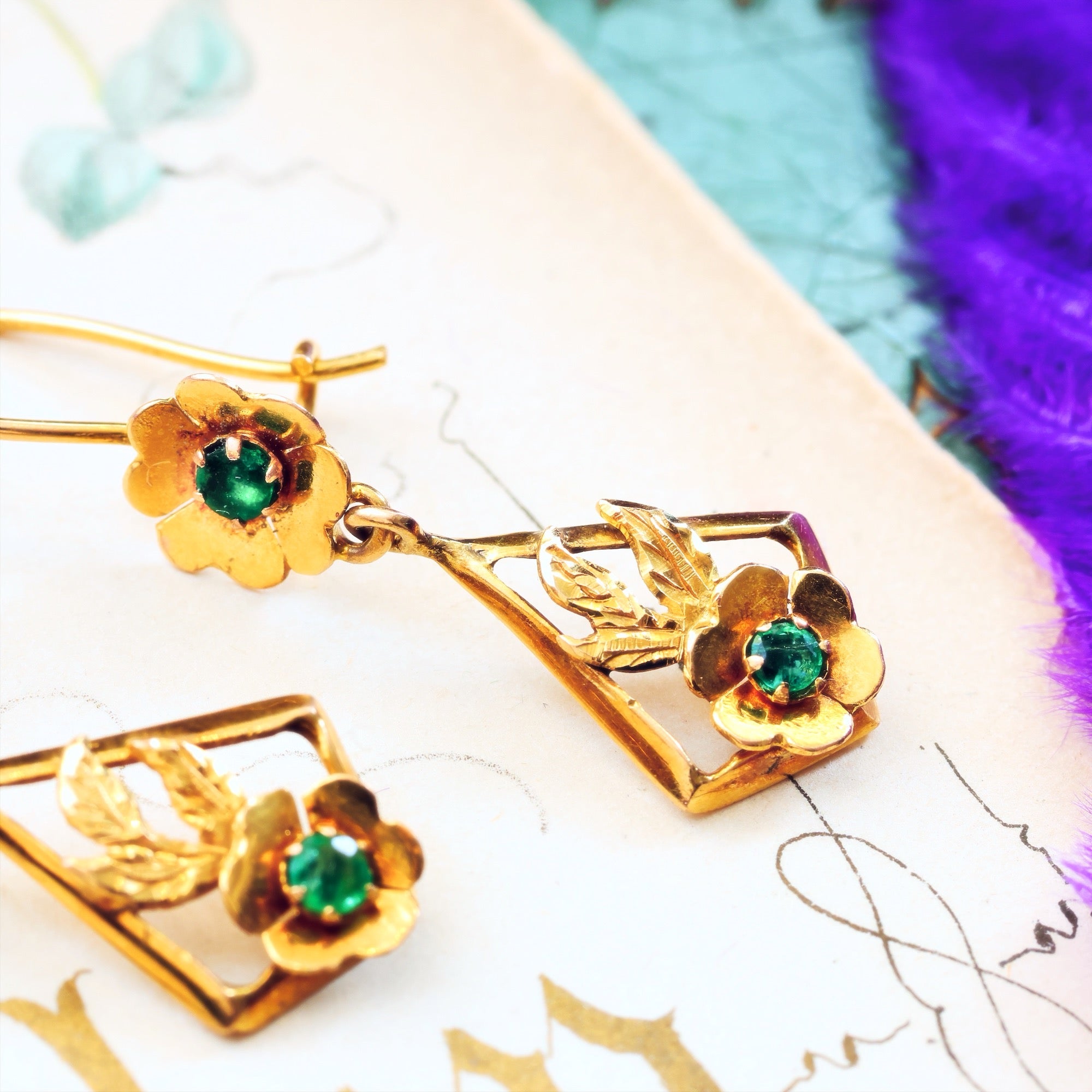 A most gorgeous pair of vintage 1940's Art Deco drop earrings in a floriate design and all hand crafted with contrasting elements in the diamondy shape to the drop which make the arrangement POP! Most likely of Continental origin, they are beautifully dangly and eye-catching, glamorously gleamed up by verdant green Emeralds; one set to each of the flowers.