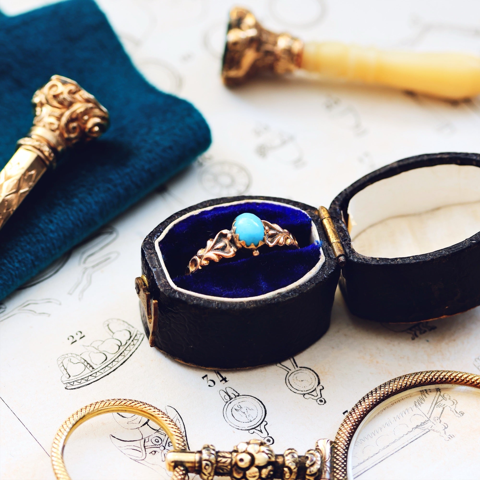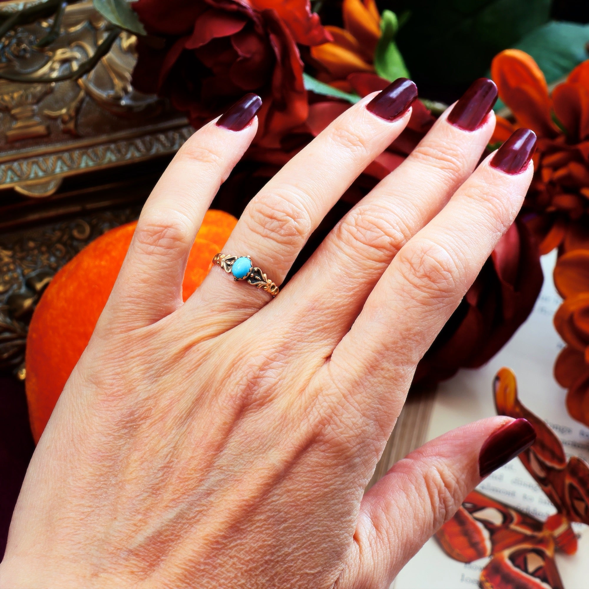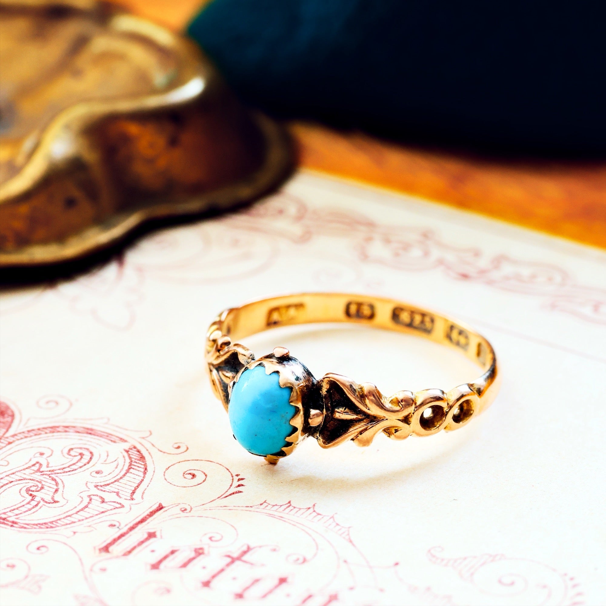 A most precious and pretty antique Persian Turquoise ring; a fine delicacy to treasure. This tiny piece of antiquery has survived remarkably down the years... we've just repolished the gem to bring back its shine. The Turquoise is of the most sought after 'Robins Egg' hue and in Victorian lore represented the Forget-me-not flower with a message of fondness of heart. With a ribboned band, all is romantic and heartfelt...