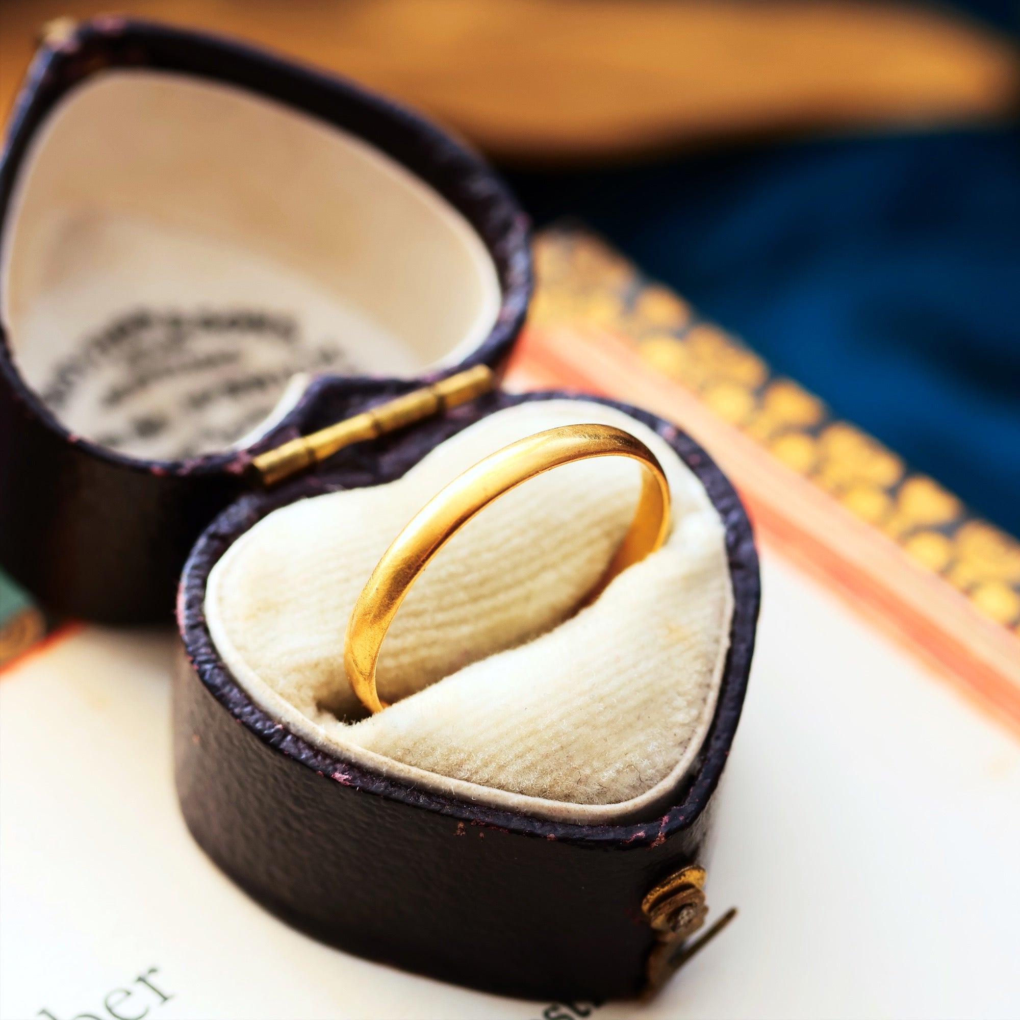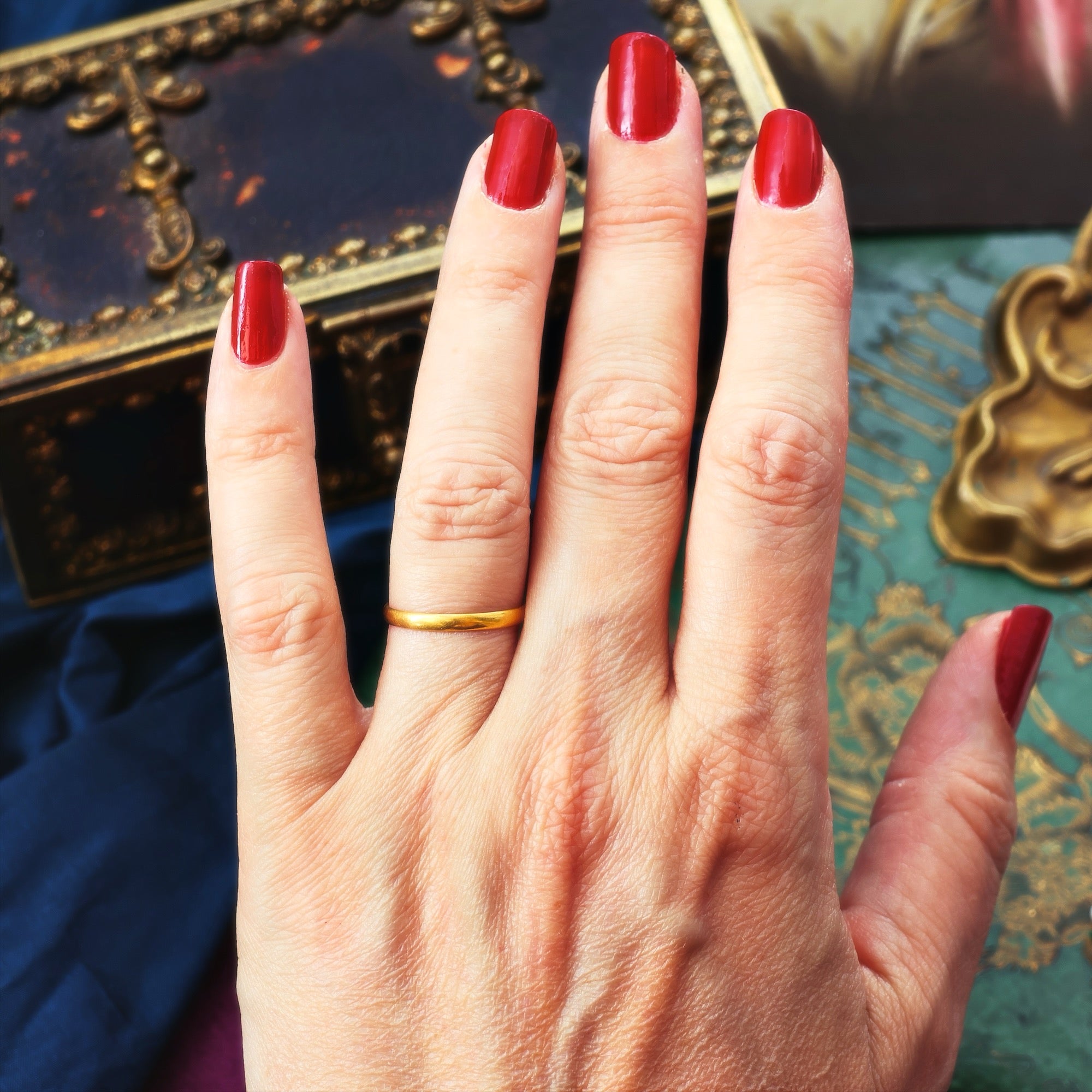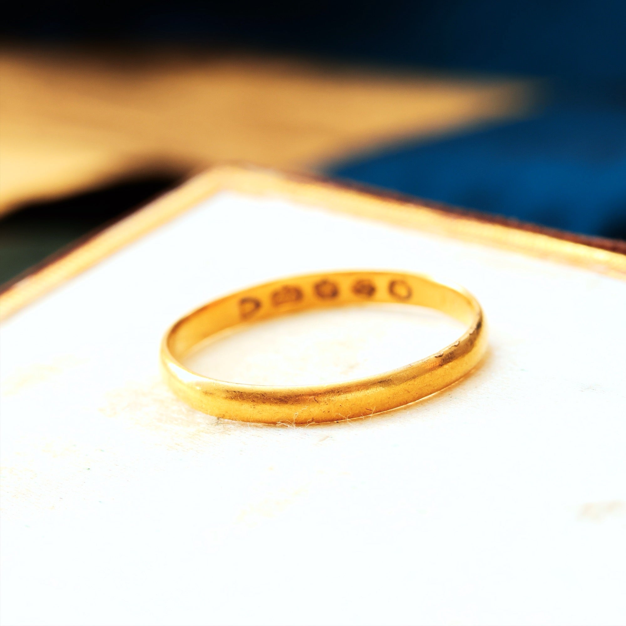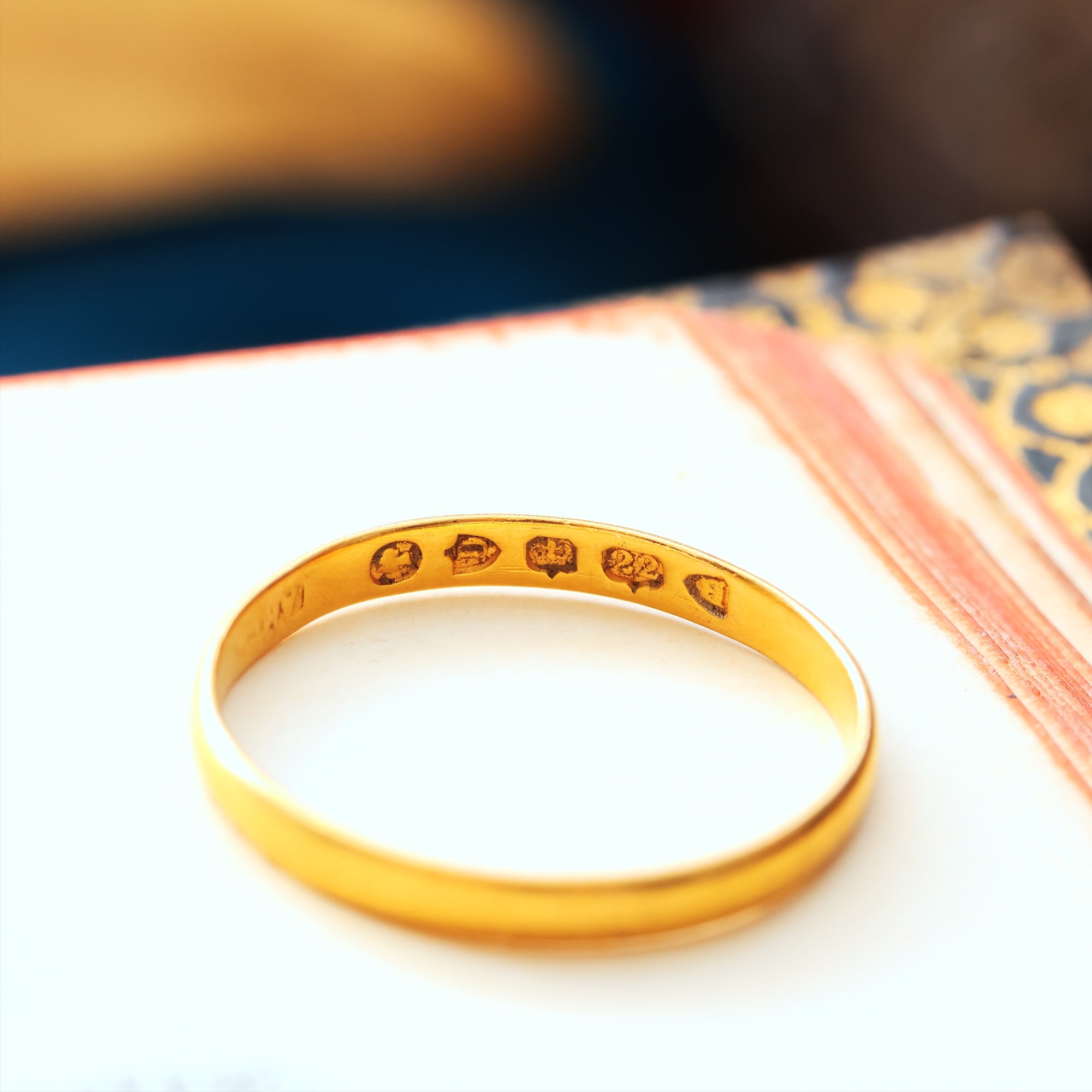 A fine and historic antique Victorian era 22ct Gold wedding ring dating to 1879 with a hallmark applied that year and showing the monarch's head. Surviving two lifetimes already, this slender ring would be a special choice to carry forward into a new story.