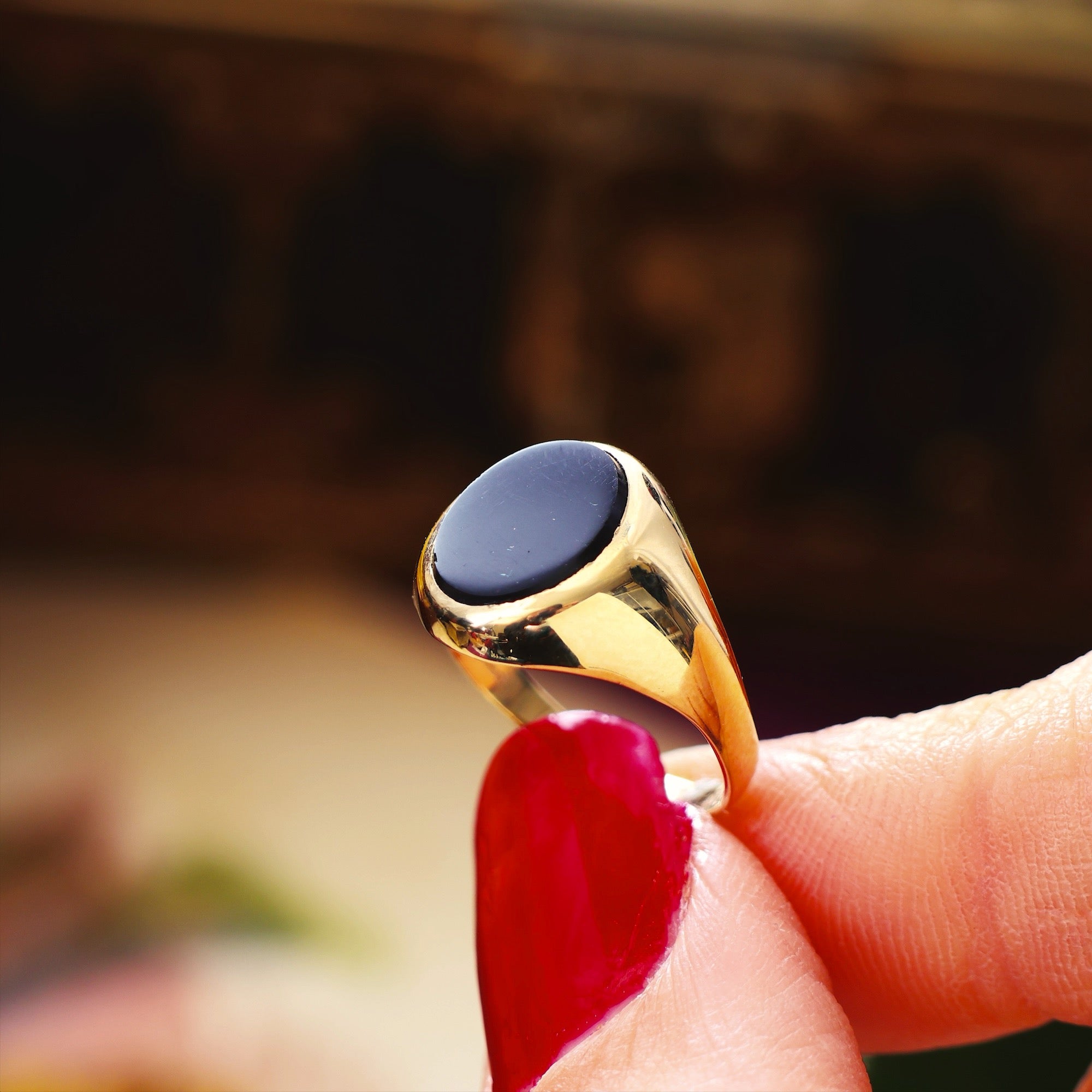 A cute little 9ct Gold signet ring, the perfect finger trim for a pinky as the oval shape of the classic Black Onyx is so flattering to the hand. With a streamlined gleam to the shoulders all is very pleasing to the eye.