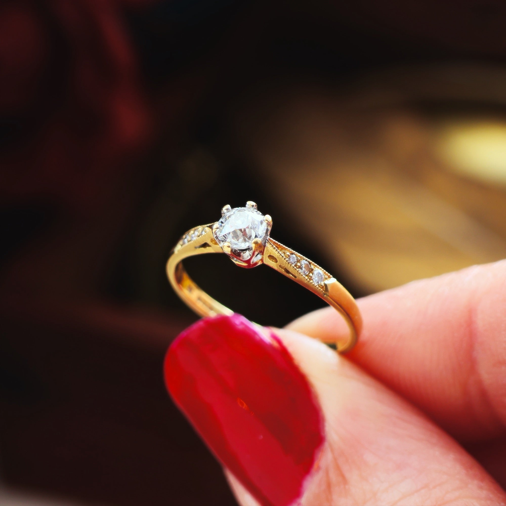 A very sweet and lovely vintage Diamond engagement ring dating to the 1980's or so and which was created to show off a unique and very special antique hand cut Diamond. This ring caught our eye primarily because of the brightness of the Diamond, and then on closer inspection we could see that this was a recycled stone dating to around the 1890's. Just our kind of thing! The gem was faceted by the skilled hand of an artisan in the Old European way with larger facets than you'll commonly see nowadays and an immensely twinkly glitter!