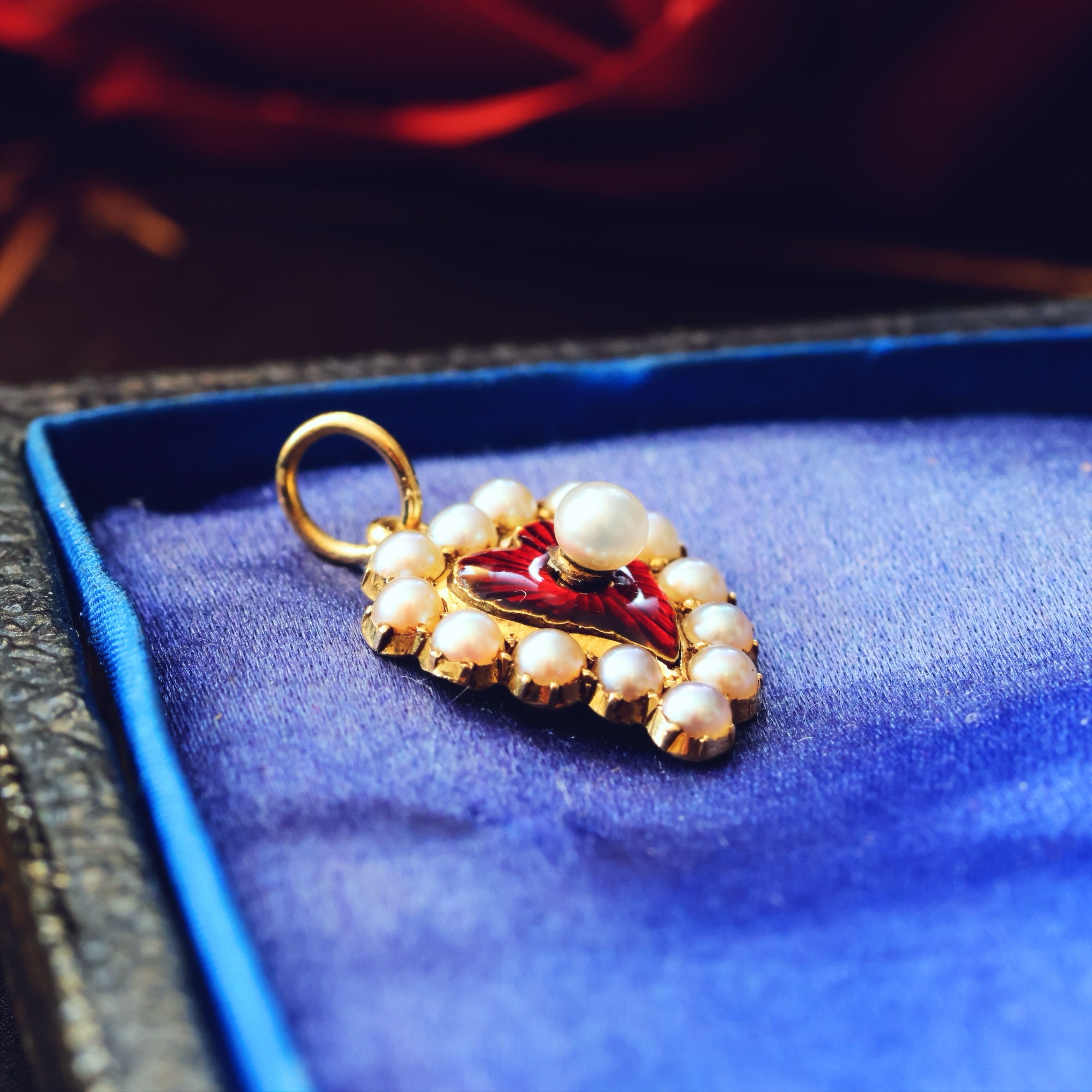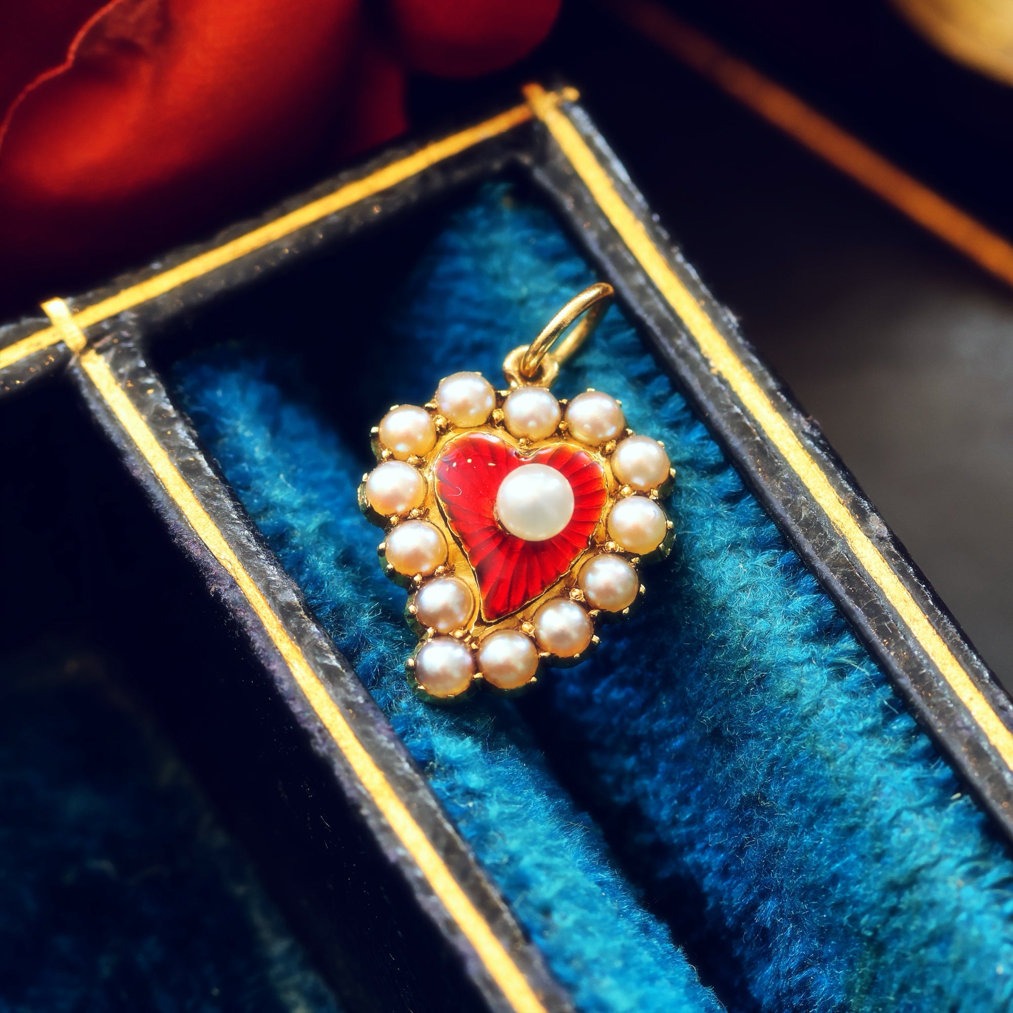 A miniature love token dating to the mid 19th century and in the Georgian style designed to capture the magick spell of LOVE. The so-called 'witches' heart has a little flick to the left and as a gift denotes that the giver of the love token is 'bewitched.' Crafted with such neatness and precision, the miniature Pearls are all natural and the charm of the blood red Guilloche enamel adds a touch of emotion.