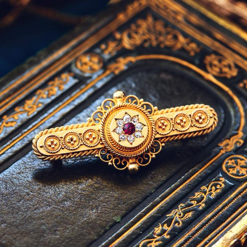 Antique Estruscan Inspired Ruby & Diamond Brooch in Original Case