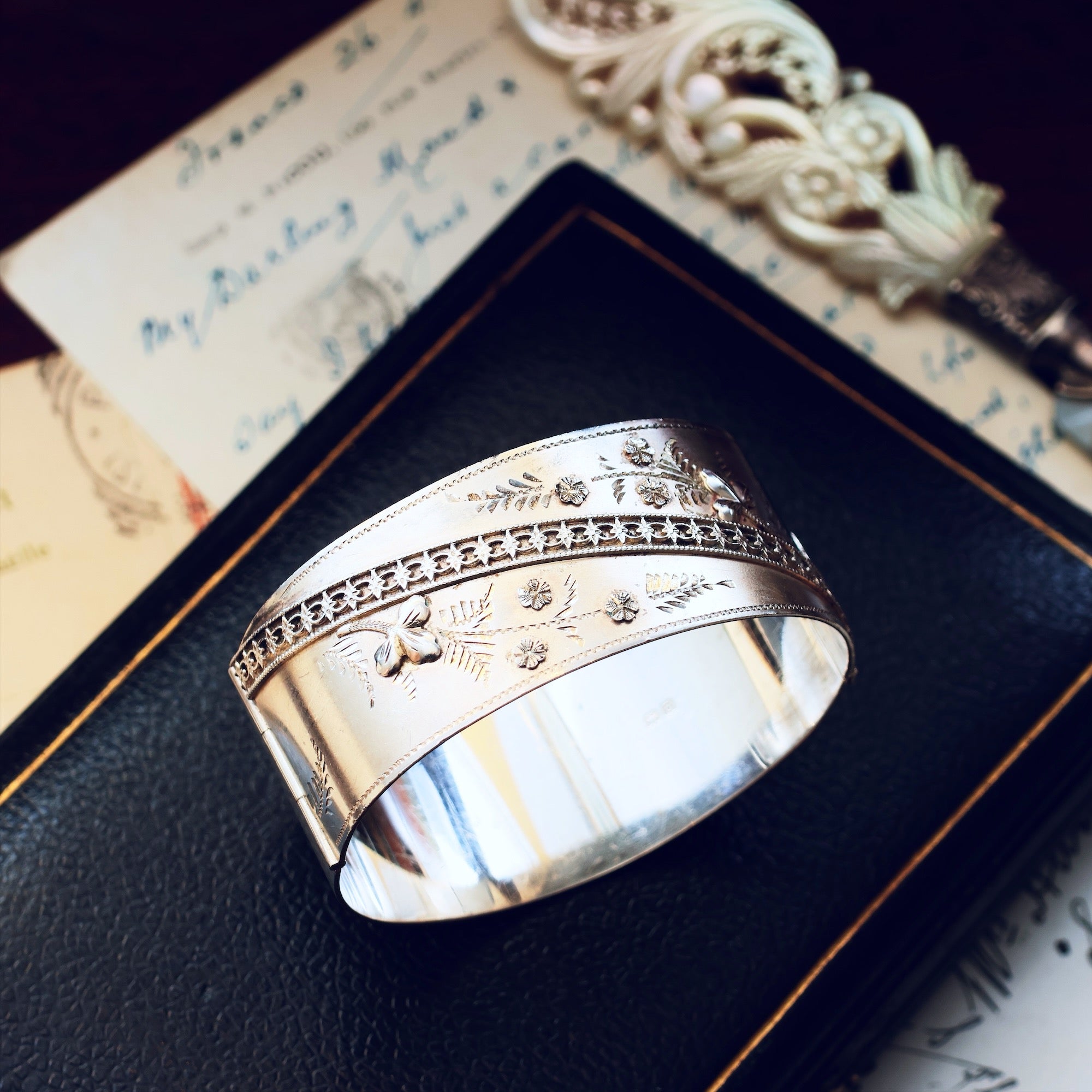 A romantically inclined antique Silver bangle dating to 1913, but in a style popular some time earlier, in the 1880's. Opening at the side with a clever tension arrangement, the front part is mattified and lavishly decorated with ferns and daisies both hand engraved and applied; a very special prettiness which would make it worthy of a gift for a significant occasion.
