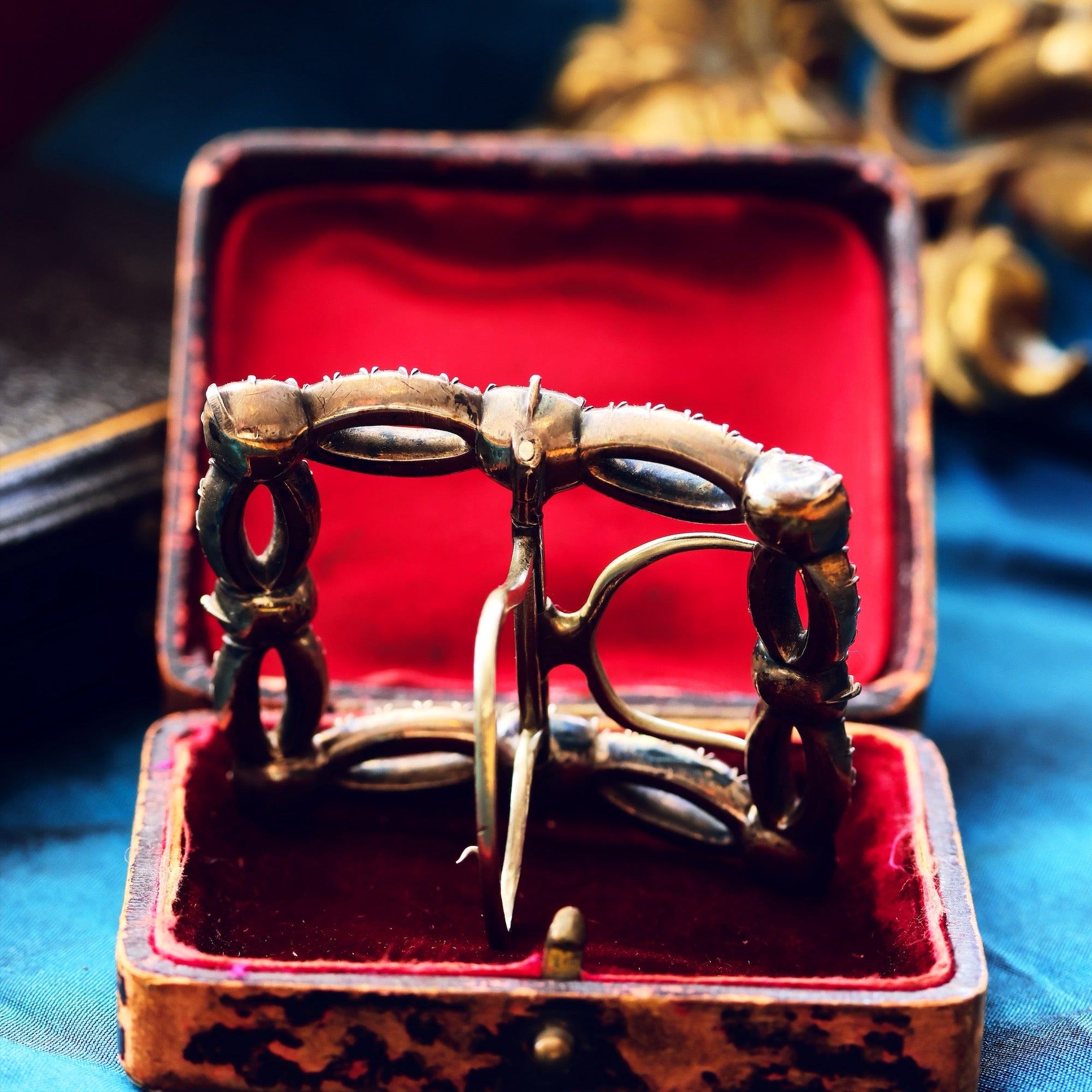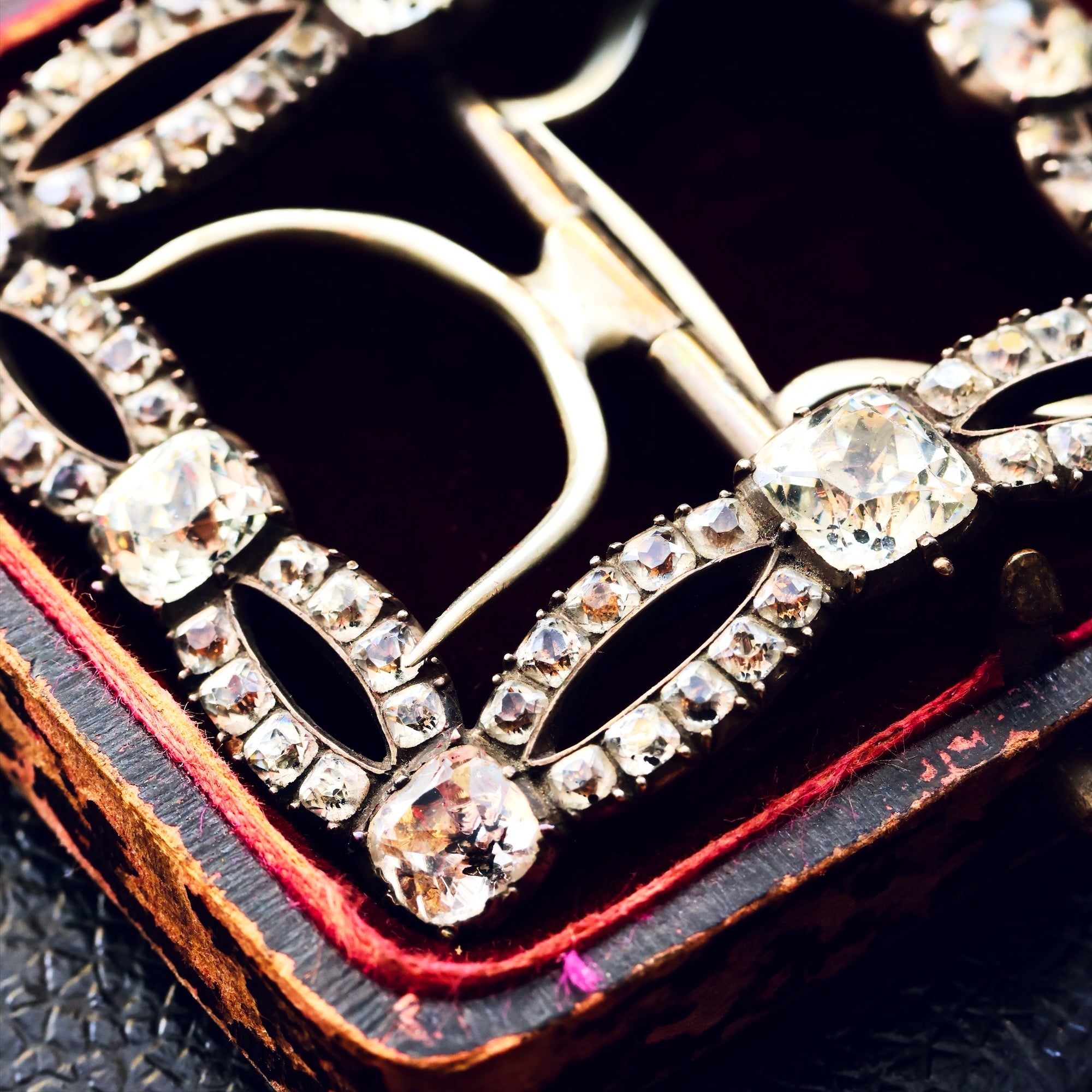 The MOST splendid and audacious antique Silver and Paste Georgian era buckle! Hailing from a world of candlelit balls and high hair, this jewels is one of what would have been a pair of glamorous shoe buckles. This would make a wonderful and unique addition to your wedding outfit, on a sash at the waist or holding a ribbon or ruffle at the bosom. The whole is in quality Silver and is set in the Georgian style with foil backed hand cut Paste gems; so much craft in it's creation! It would be wonderful if this old jewel could find it's way to a new love.
